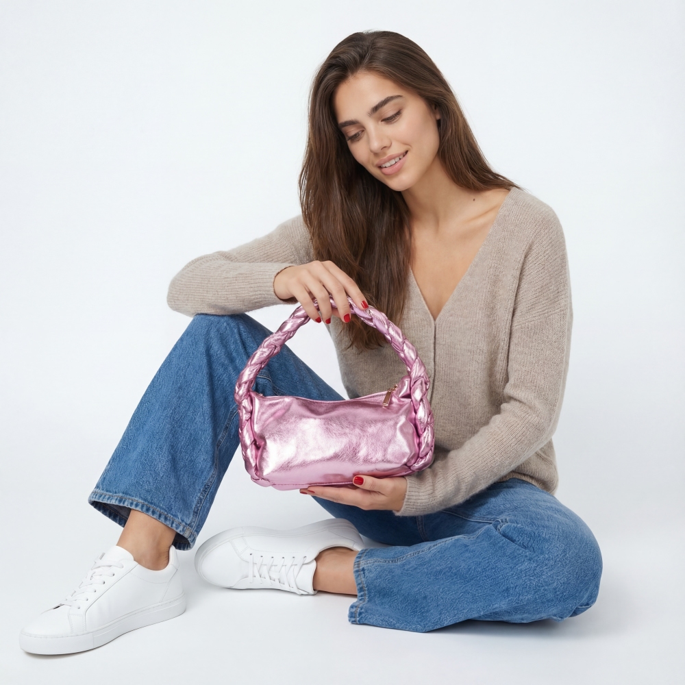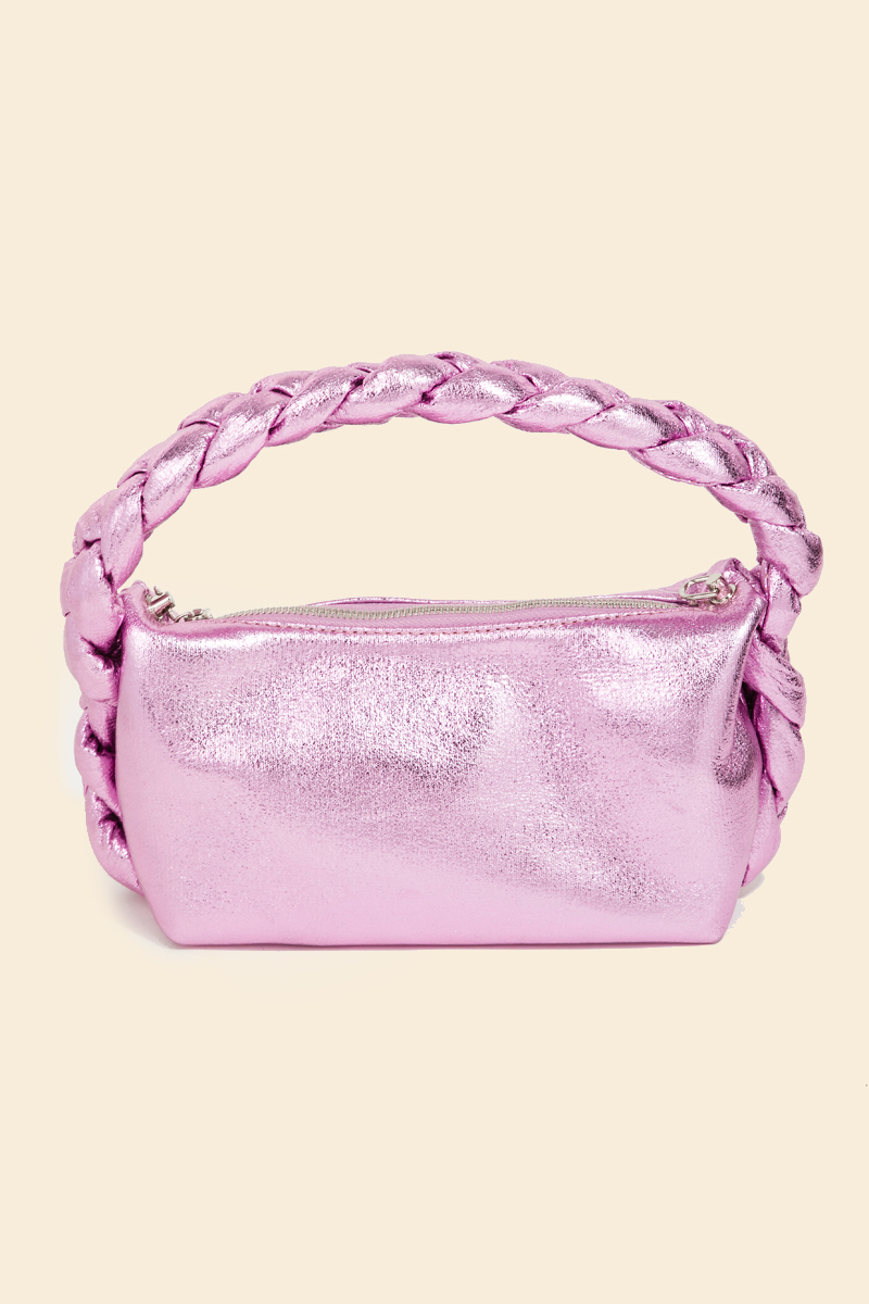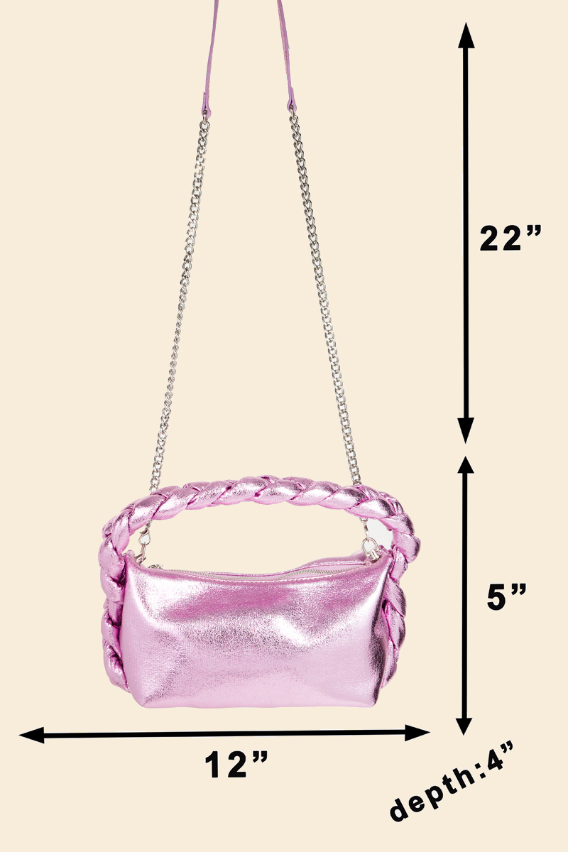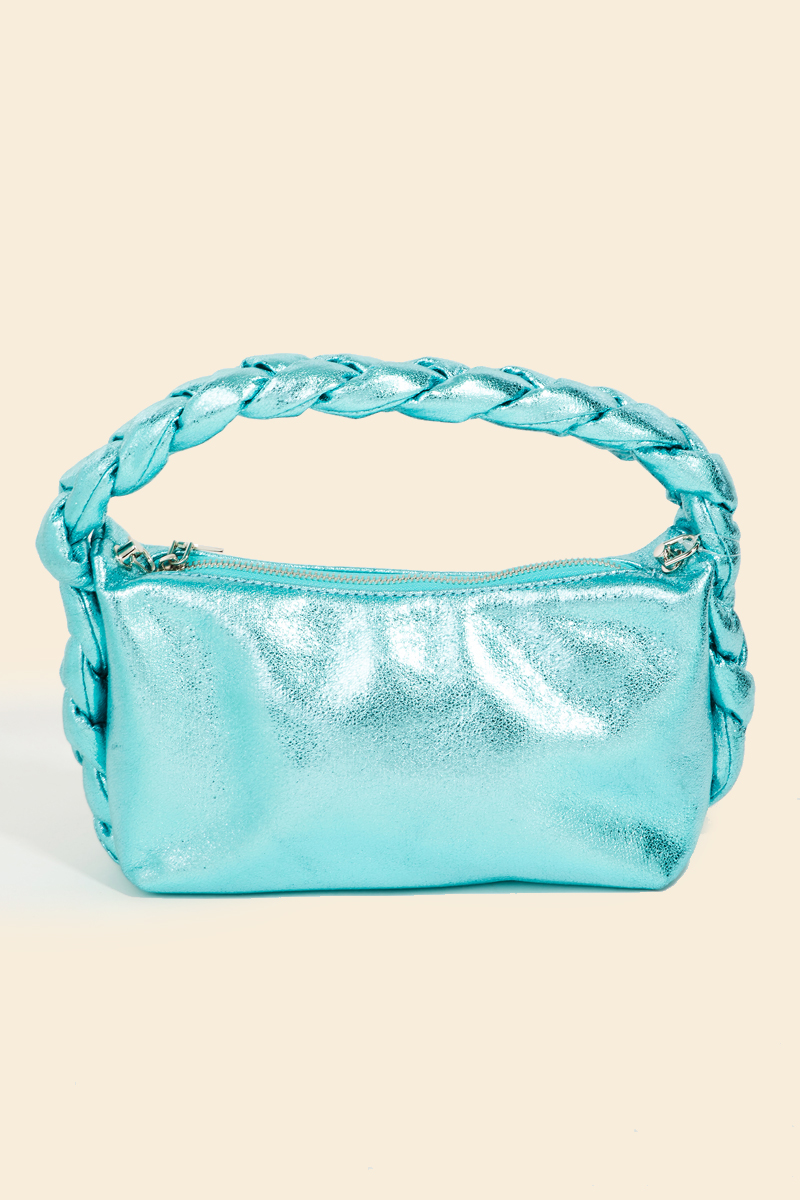 Perfectly polished and endlessly versatile, this bag features a distinct glossy rectangle top handle braid hand design. Embrace fashion flexibility with this versatile accessory, designed to effortlessly enhance the sophistication of any outfit. Available in BL, DBL, LBL, PK and S. This item is sold in packs of 1.