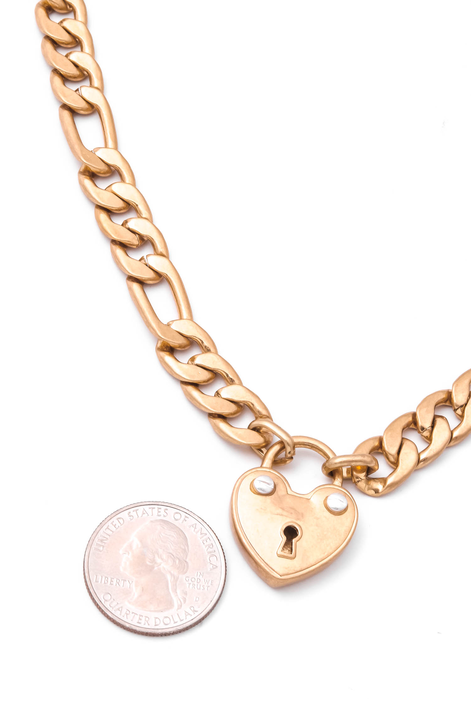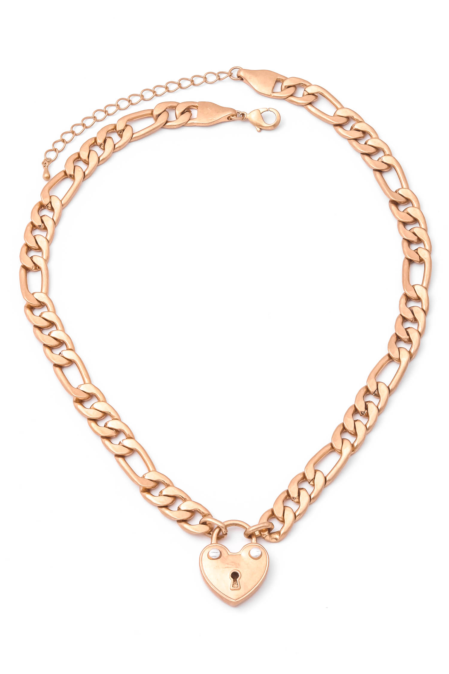 A perfect in season must have necklace that has a beautiful heart lock charm curb chain necklace design. This is the perfect gift for a special someone. Available in Wg.
