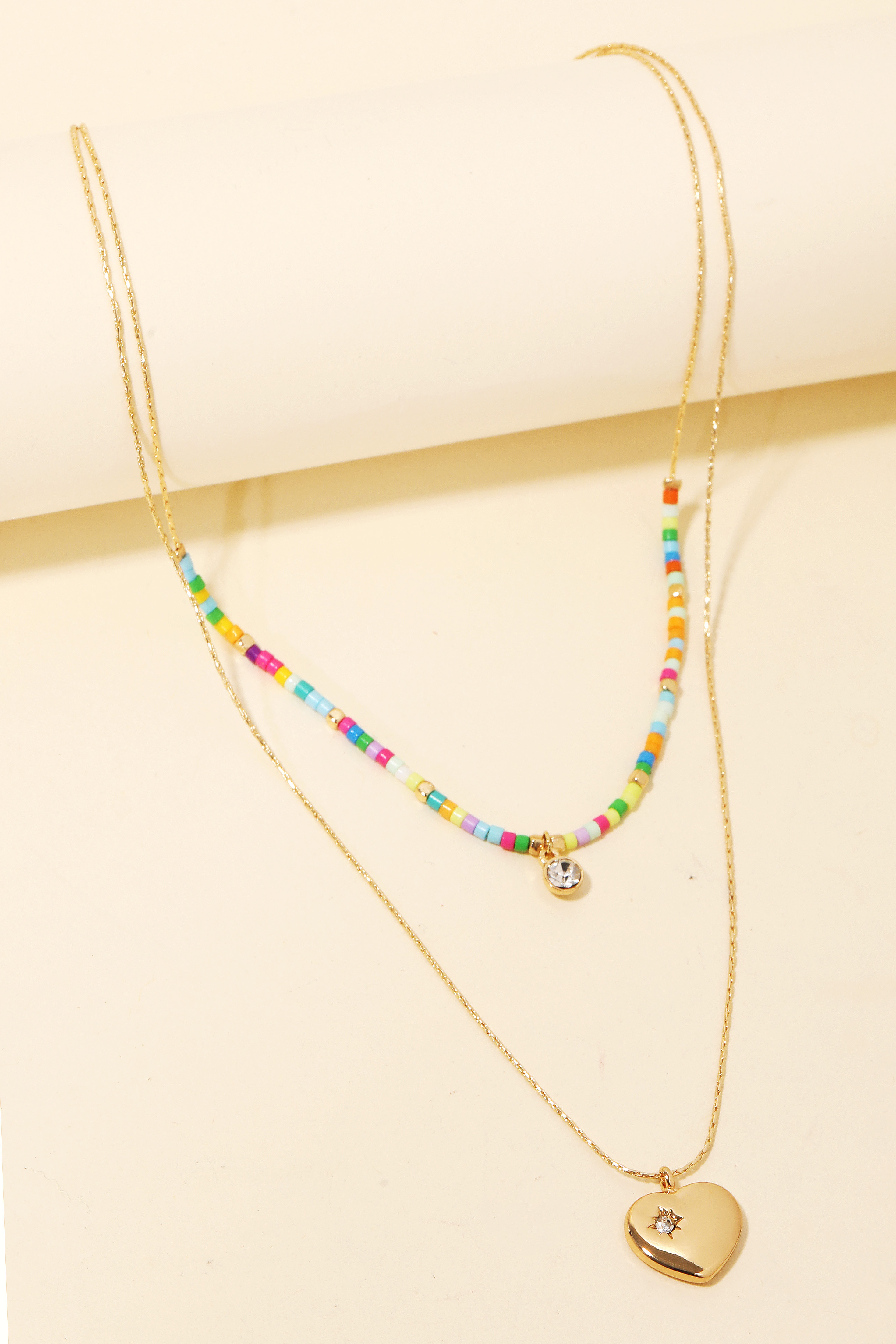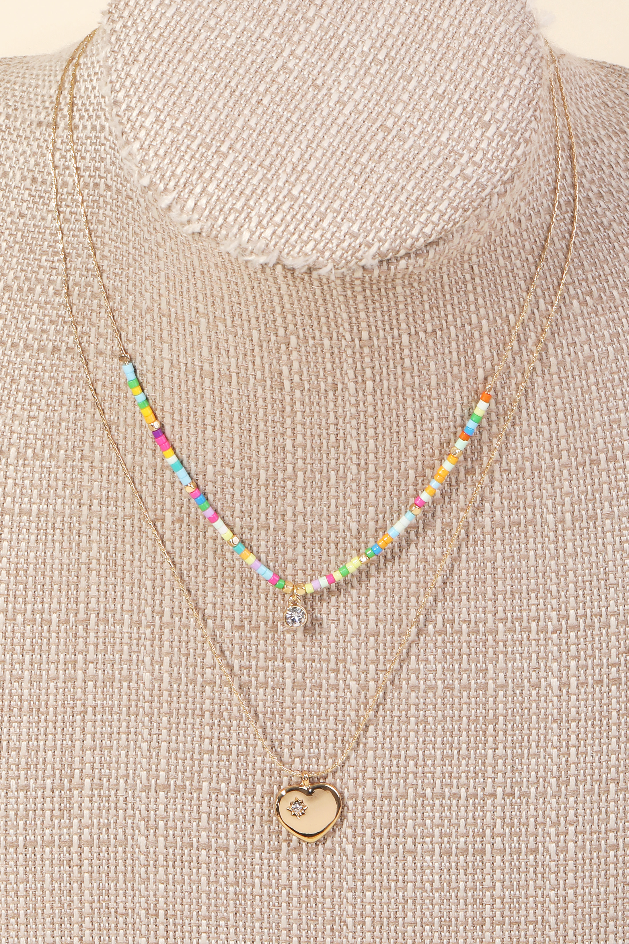 • This piece is the epitome of sophistication and elegance, this layered necklace comes with a special heart and gem charms design. It also includes colorful seed beaded necklace chain. Perfect for dressing up or down, this versatile accessory adds a touch of sophistication to any look. Available in VMUG. This item is sold in packs of 1.