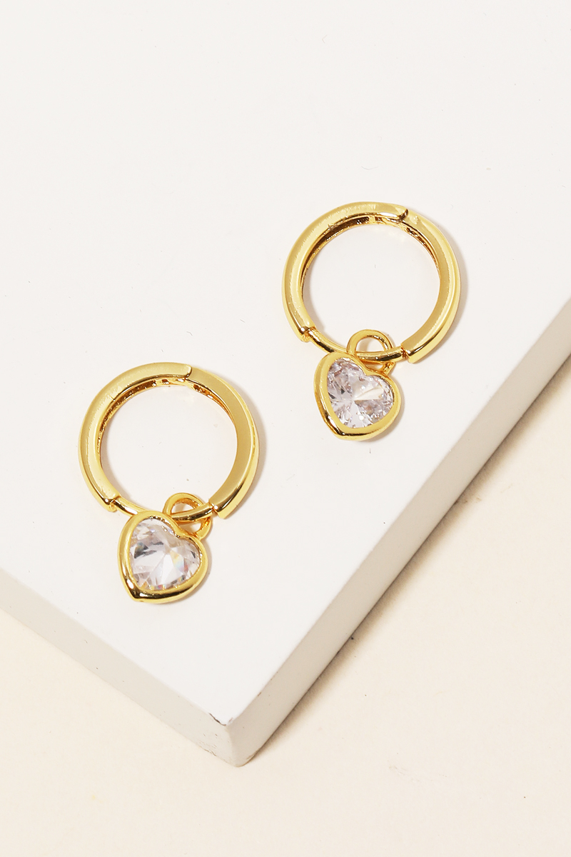 • Hot chic and trending in season must have pair of hoop earrings that features a mini heart drop hoop earrings design. Perfect for this season! Available in G.