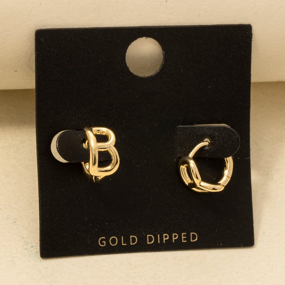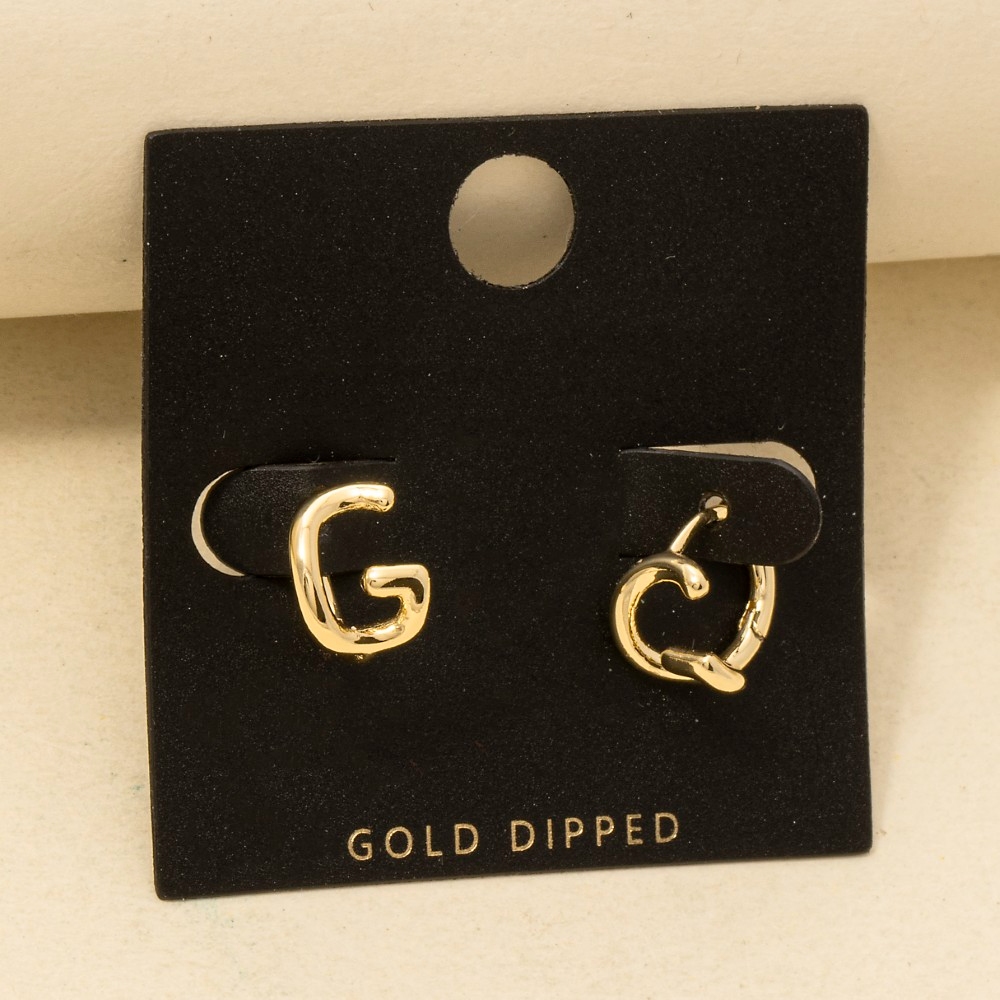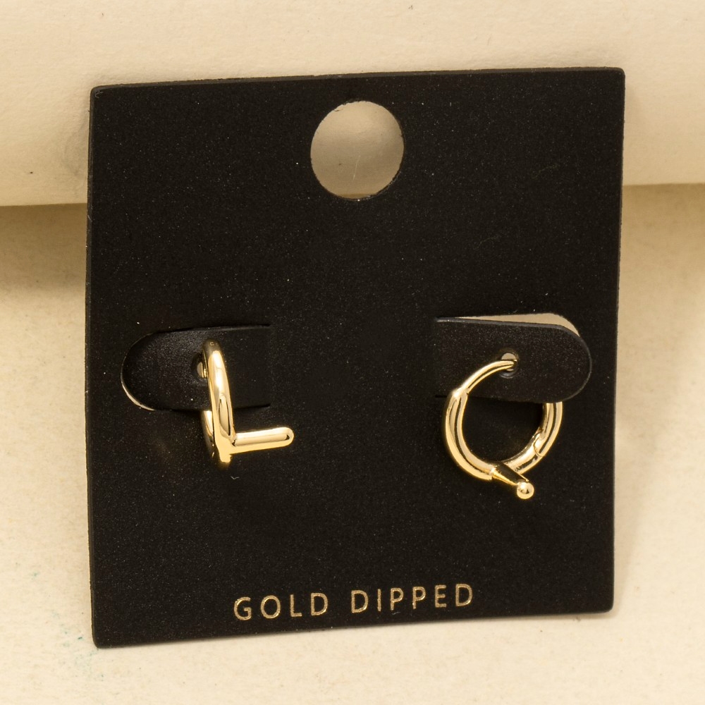 • Perfect for any fashion-forward individual, this pair of columbus jewelry hoop earrings presents a striking gold dipped mini initial letter design. This item is ideal for those who want to add some personality to their wardrobe without being too bold. Available in A, B, C, D, G, H, J, K, L, M, N, R, S, T. This item is sold in packs of 1.