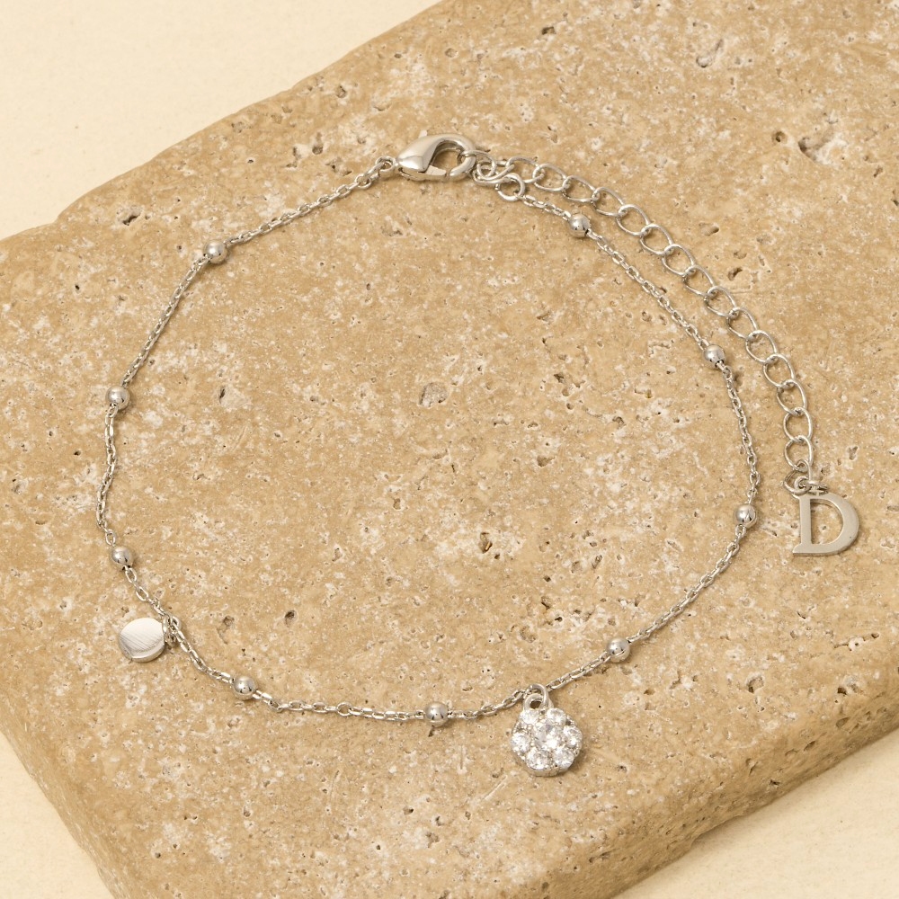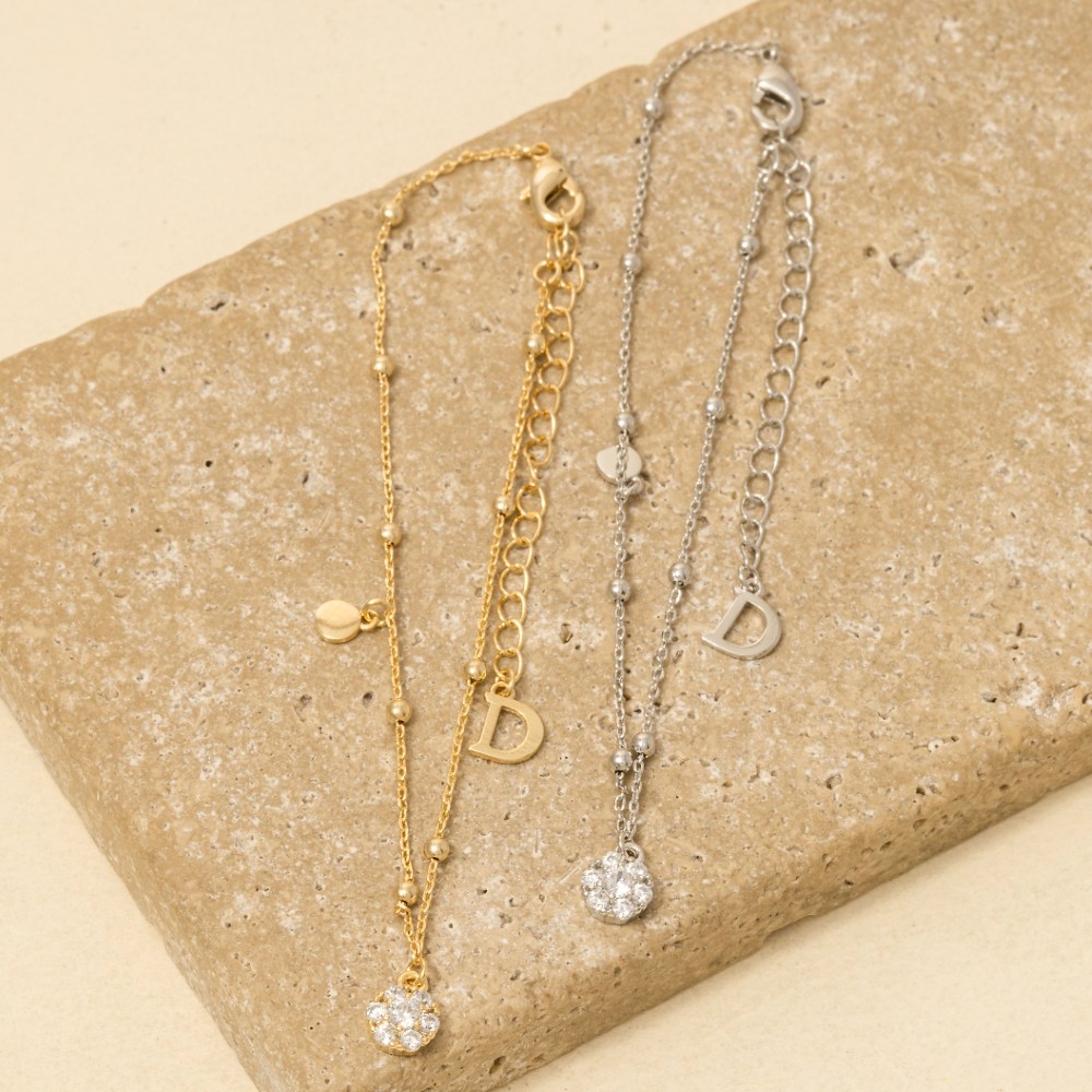 • A versatile and stylish addition to any wardrobe, this chain bracelet features a distinct letter d and cubic zirconia flower coin charm design. Achieve a perfect blend of style and sophistication with this versatile chain bracelet, a fashion-forward choice for any occasion. Available in G, S. This item is sold in packs of 1.