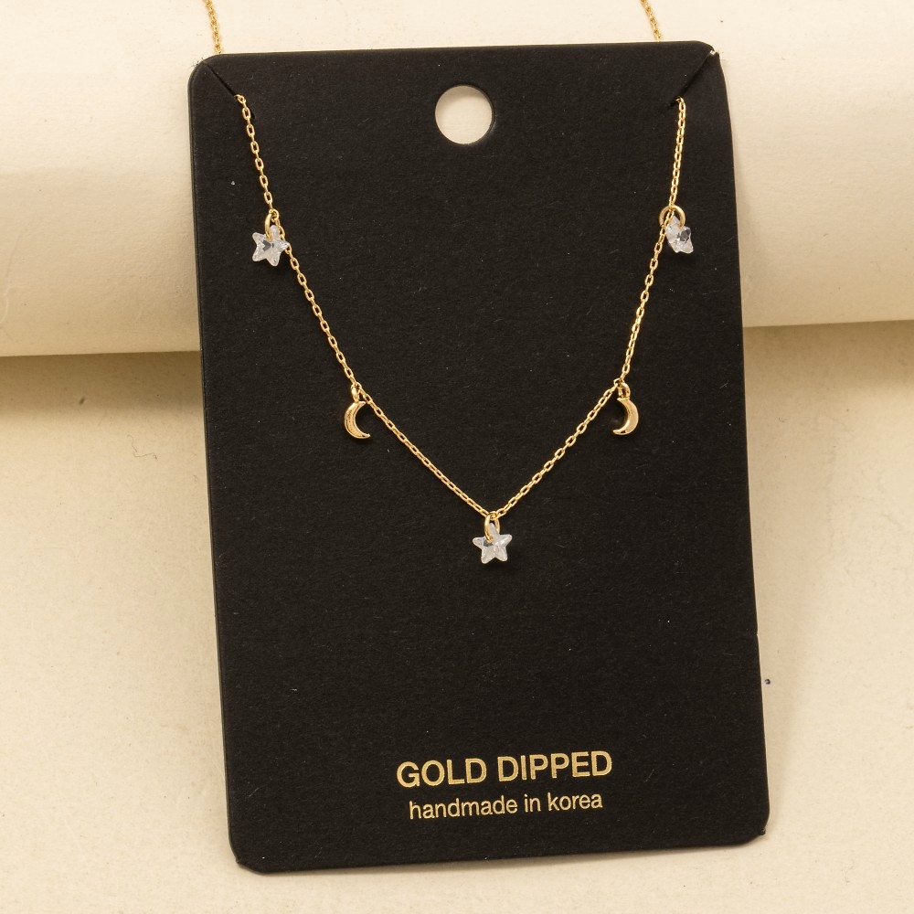 Gold Dipped Cz Pave Stars Moon Station Charms Necklace