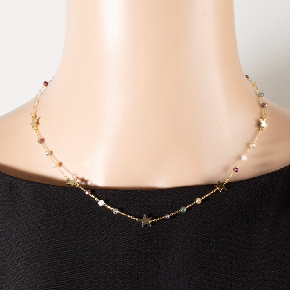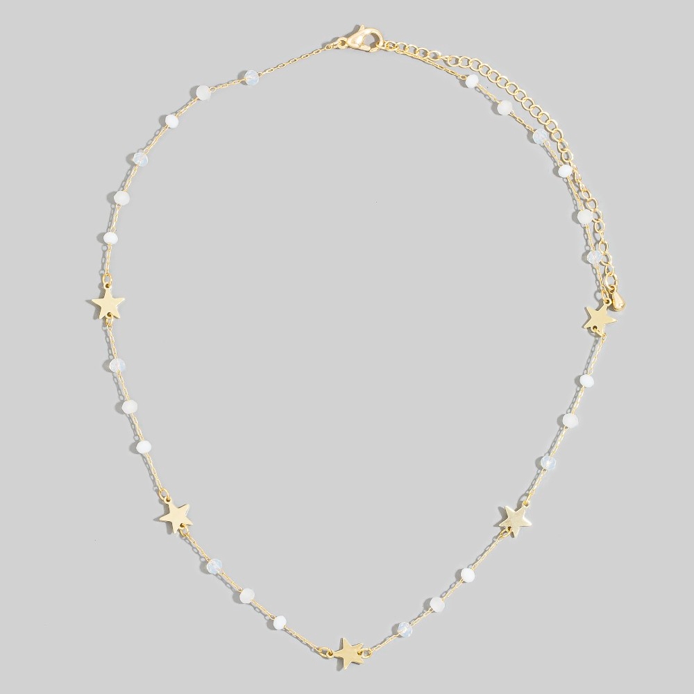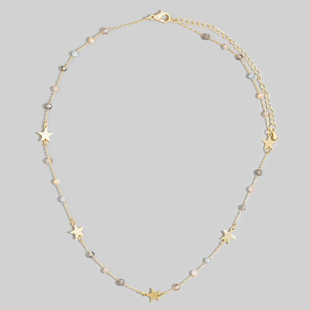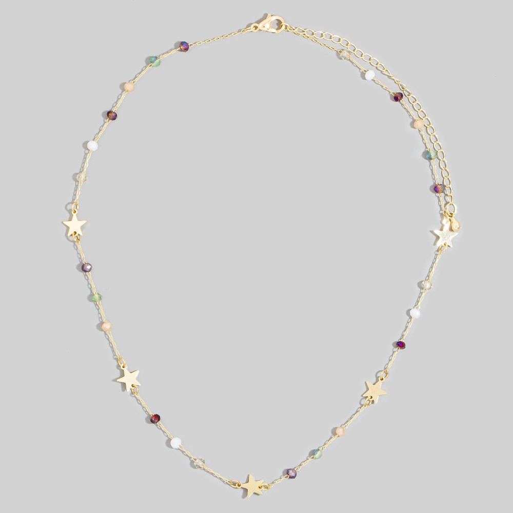 Add a touch of elegance and glamour to your look, this necklace showcases an alluring gold star charm beaded chain choker design. This necklace is the perfect way to add a touch of elegance to any outfit. Available in GDMGY, GDMU, GDMWH. This item is sold in packs of 1.