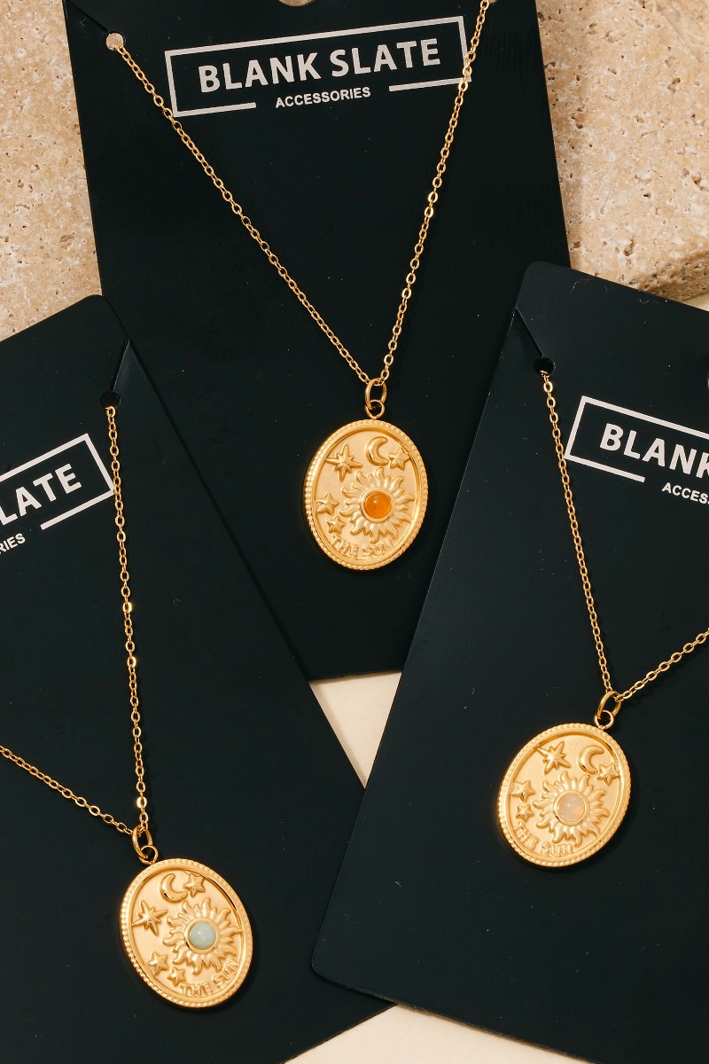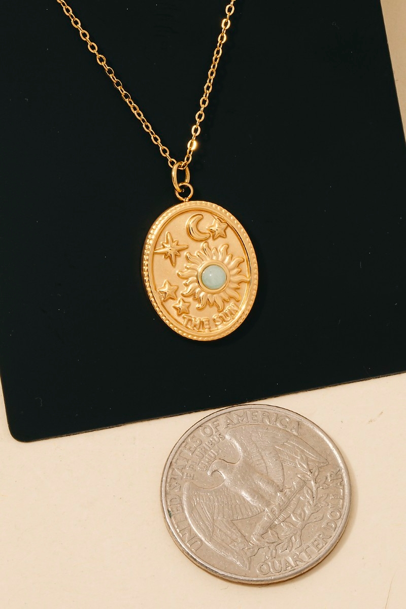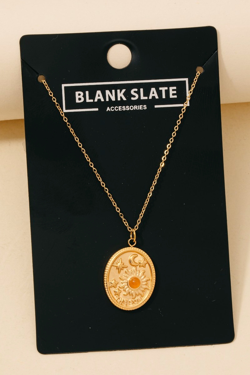 A bold and daring choice that is sure to impress, this necklace shows off a distinctive stainless steel sun moon and stars oval pendant design. Achieve a perfect blend of style and sophistication with this versatile necklace, a fashion-forward choice for any occasion. Available in BL, IV, RD. This item is sold in packs of 1.