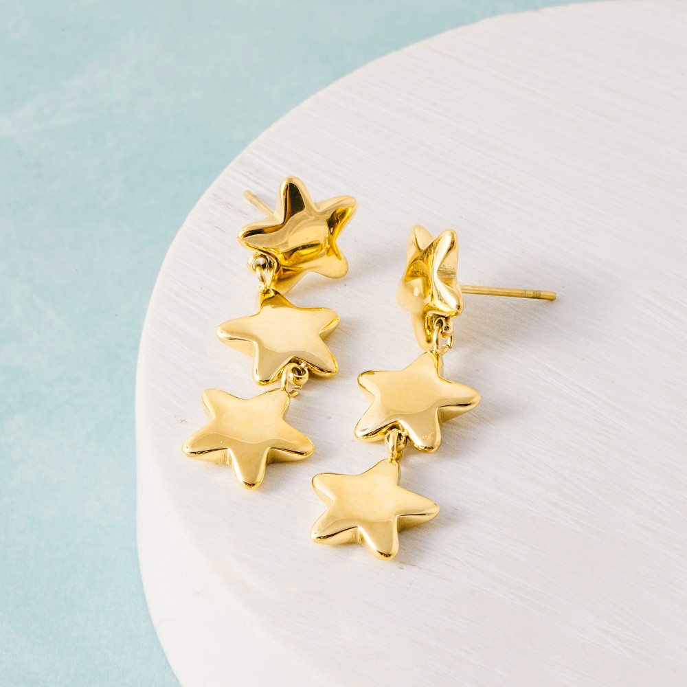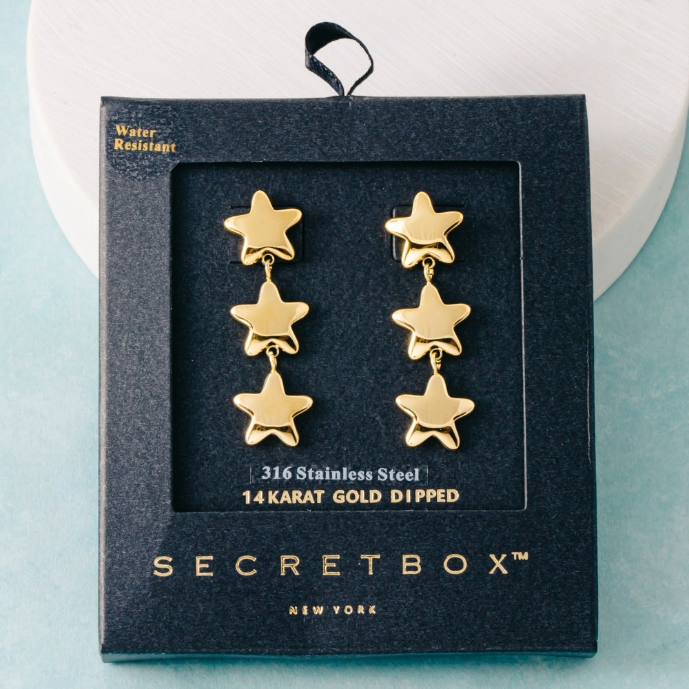 • This piece is designed to be both stylish and functional, this pair of dangle earrings flaunts a luxurious secret box gold dipped stainless steel star chain design. Achieve a perfect blend of style and sophistication with this versatile pair of dangle earrings, a fashion-forward choice for any occasion. Available in GD. This item is sold in packs of 1.