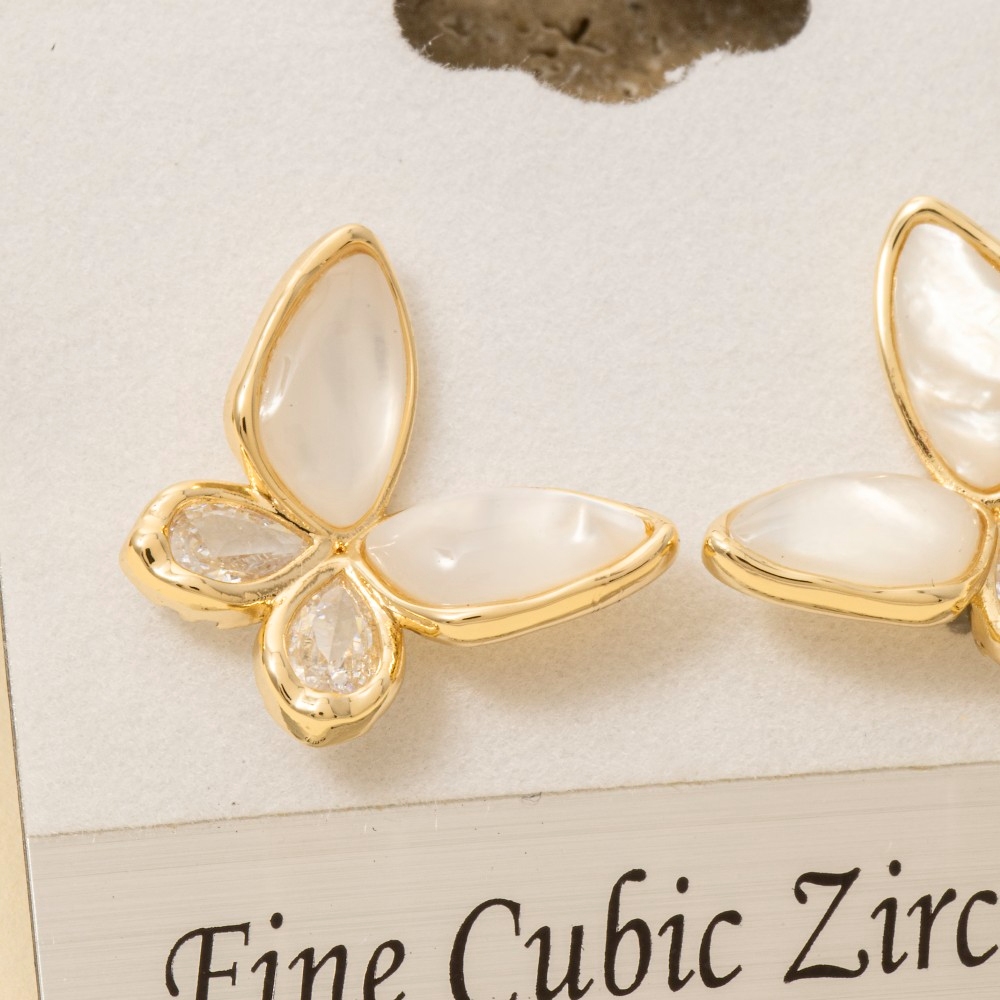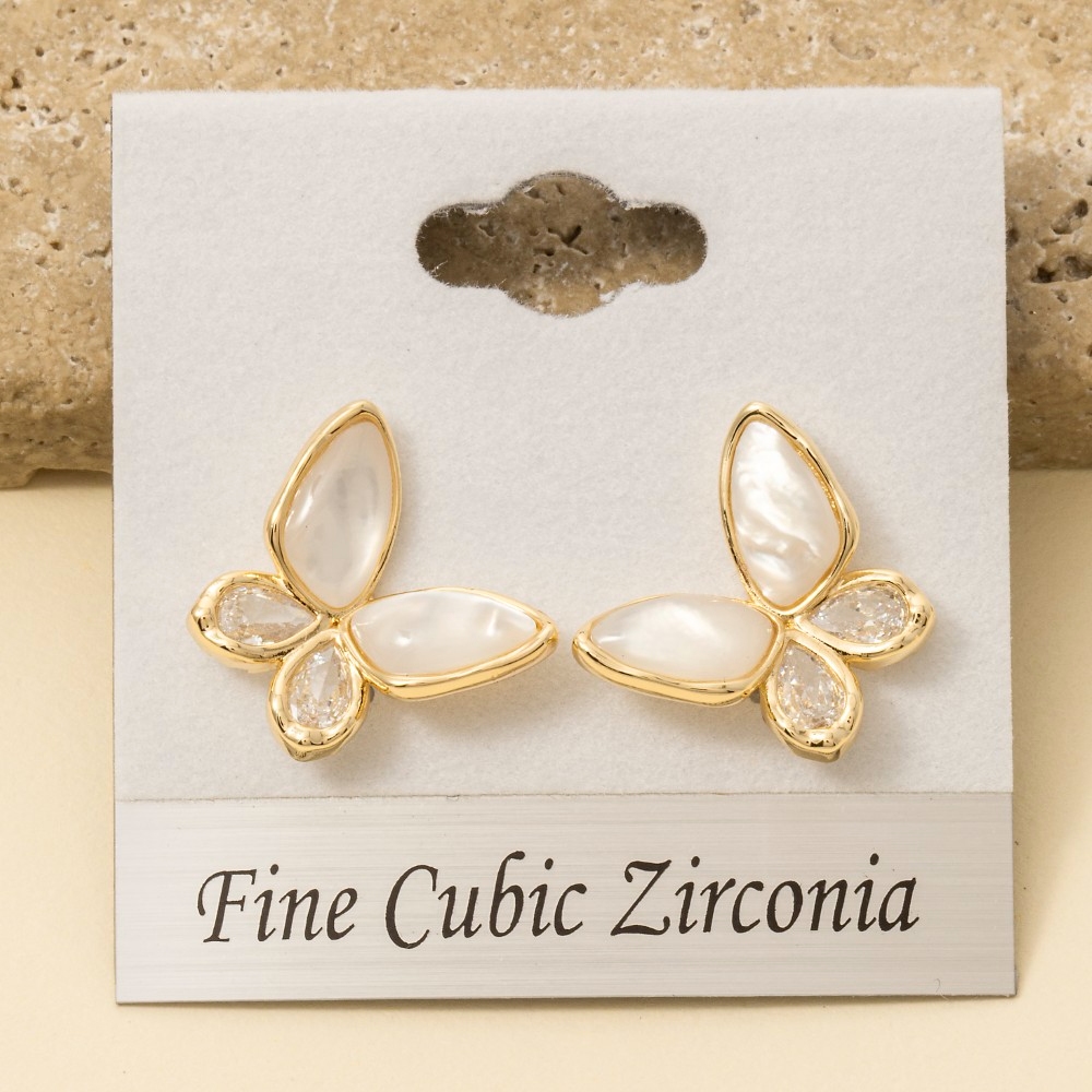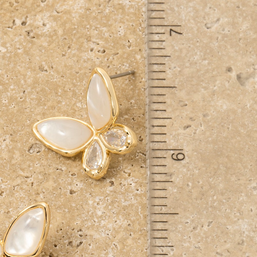 • This piece is designed to make a statement, this pair of stud earrings incorporates a flawless gold plated mop and cubic zirconia butterfly design. Unlock endless styling possibilities with this versatile pair of stud earrings, creating a signature look that speaks volumes. Available in GDCL. This item is sold in packs of 1.