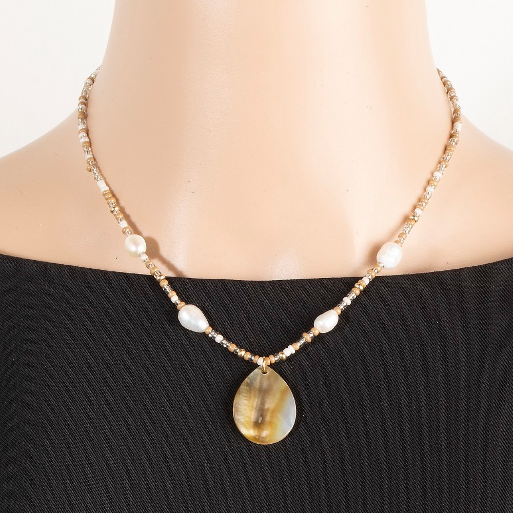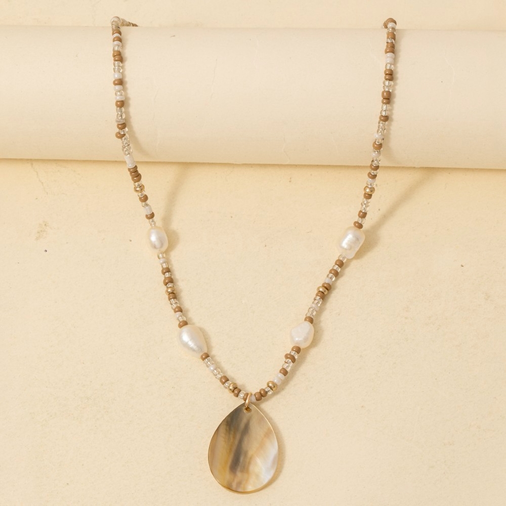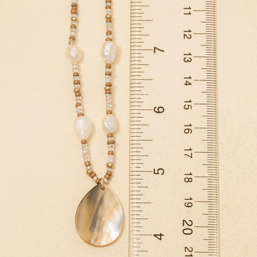 Elevate your style with something unique and daring, this necklace encompasses a grand mother of pearl tear pendant mixed beaded design. Perfect for adding some texture and dimension to any outfit, this necklace is a must-have. Available in BR. This item is sold in packs of 1.