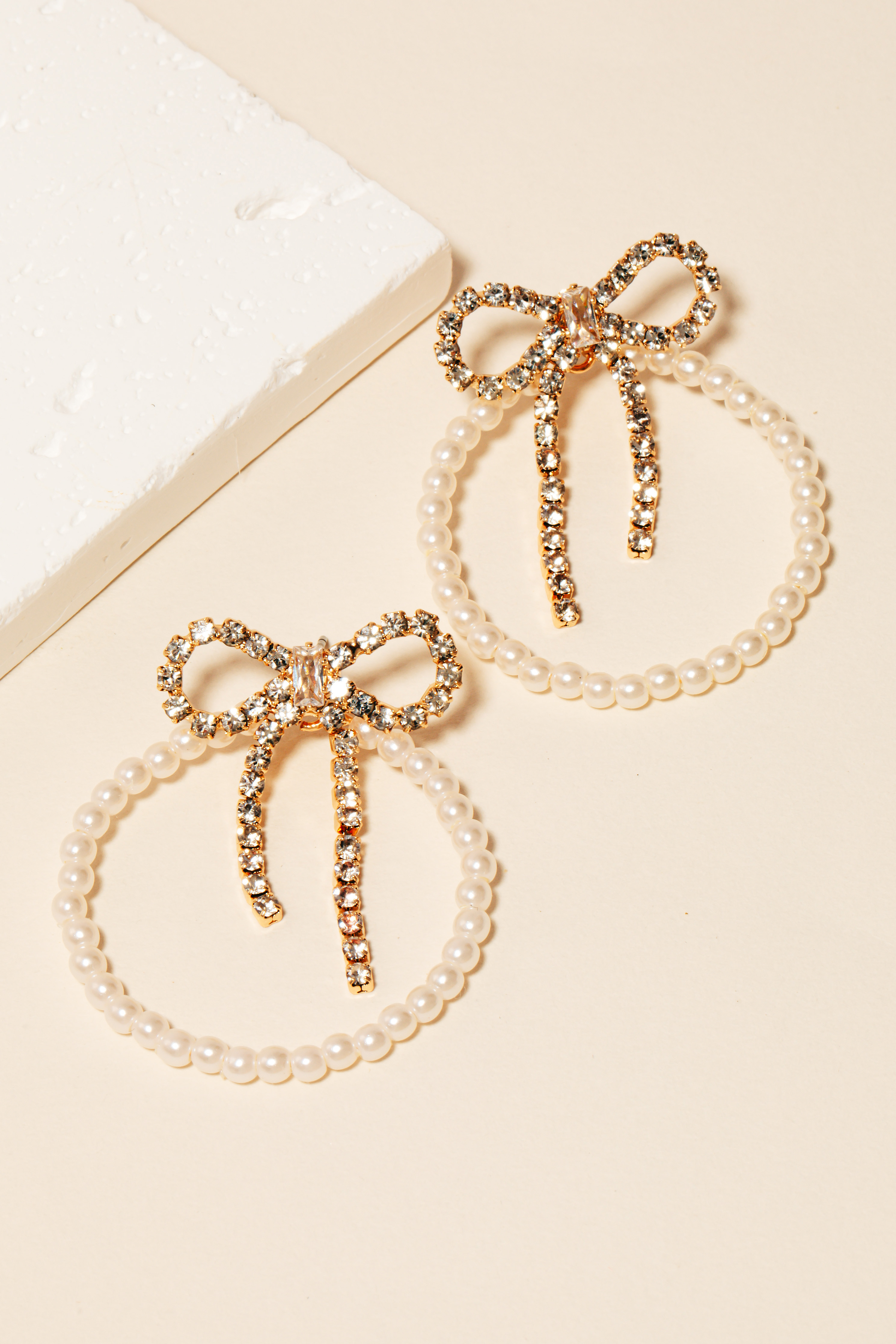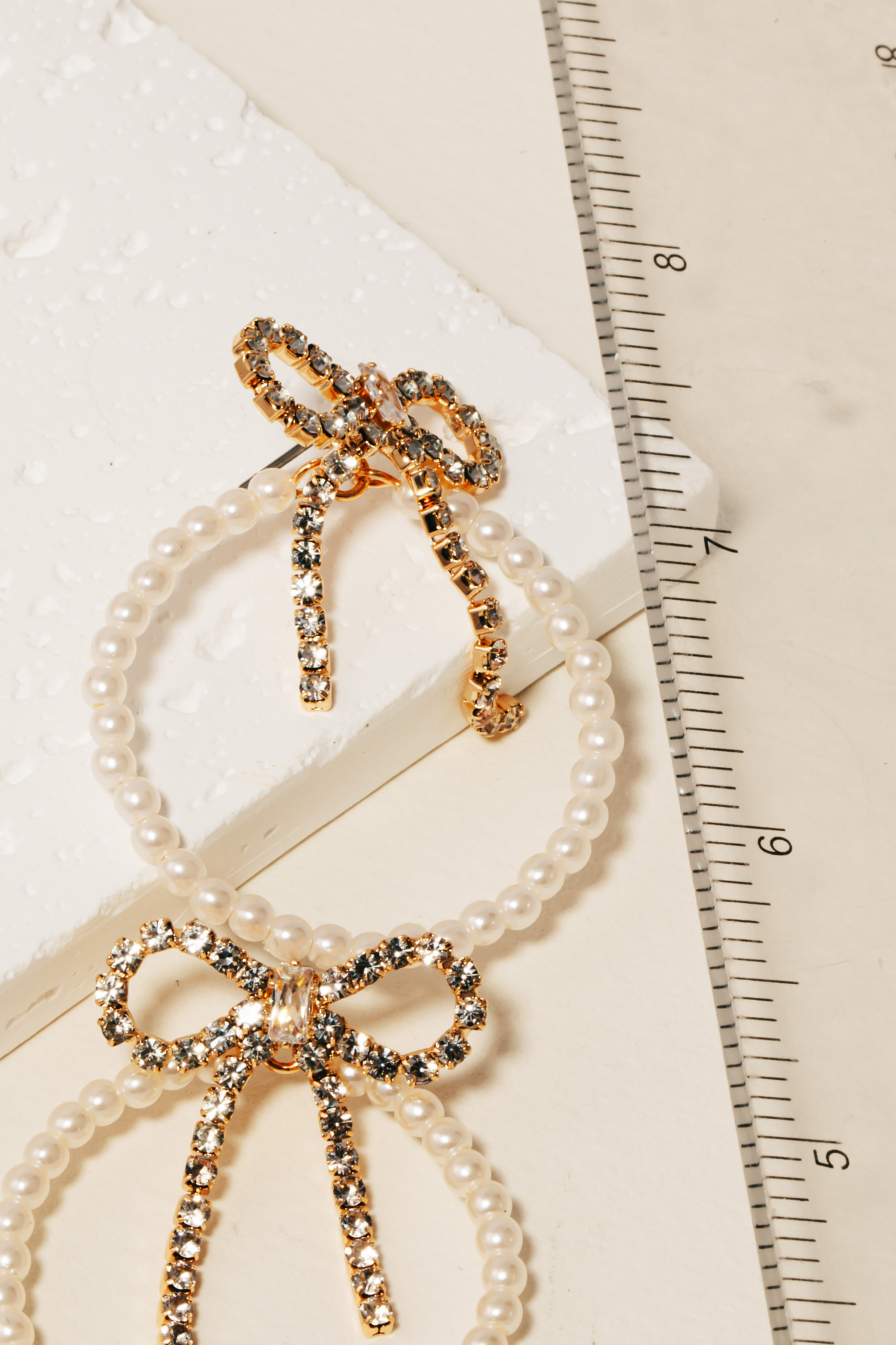 • Perfect for any fashion-forward individual, this pair of dangle earrings contains a special pearl beaded hoop and pave ribbon bow design. Perfect for any occasion, this versatile accessory will enhance any outfit you wear. Available in CLRCRMGD. This item is sold in packs of 1.