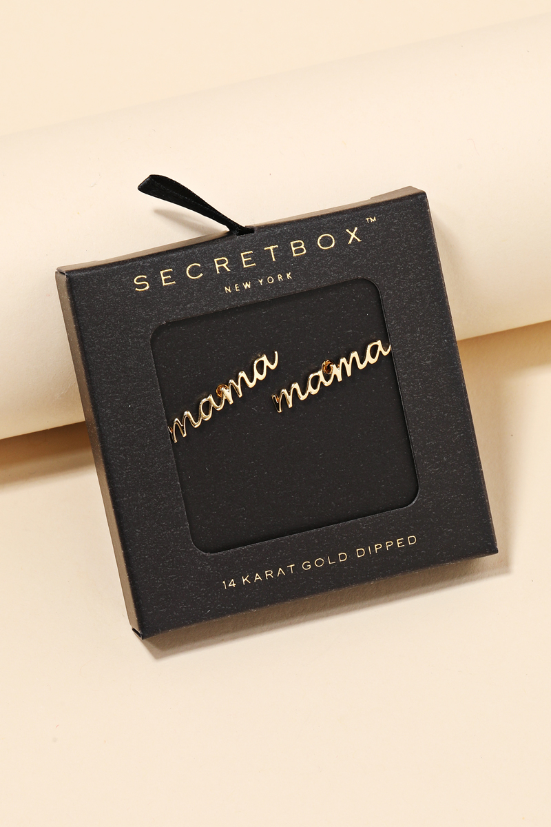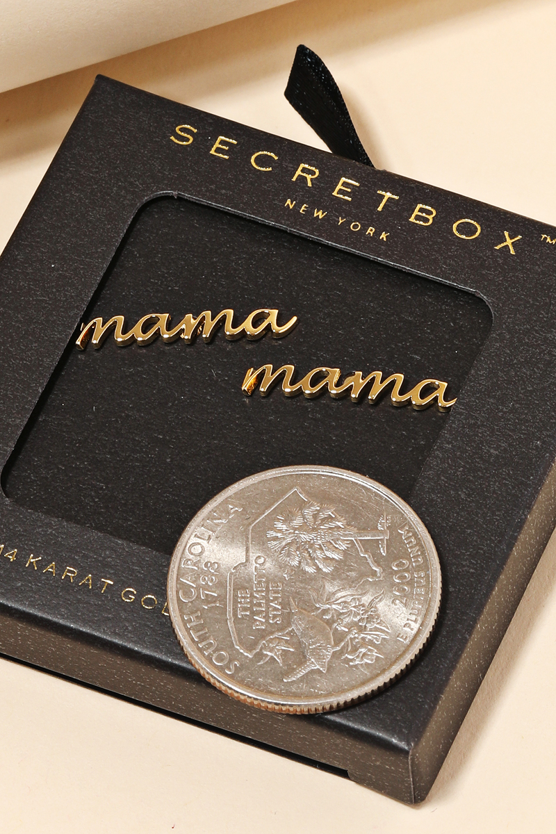 • A must have pair of gold dipped earrings that features a secret box handwritten mama stud earrings design. An excellent choice for any occasion! Available in GD. This item is sold in packs of 1.