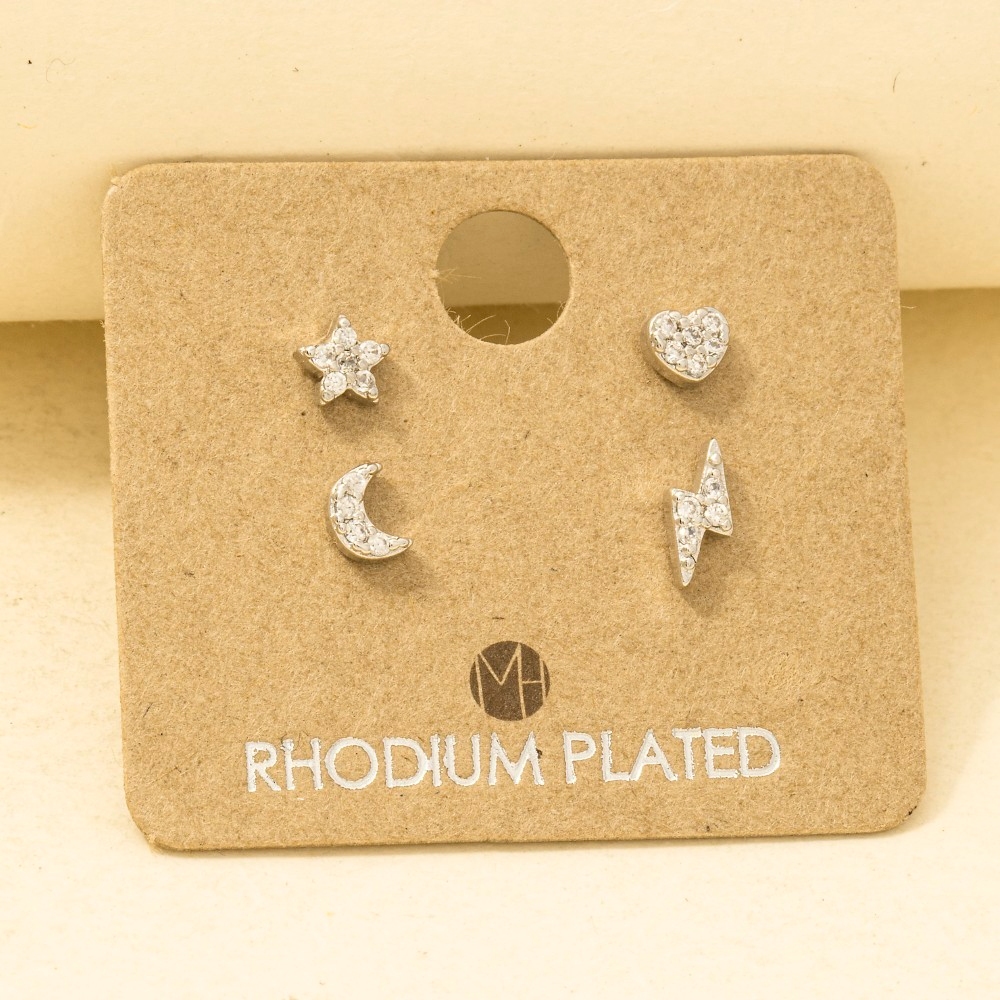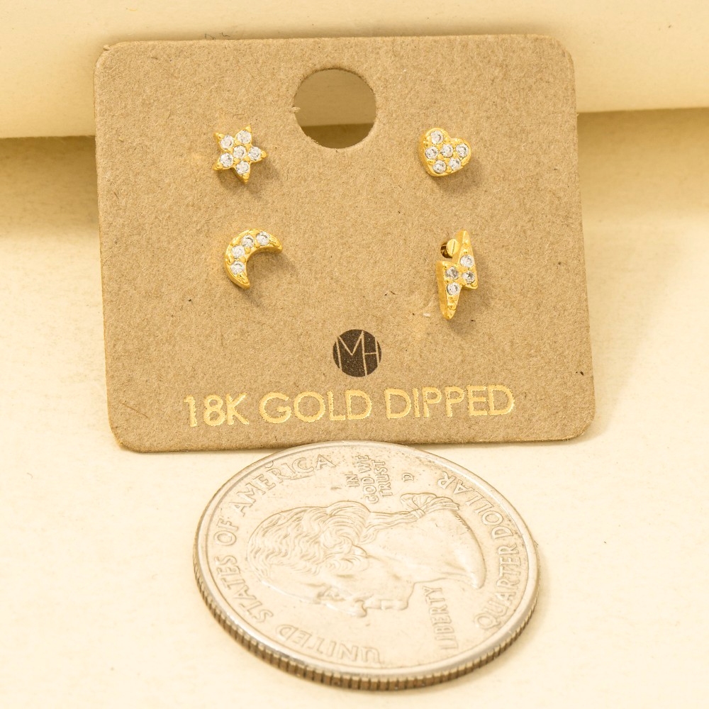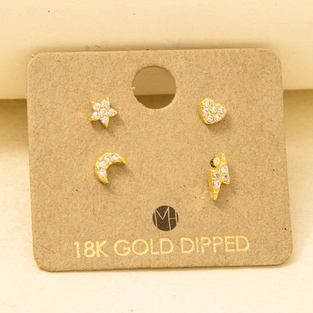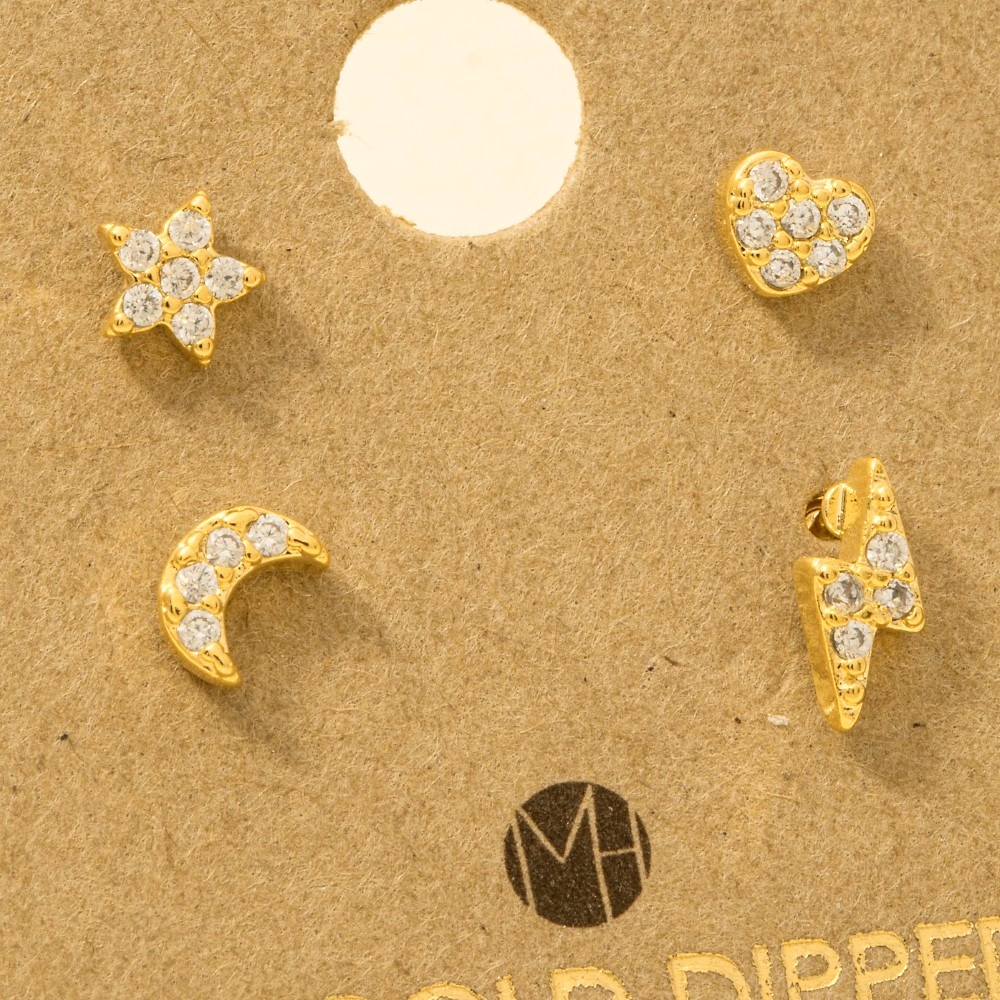 • Effortlessly chic and sophisticated, this trending pair of earrings emanates an elegant gold dipped mini star lightning heart moon stud earrings set design. Perfect for any occasion, this versatile trending pair of earrings will enhance any outfit you wear. Available in G, S and R. This item is sold in packs of 1.