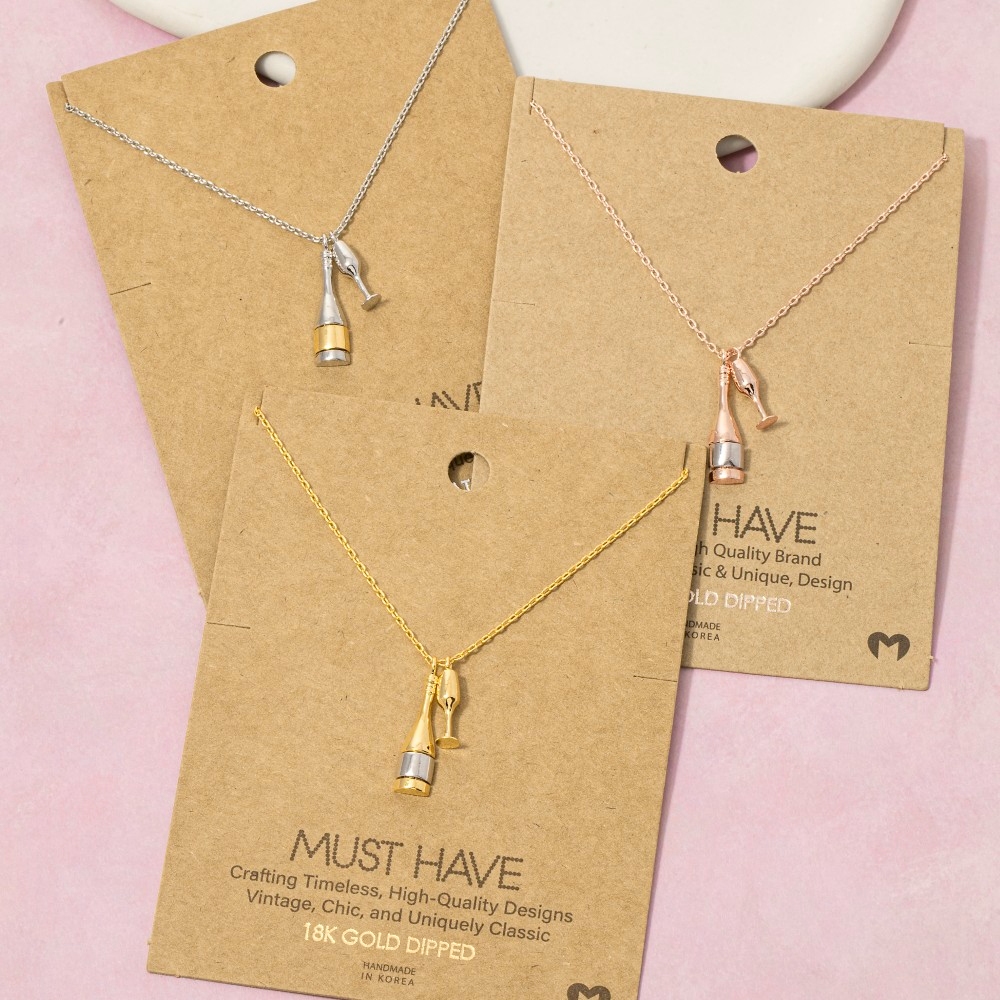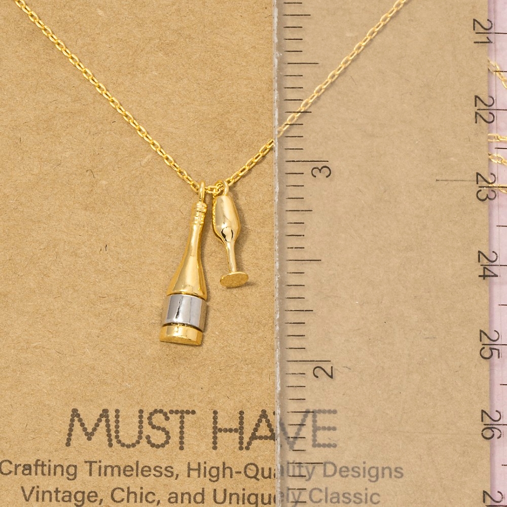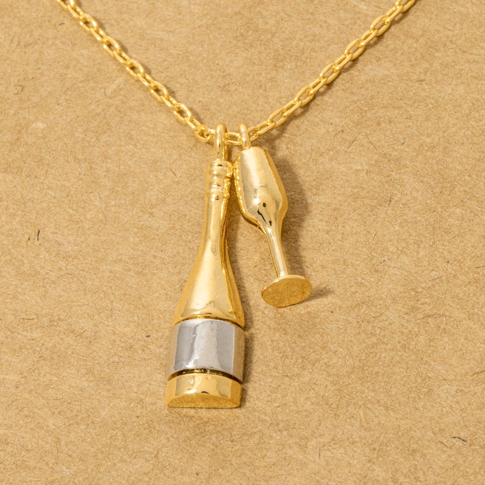 • This piece is designed to be both stylish and functional, this necklace features an exceptional gold dipped champagne bottle and glass charms design. Elevate your outfit with this stylish necklace that's perfect for any occasion. Available in G, R, S. This item is sold in packs of 1.