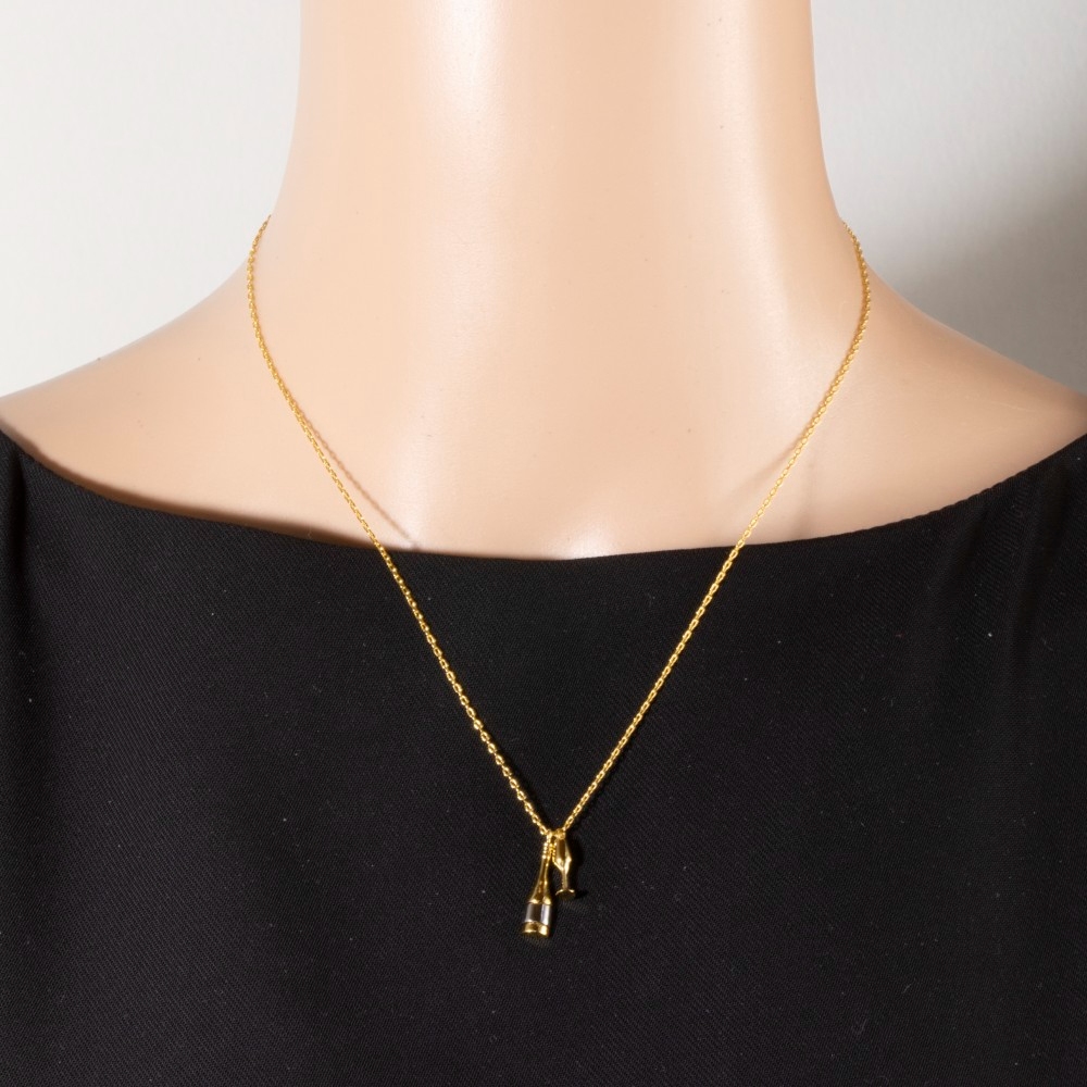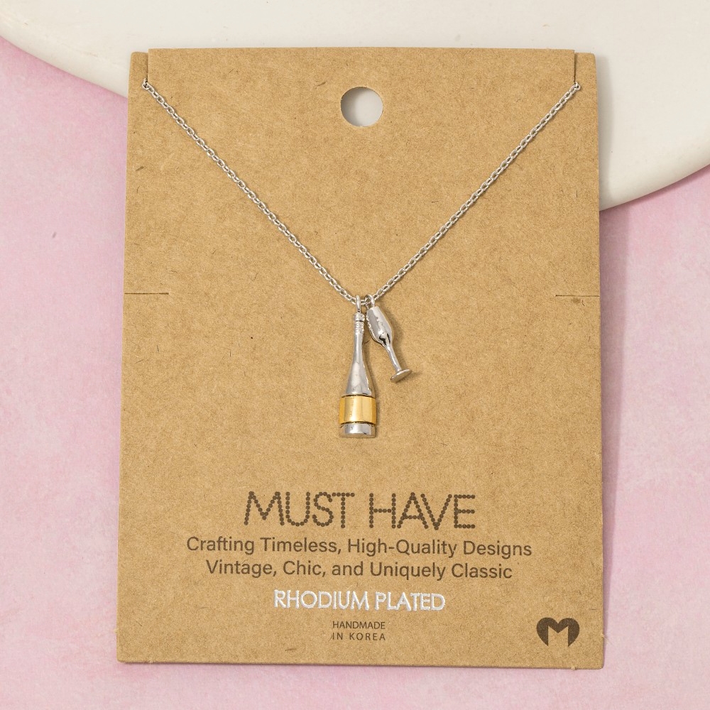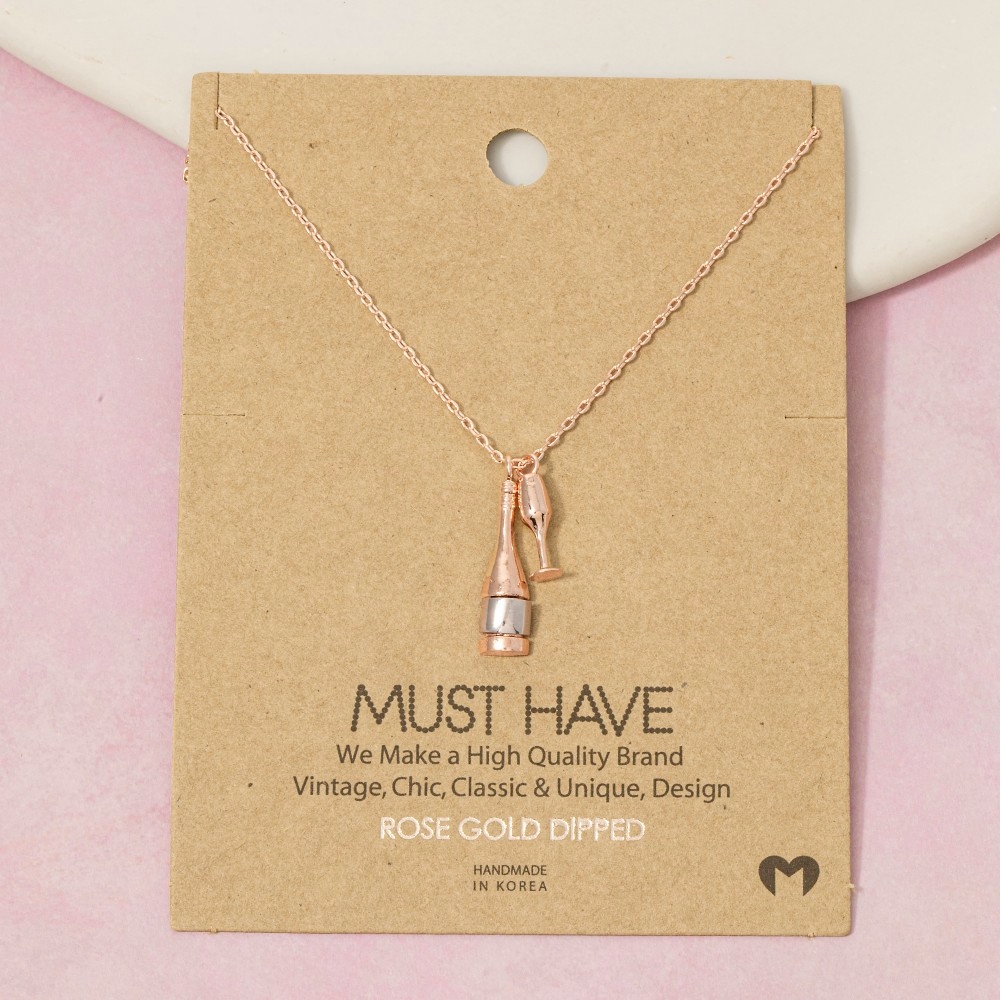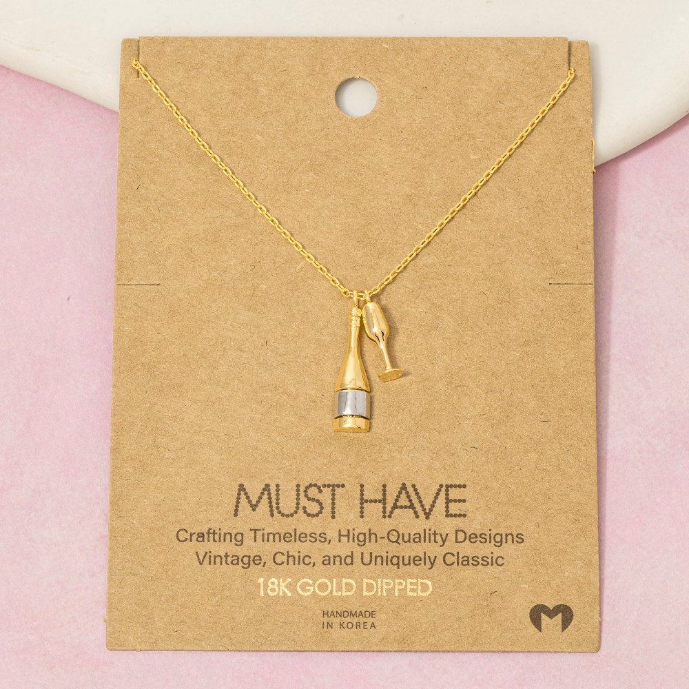 • This piece is designed to be both stylish and functional, this necklace features an exceptional gold dipped champagne bottle and glass charms design. Elevate your outfit with this stylish necklace that's perfect for any occasion. Available in G, R, S. This item is sold in packs of 1.