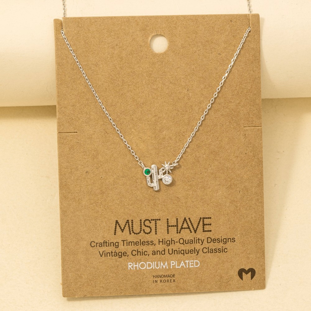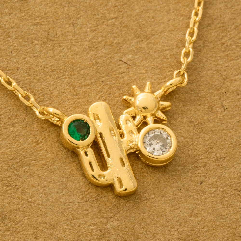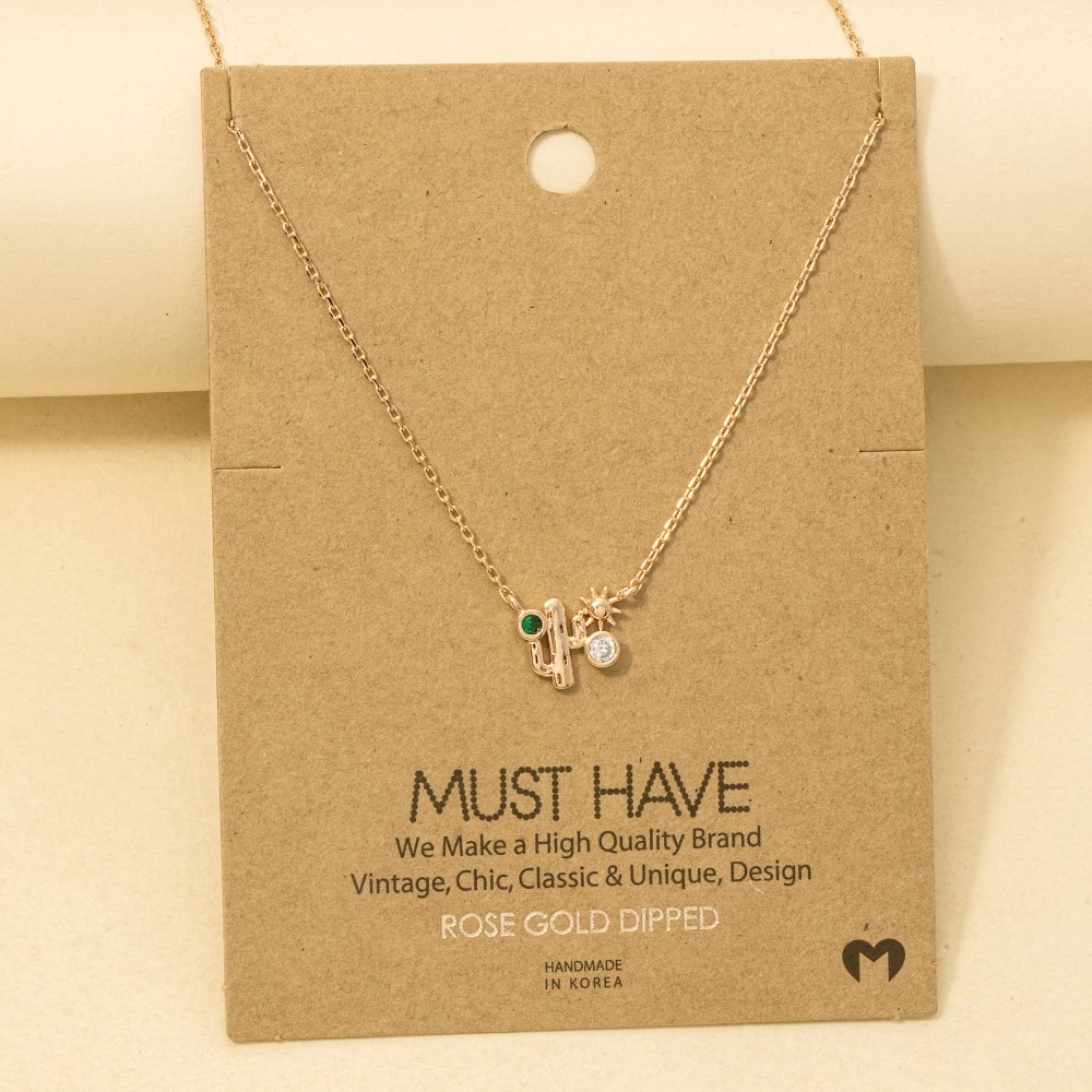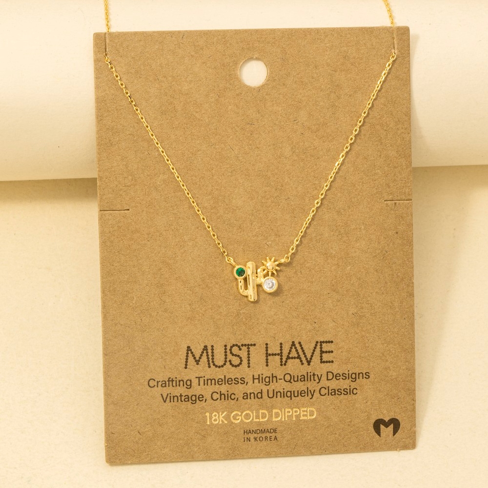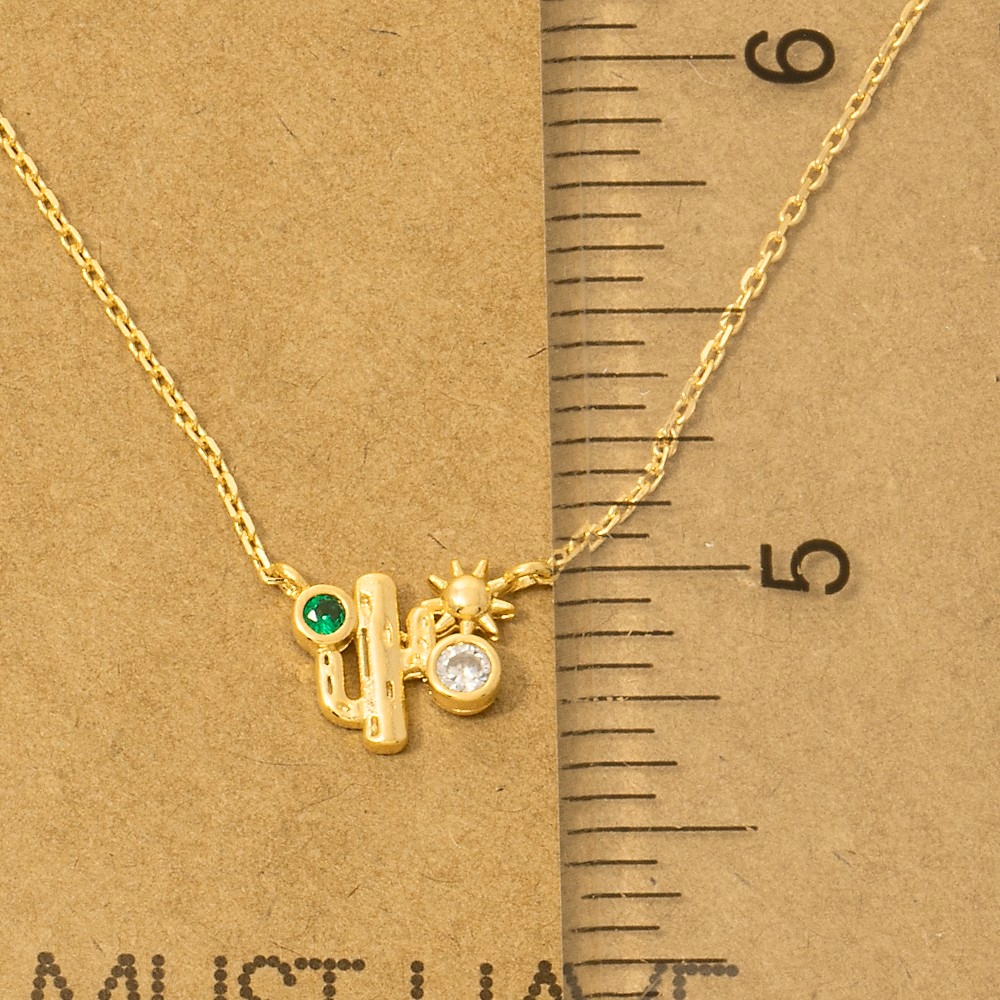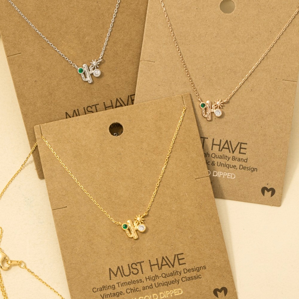 The perfect way to complete any outfit, this trending necklace comes with a special gold dipped cubic zirconia cactus western pendant necklace design. A stylish trending necklace that's perfect for complementing your favorite outfit. Available in G, R, S. This item is sold in packs of 1.
