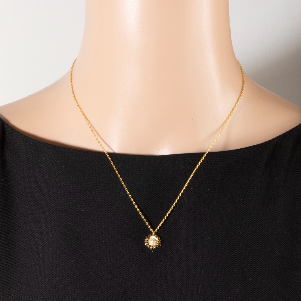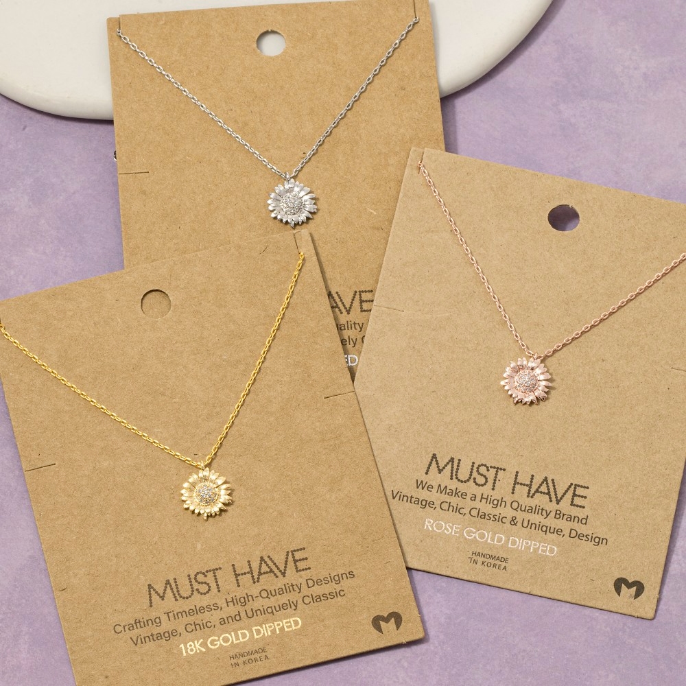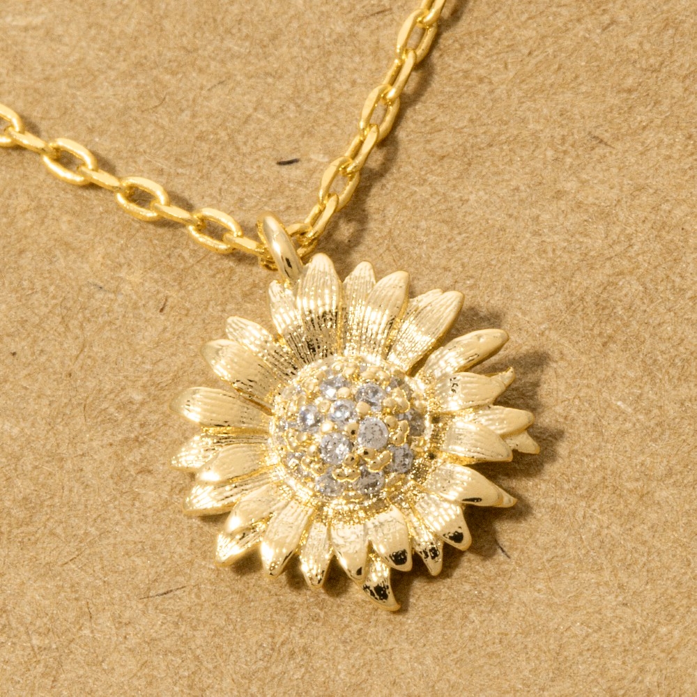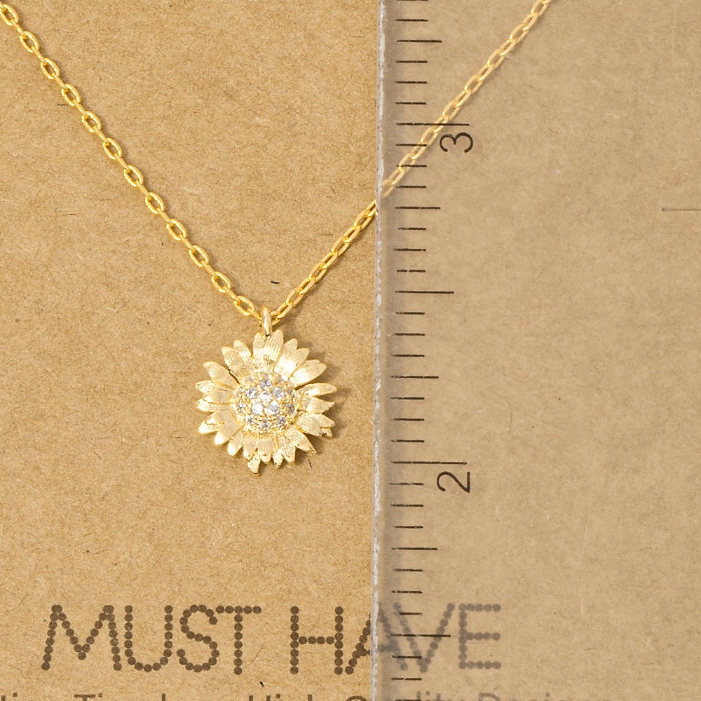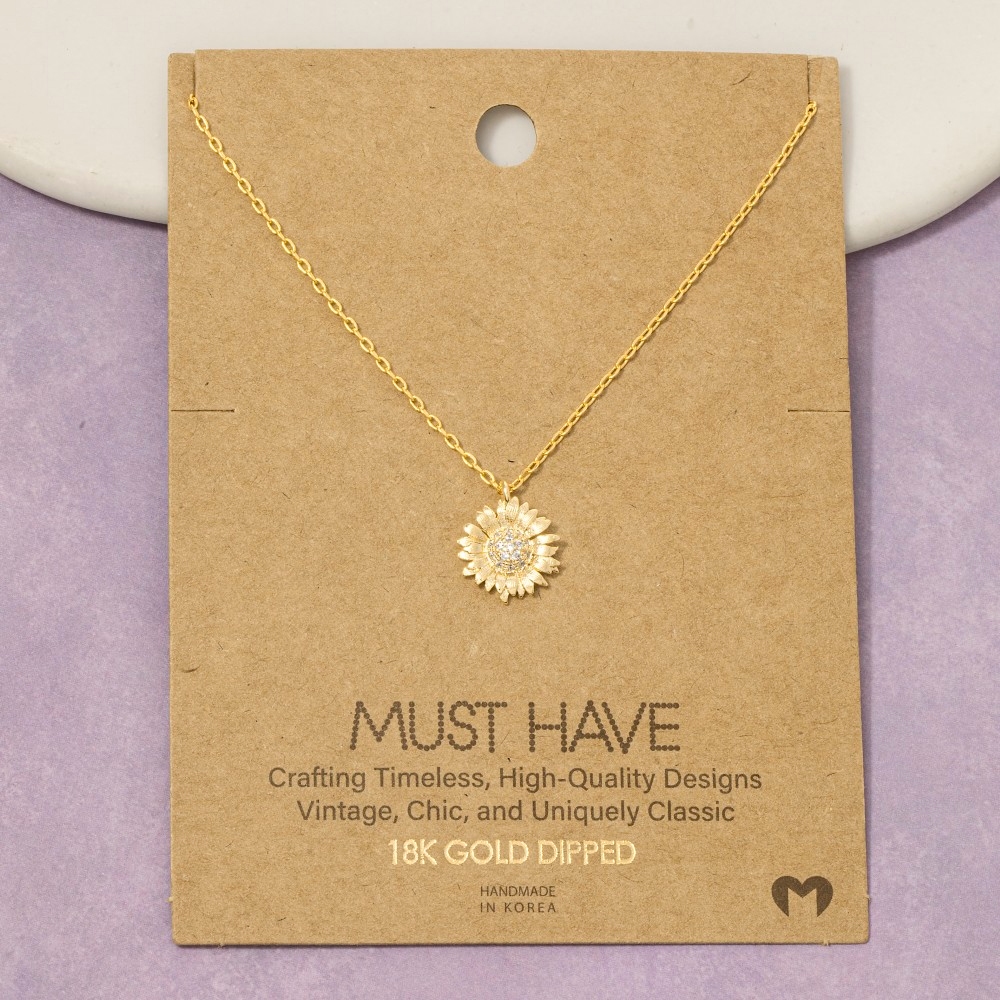 Make a statement, this pendant necklace features a distinct gold dipped cubic zirconia pave flower design. The perfect way to complete any outfit, whether you're dressing up or keeping it casual. Available in G, R, S. This item is sold in packs of 1.