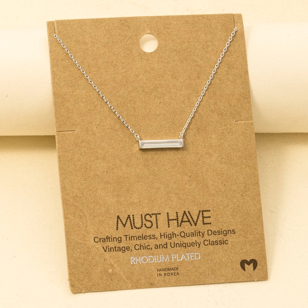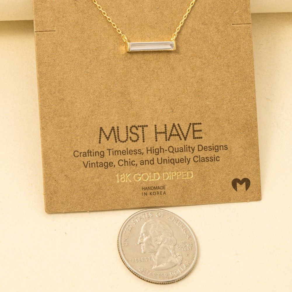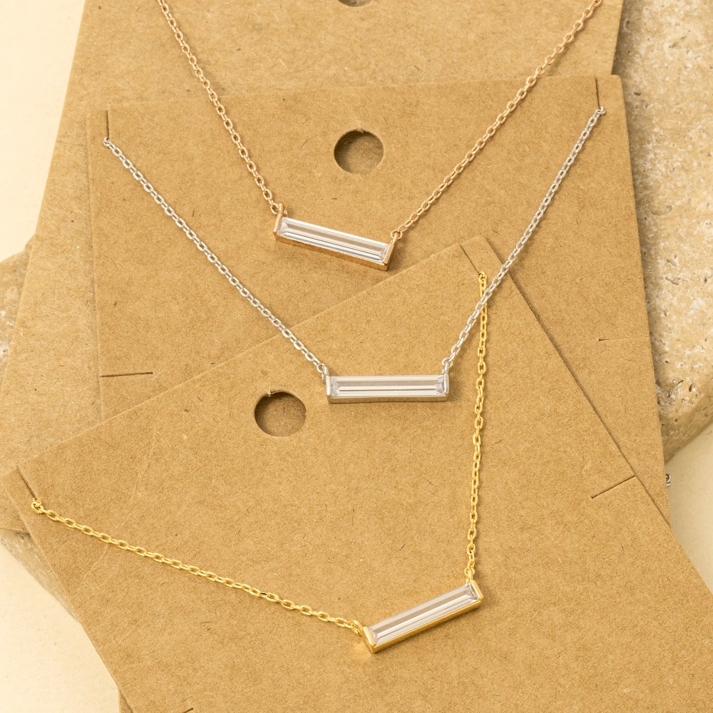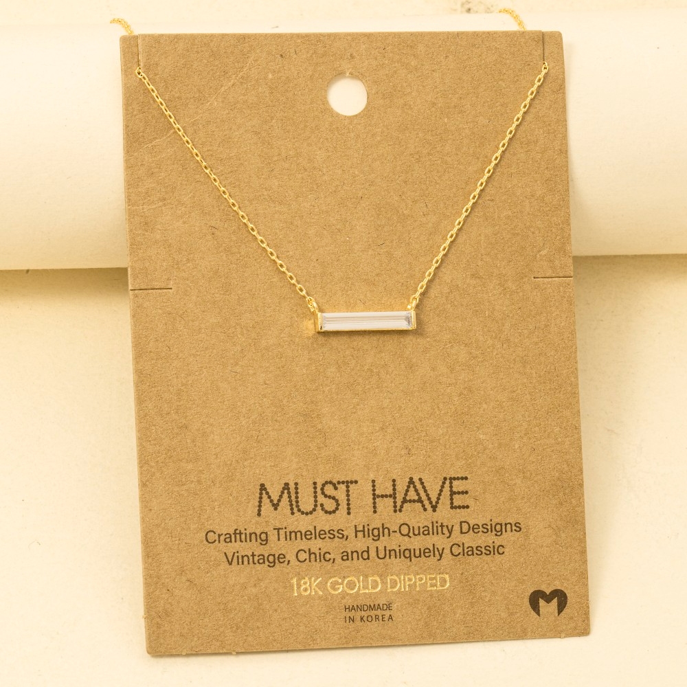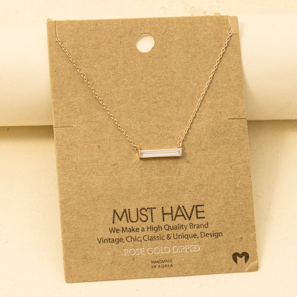 A timeless piece that you'll wear for years to come, this trending necklace showcases a breathtaking gold dipped rhinestone bar pendant necklace design. Perfect for adding some personality and flair to your wardrobe, this trending necklace is a must-have. Available in G, S, R. This item is sold in packs of 1.