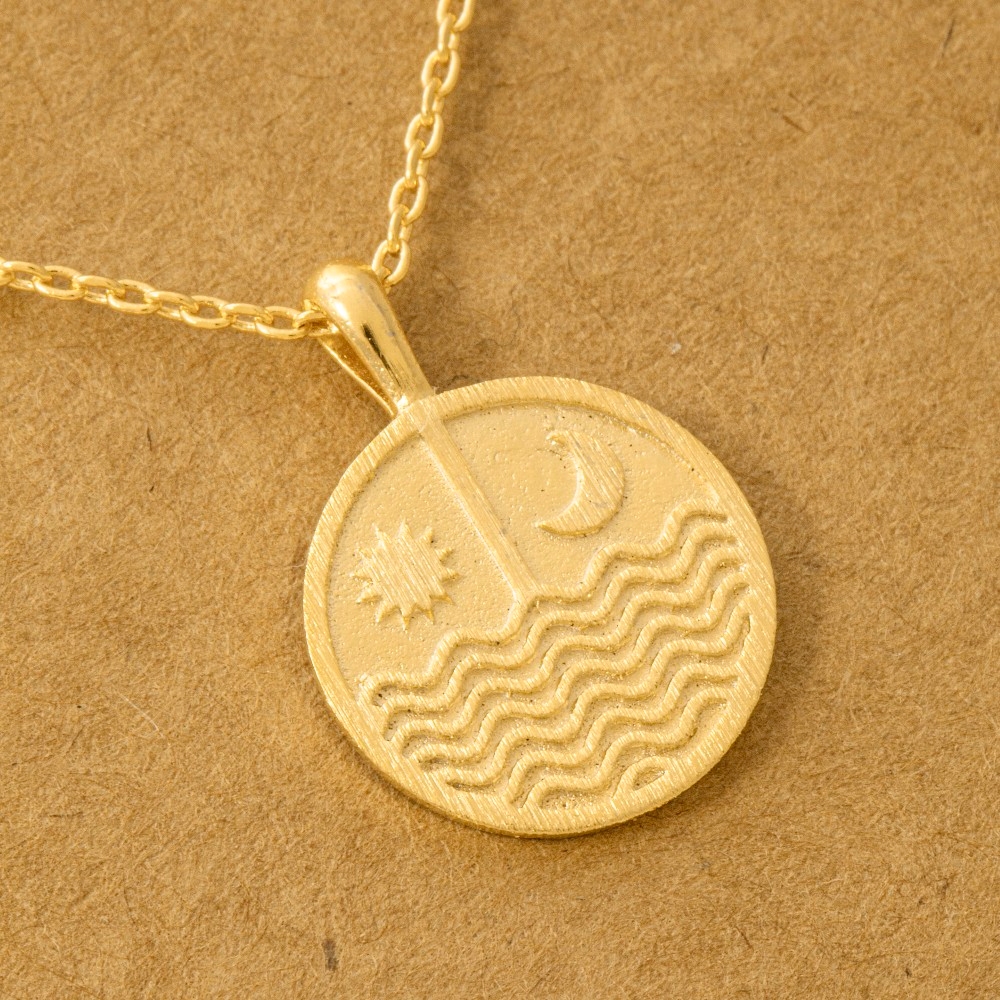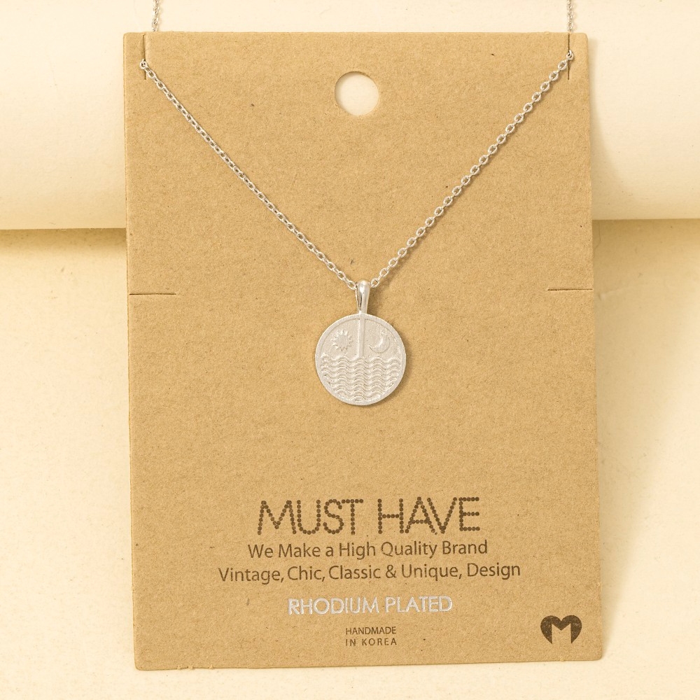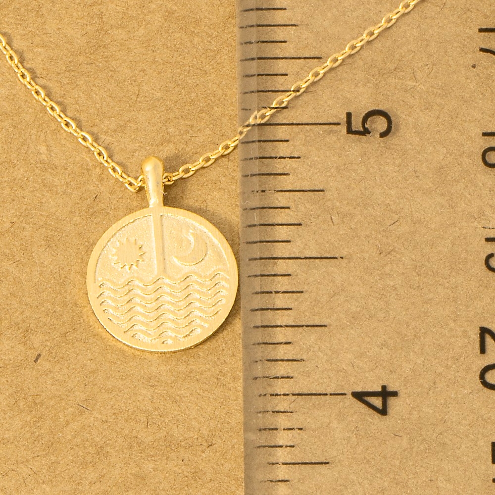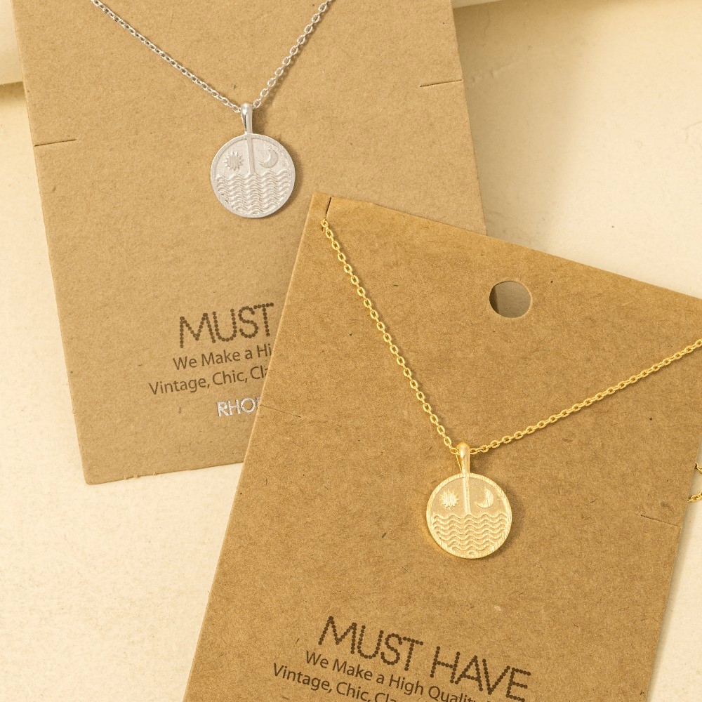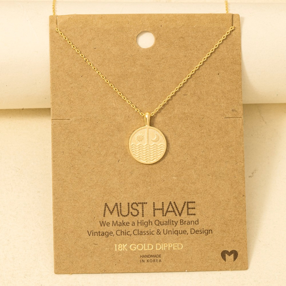 Bold and daring, this trending necklace reveals an intricate gold dipped sun moon round coin pendant necklace design. Unleash the power of style with this versatile trending necklace, perfect for enhancing the charm of your wardrobe. Available in G, S and R. This item is sold in packs of 1.