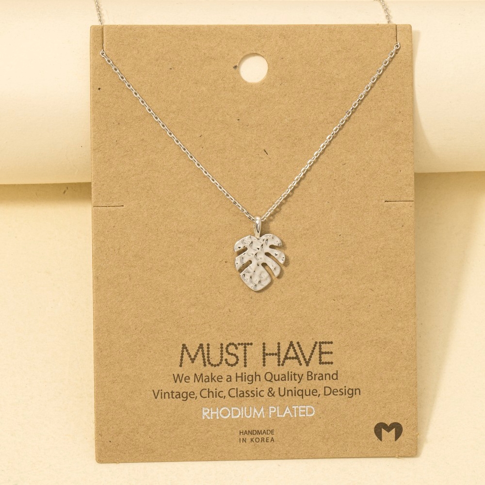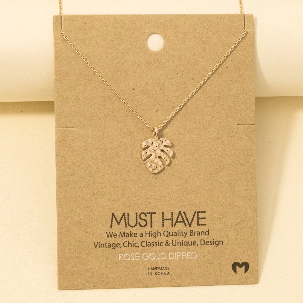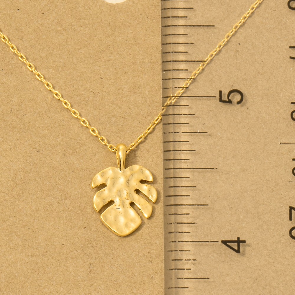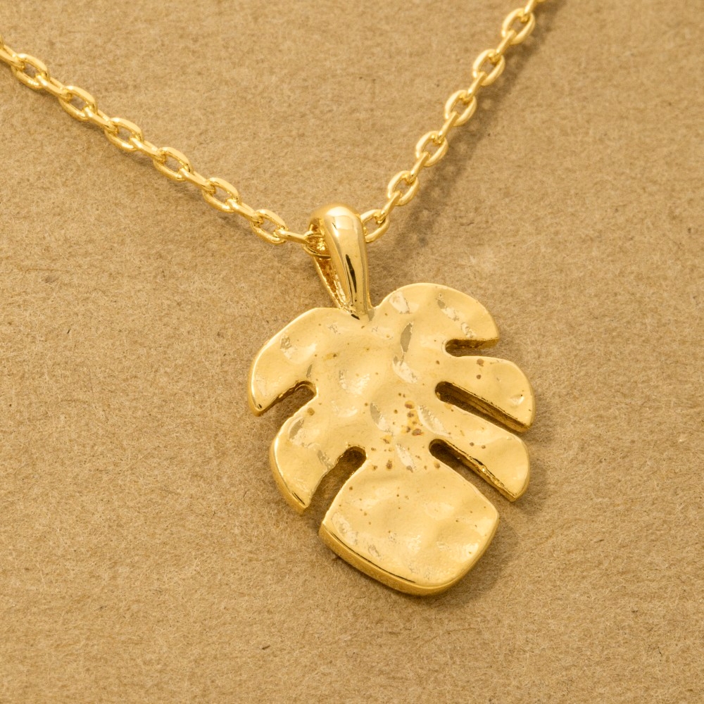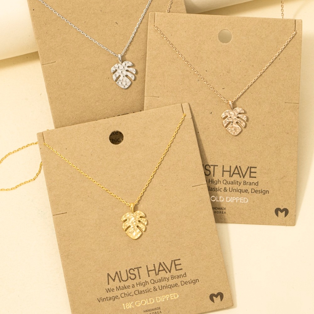 • A contemporary masterpiece, this trending necklace showcases an alluring gold dipped hammered monstera leaf pendant necklace design. A must-have trending necklace that adds a unique flair to any look. Available in G, R, S. This item is sold in packs of 1.