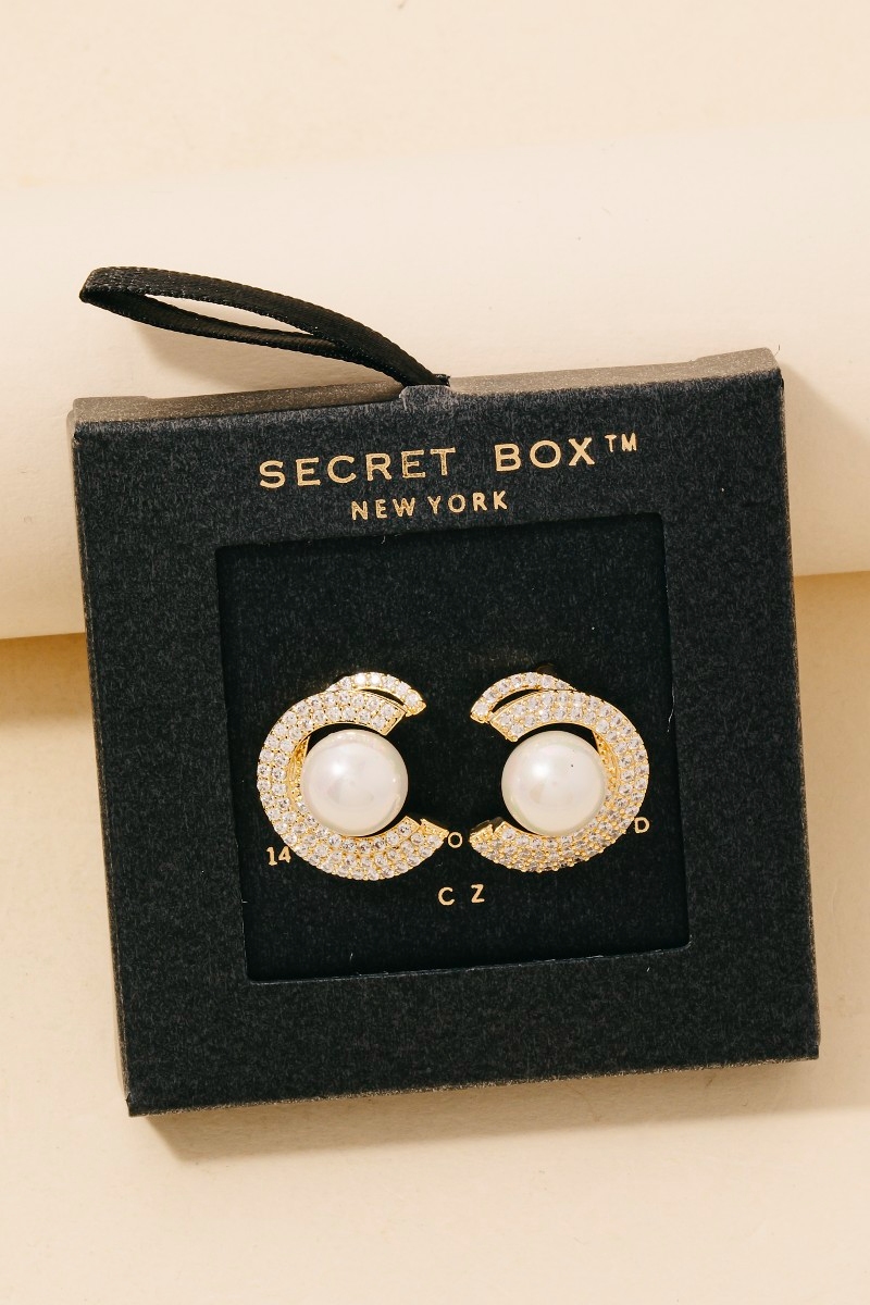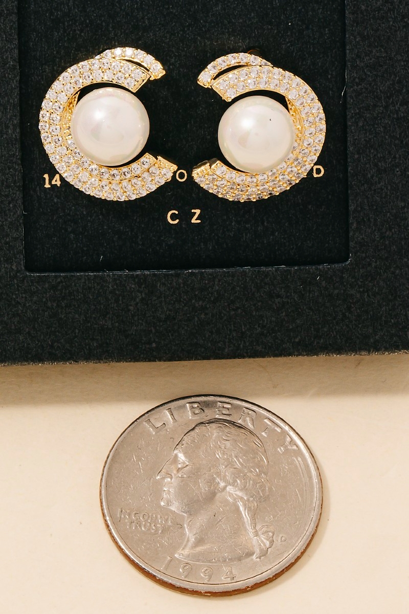 • This pair of stud earrings displays a fashionable gold dipped cubic zirconia pave crescent and pearl style. Delight in the intricate details that make this pair of stud earrings an essential element in expressing your fashion identity.