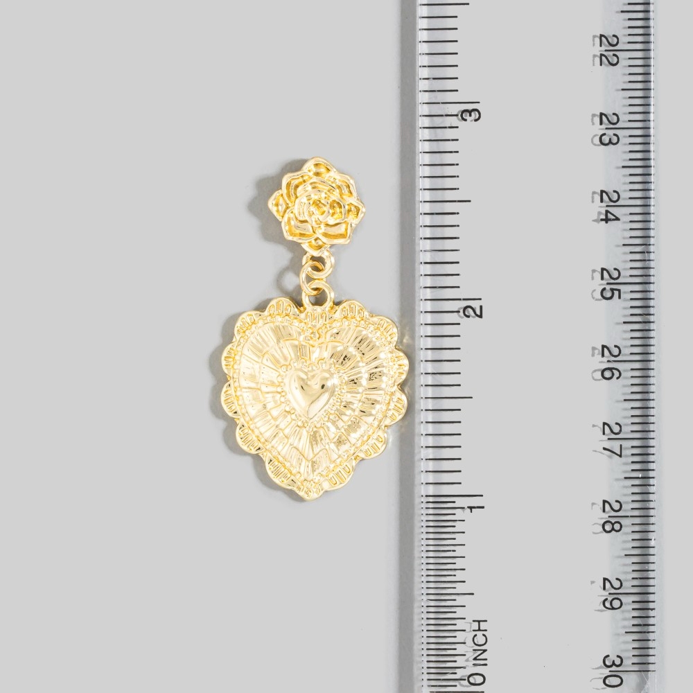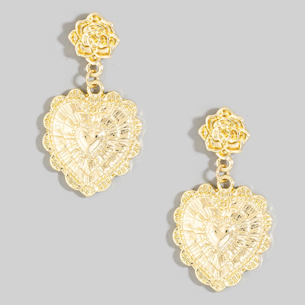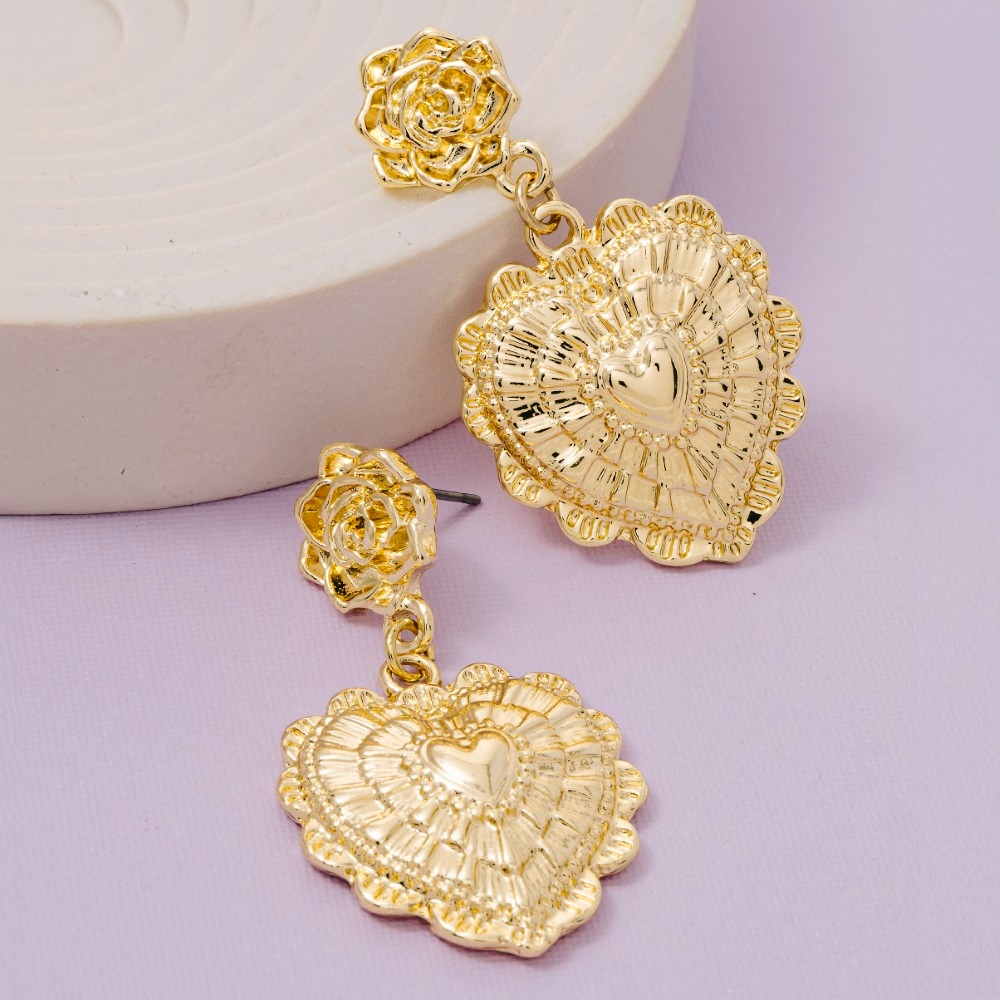 • Upgrade your pair of drop earrings game, this pair of drop earrings showcases an alluring metallic textured heart design. A must-have pair of drop earrings that adds a unique flair to any look. Available in G. This item is sold in packs of 1.