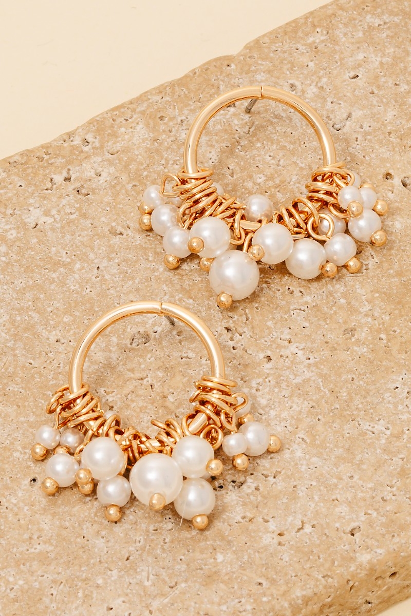 - This pair of drop earrings brings a stunning pearl bead fringe hoop stud style. Indulge in the artistry of accessorizing with this unique piece.