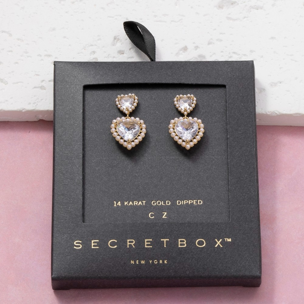 • This is the perfect pair of drop earrings for any occasion pair of drop earrings contains a special secret box gold dipped cubic zirconia heart design. A perfect addition to your wardrobe that effortlessly enhances your style. Available in GD. This item is sold in packs of 1.