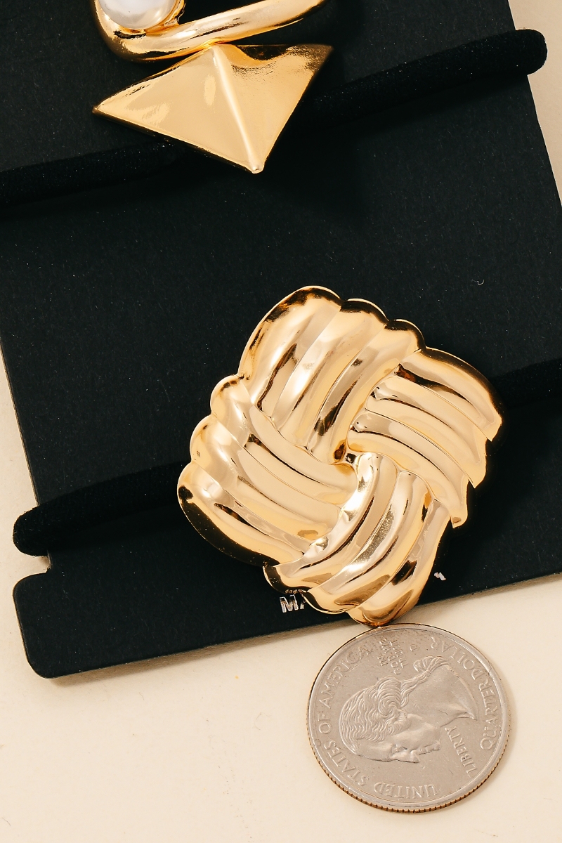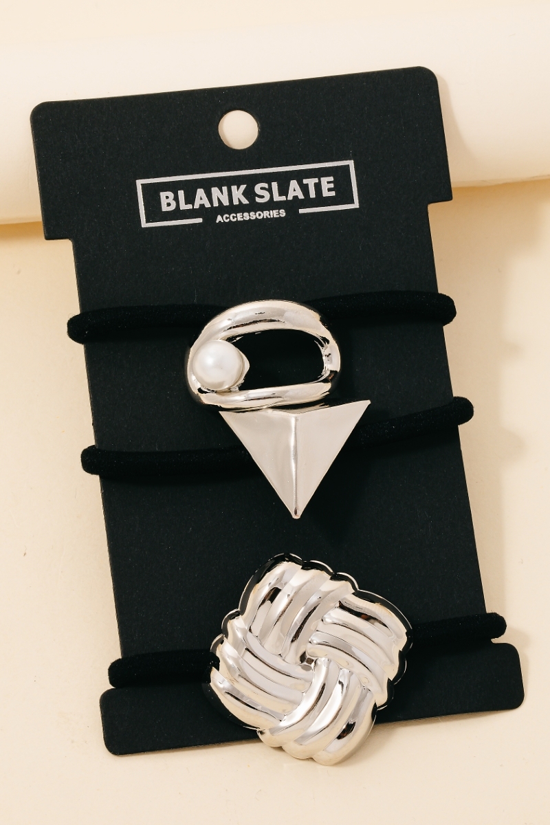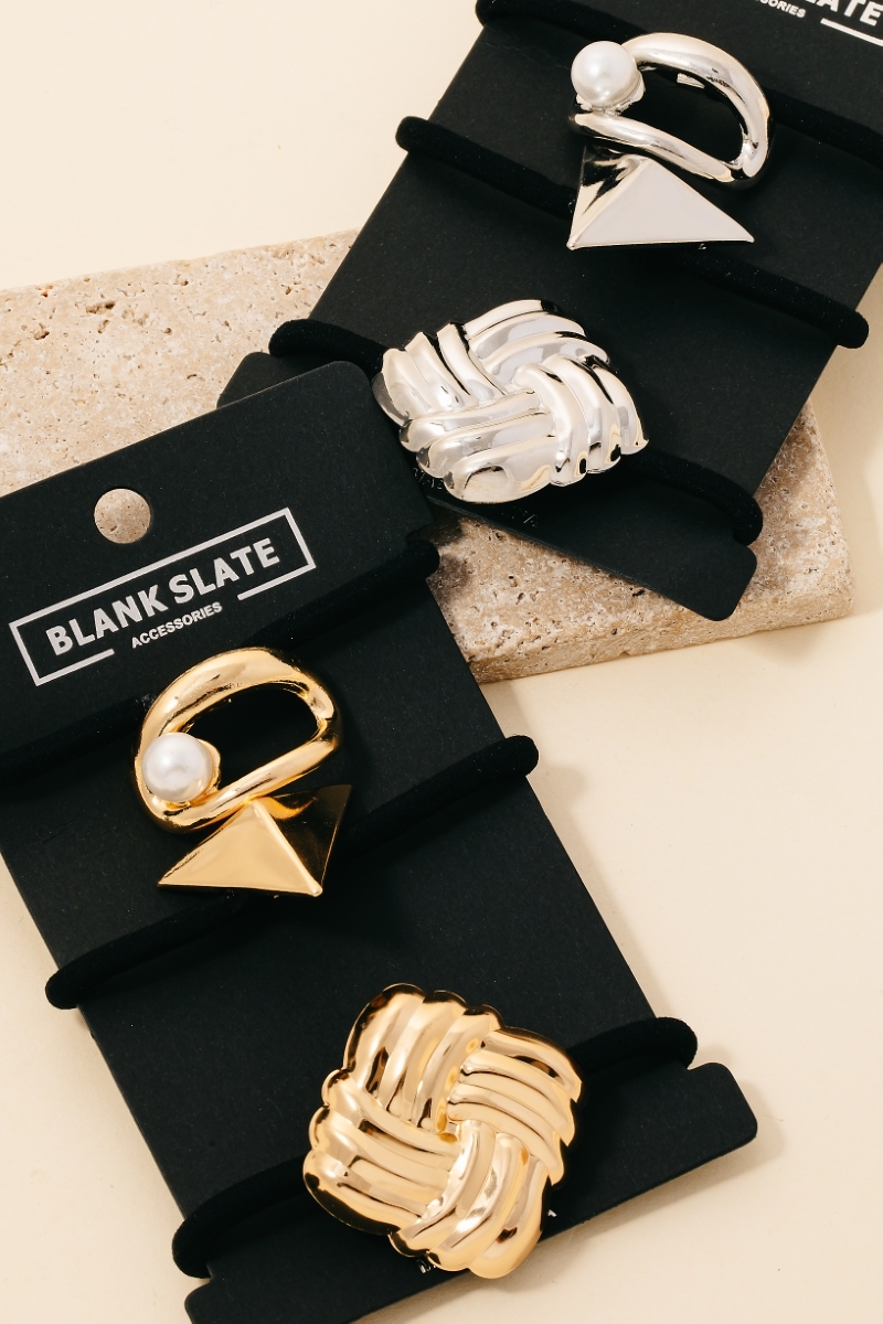 Add some edge to your wardrobe, this incorporates a remarkable pearl stud trianle and knot charm hair tie set design. Redefine your wardrobe with this versatile , a timeless addition that brings an air of sophistication to any look. Available in G and S. This item is sold in packs of 1.