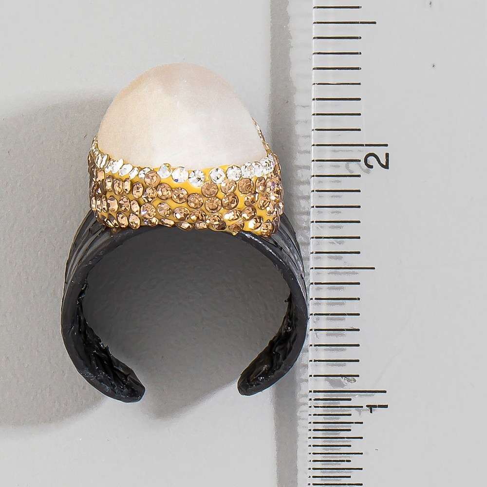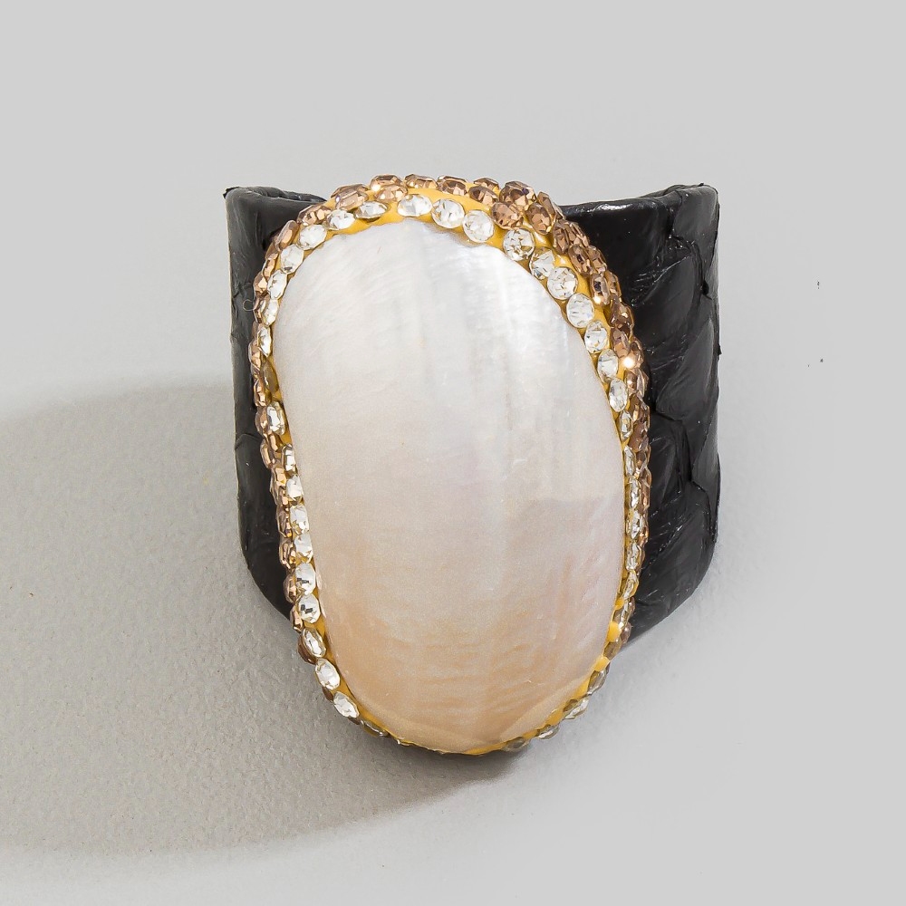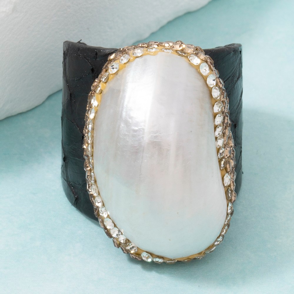 Pave Mother Of Pearl With Leather Band Statement Ring