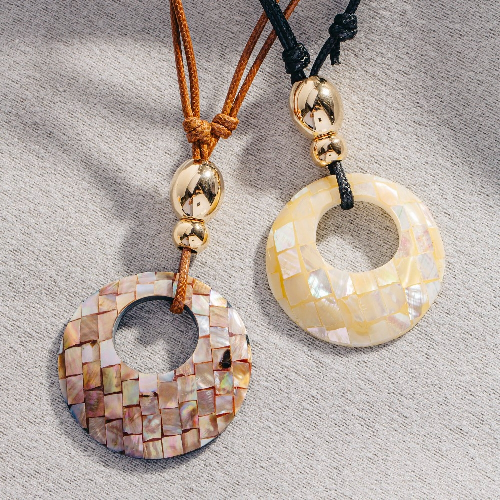 This pendant necklace is made with 30% Polyester, 10% Acrylic and 60% Shell.