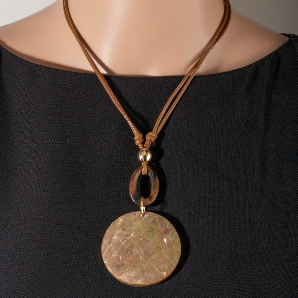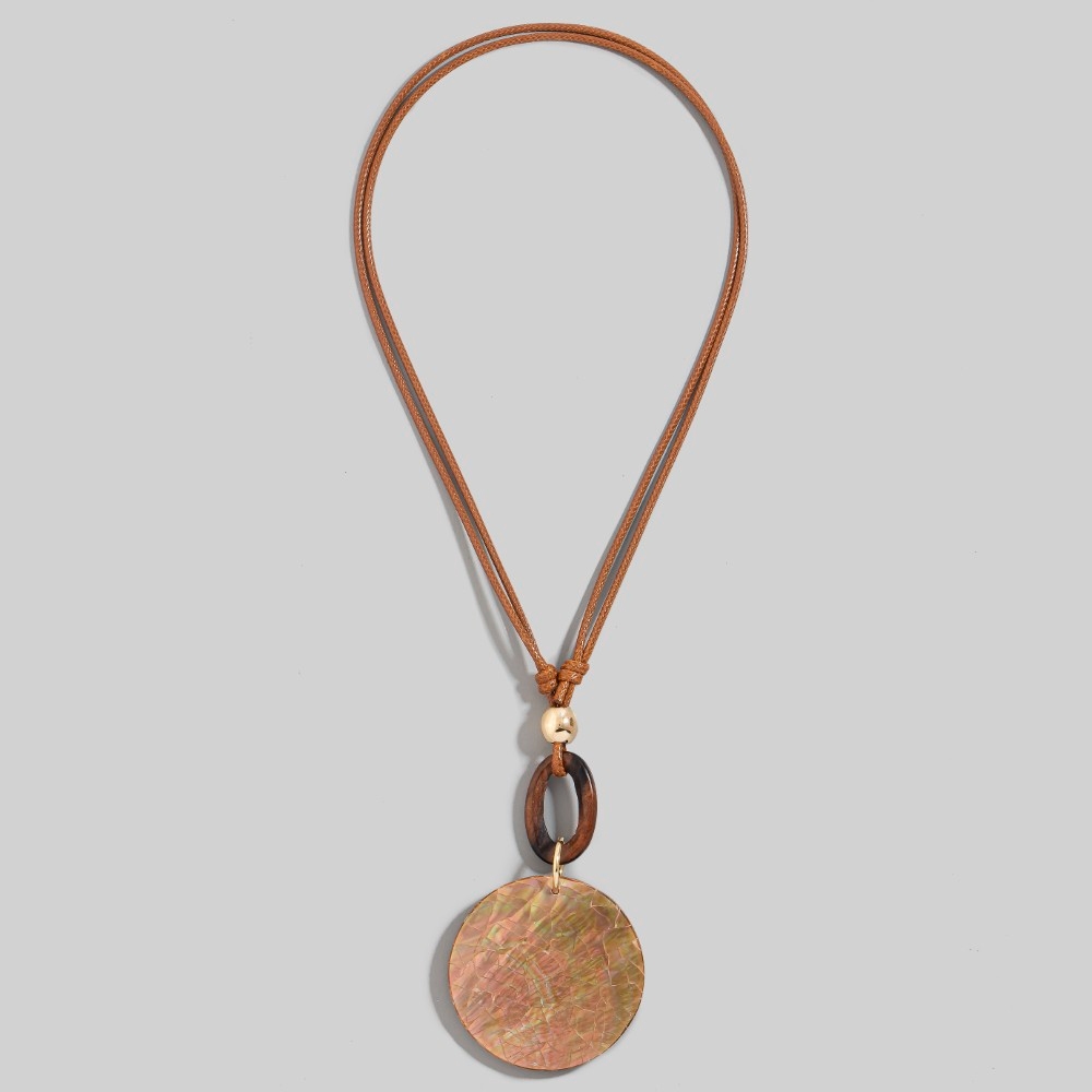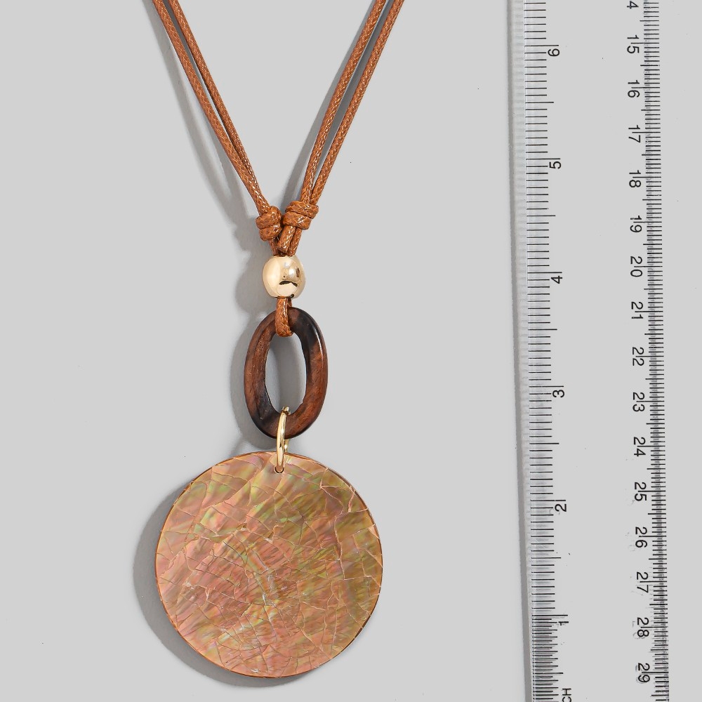 • This pendant necklace is made with 30% Polyester, 5% Acrylic and 10% Wood 55% Shell.