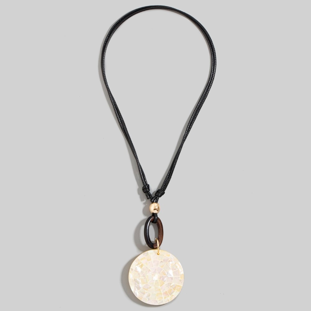 • A versatile piece that can be dressed up or down, this pendant necklace carries a charming mosaic shell disc and wooden hoop pendant cord necklace design. The perfect way to complete any outfit, whether you're dressing up or keeping it casual. Available in PK, WH. This item is sold in packs of 1.