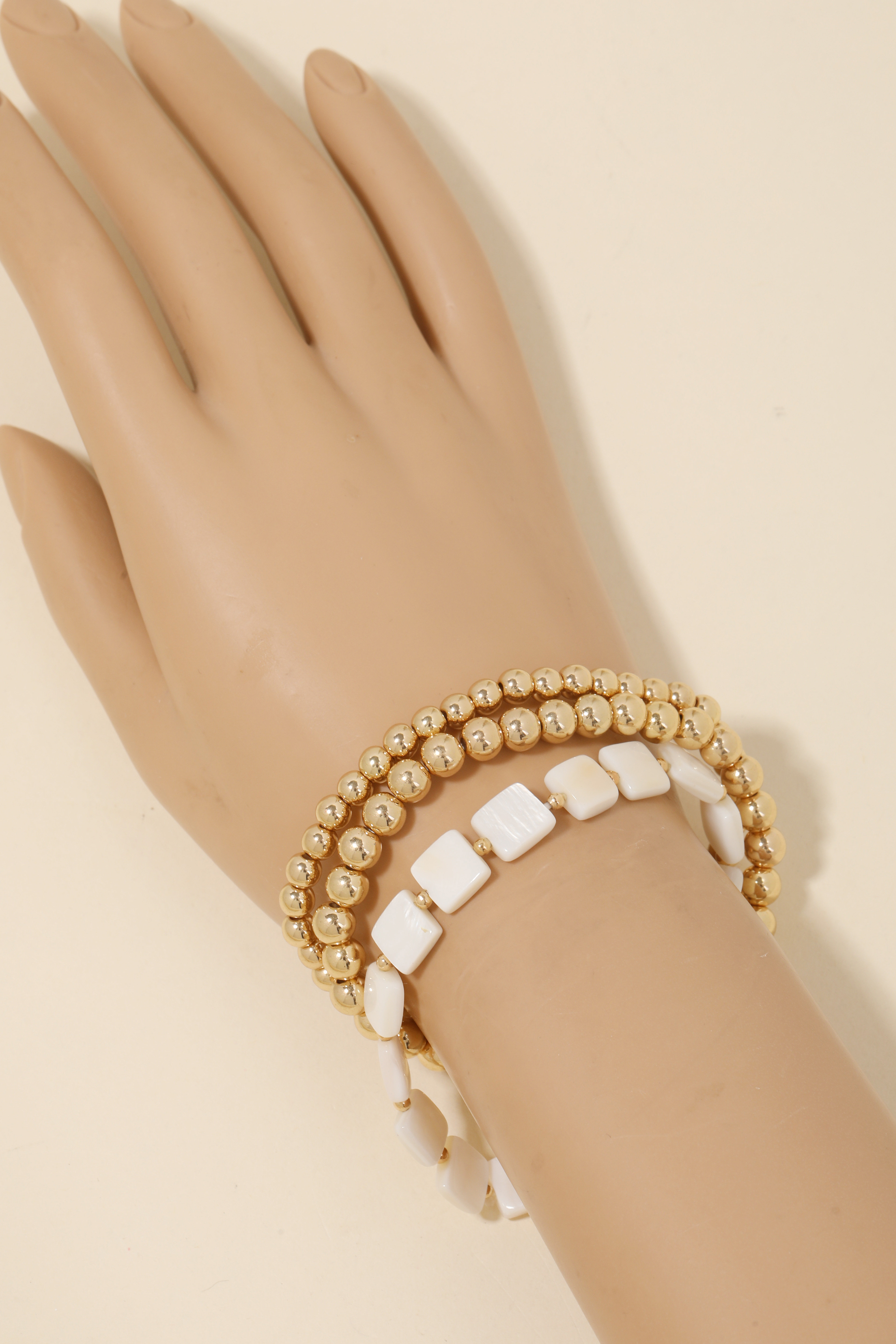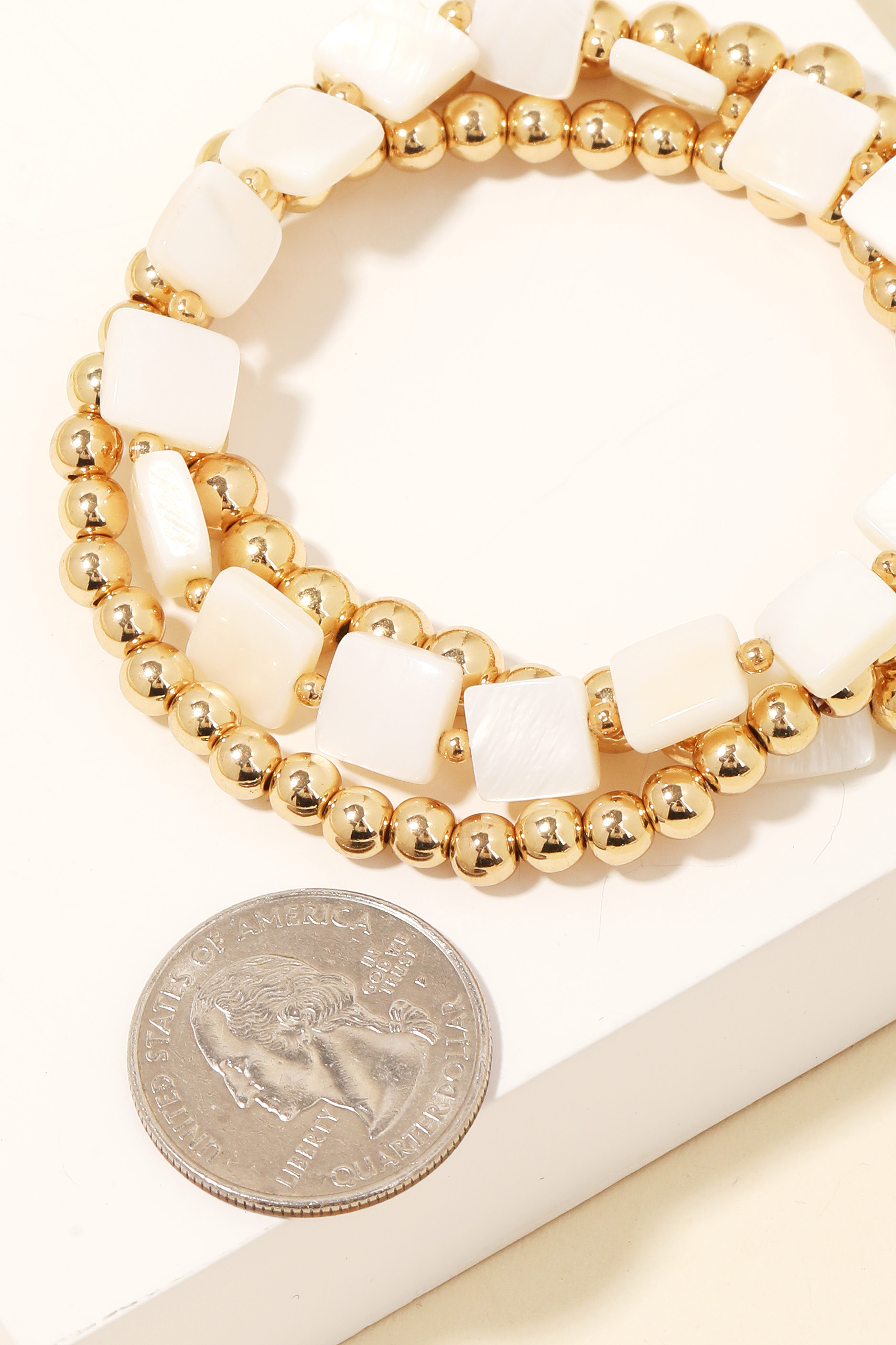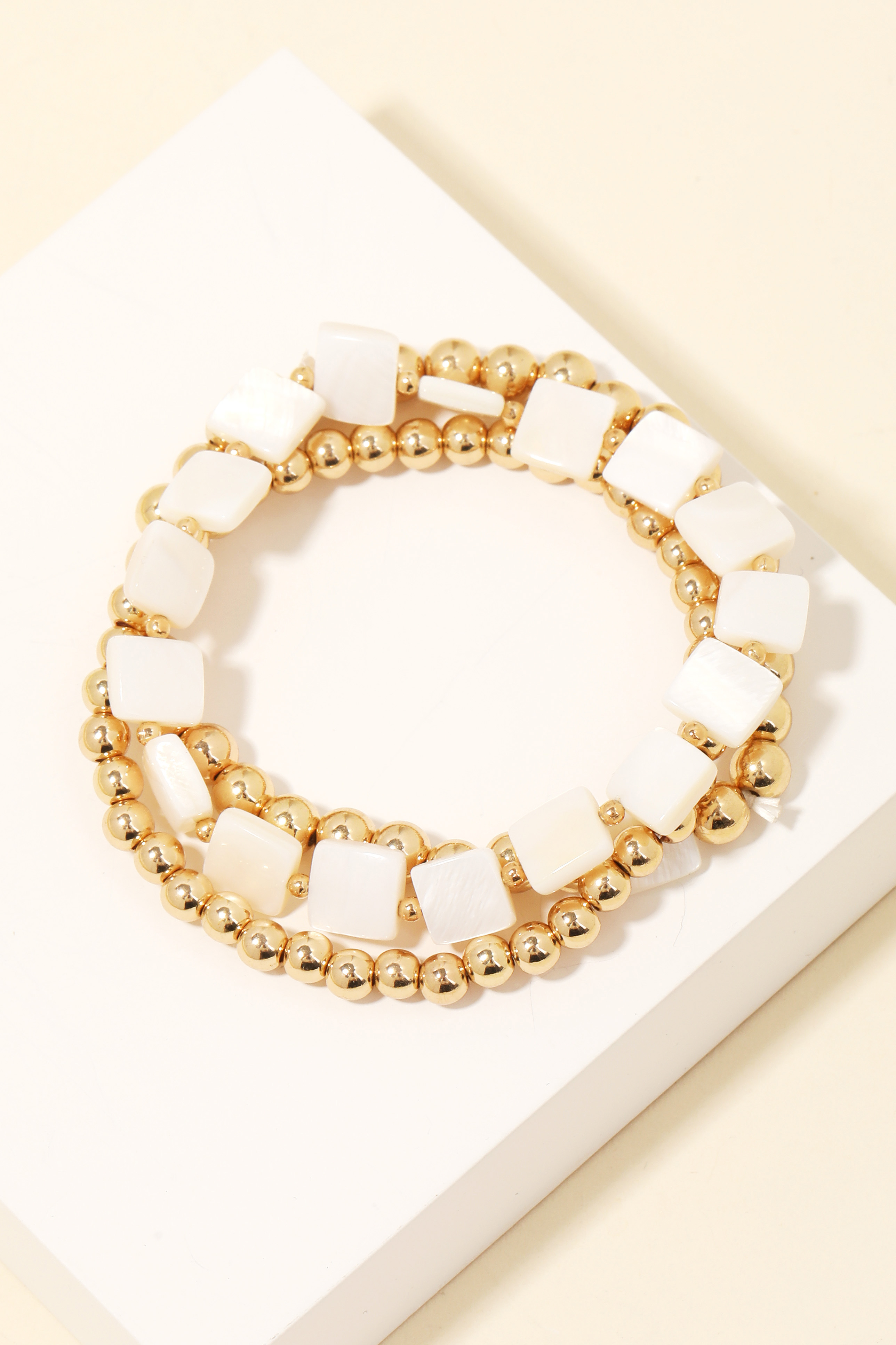 • Chic, sophisticated, and always in style, this bracelet exudes a refined mother of pearl square beads set design. It also includes a layered metallic ball beaded bracelet. This item is the perfect way to add some texture and interest to any outfit. Available in G. This item is sold in packs of 1.