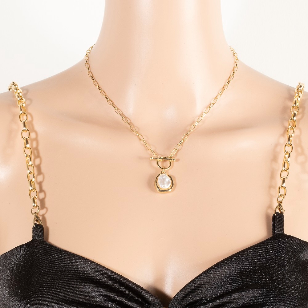• This piece is both timeless and on-trend, this chain necklace features a distinct pearl pendant dainty toggle design. This chain necklace is the perfect finishing touch to any outfit, adding a touch of sophistication and glamour. This item is sold in packs of 12.