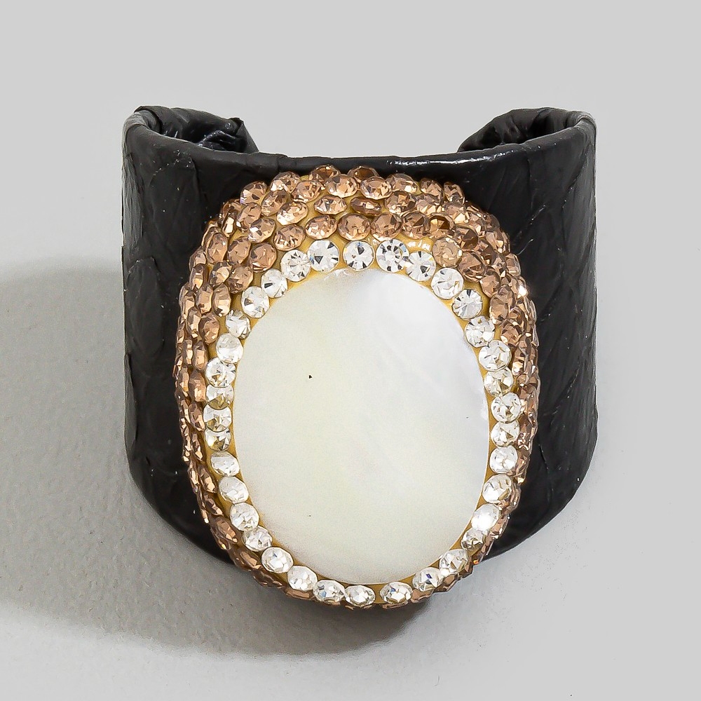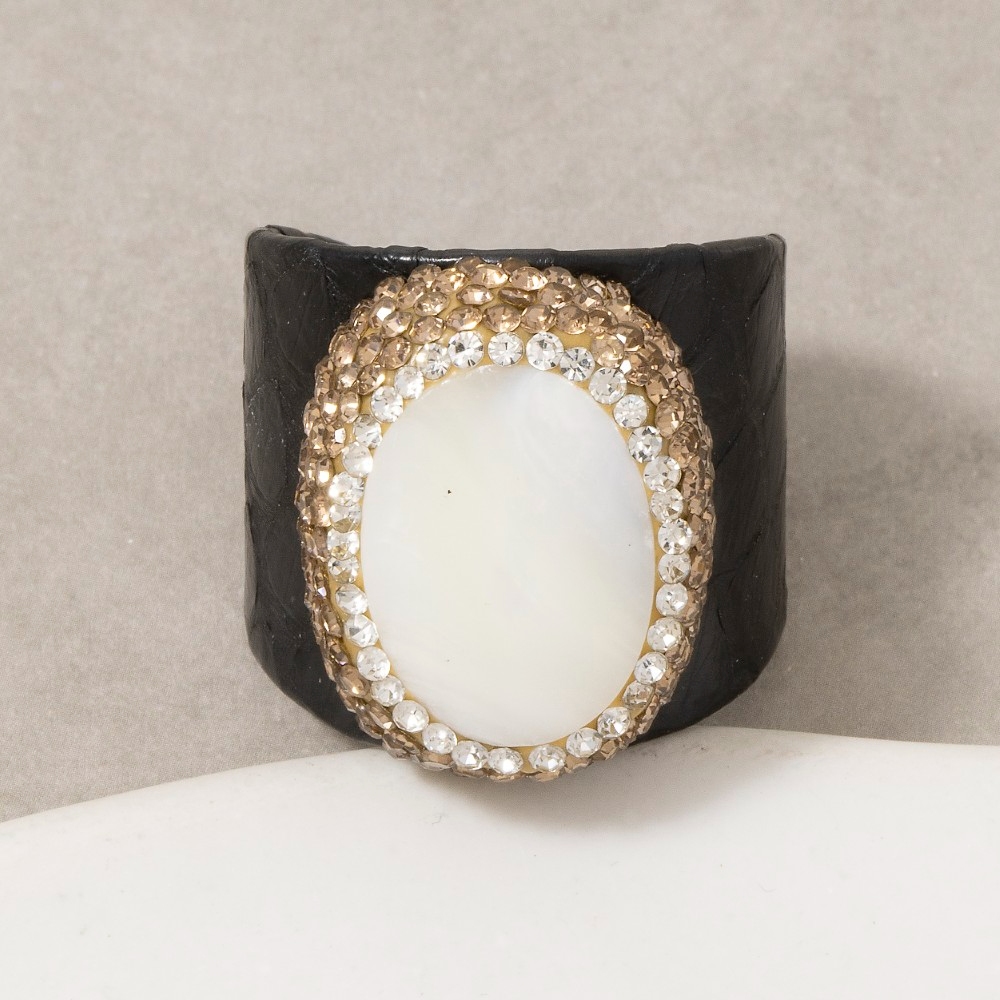 • Make a statement, this ring exudes a refined pave mother of pearl with leather band statement design. A must-have ring for anyone who loves to add some flair to their outfits. This item is sold in packs of 1.