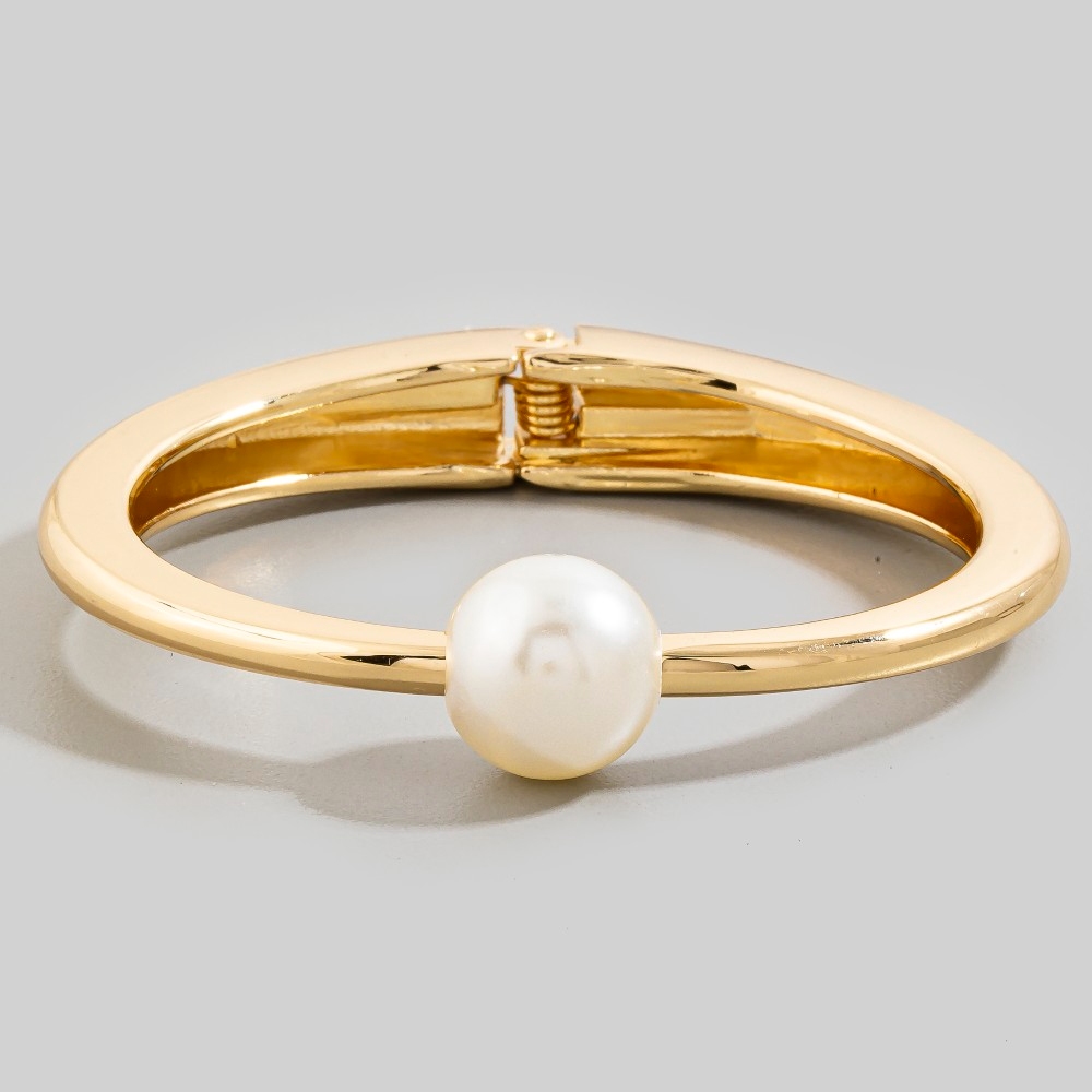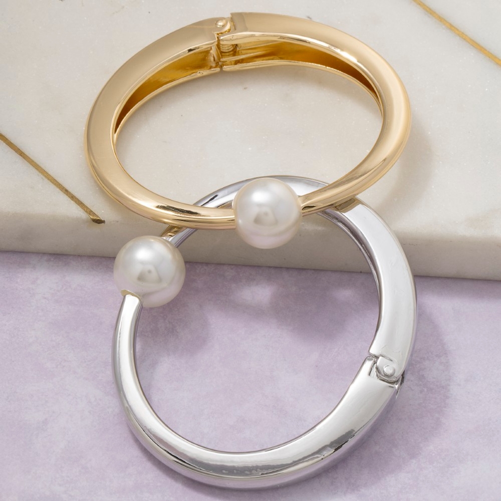 • A bold and daring choice that is sure to impress, this bangle bracelet features a distinct pearl bead thin metal hinged design. A must-have bangle bracelet that adds a unique flair to any look. Available in G, S. This item is sold in packs of 1.