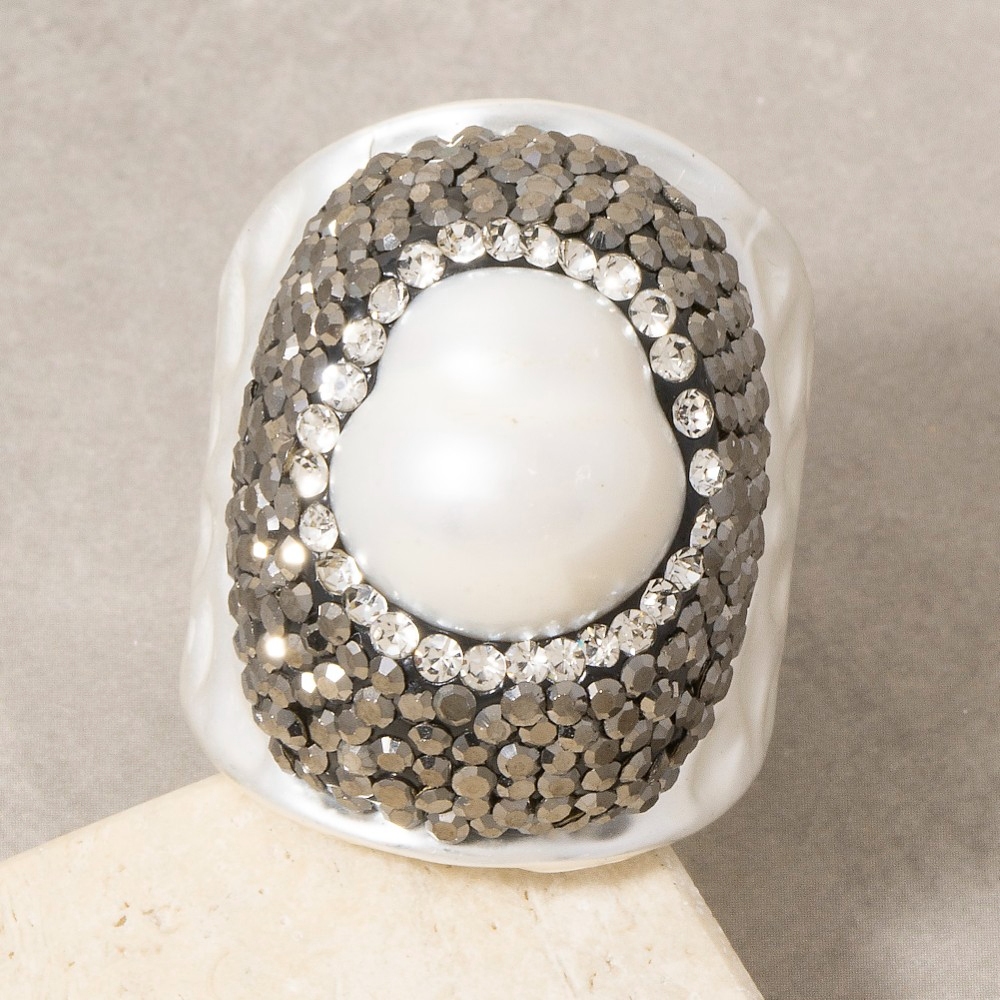 • Stay on-trend and stand out from the crowd, this ring embodies a sophisticated pearl and gunmetal crystal pave wide statement design. A must-have ring for anyone who loves to add some flair to their outfits. This item is sold in packs of 1.