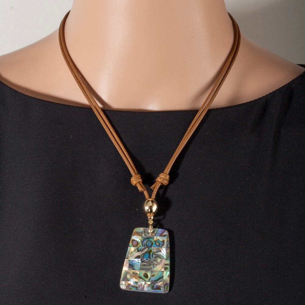 • This pendant necklace is made with 30% Polyester, 5% Acrylic, 10% Wood and 55% Shell.