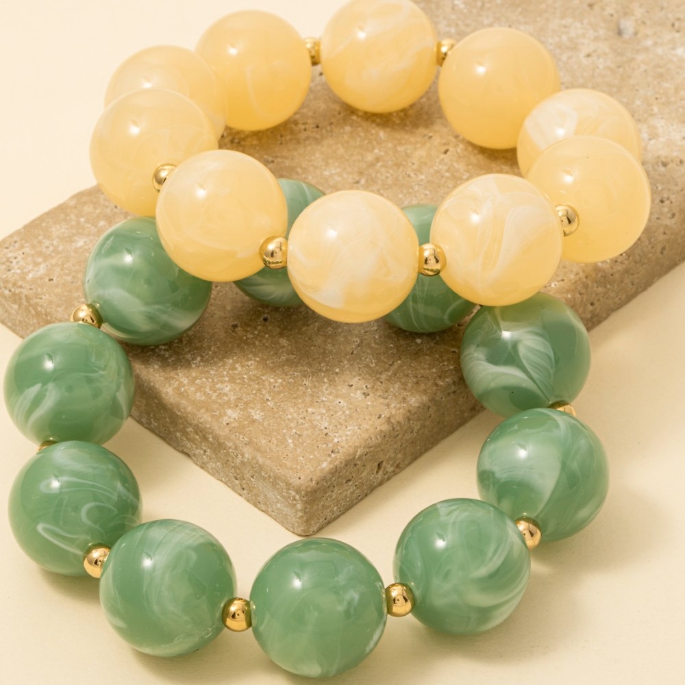 - A versatile and stylish addition to any wardrobe, this bracelet encompasses a grand large marble resin ball beads design. A versatile bracelet that's perfect for any occasion, adding a touch of elegance and style to any outfit. Available in GN, IV. This item is sold in packs of 1.