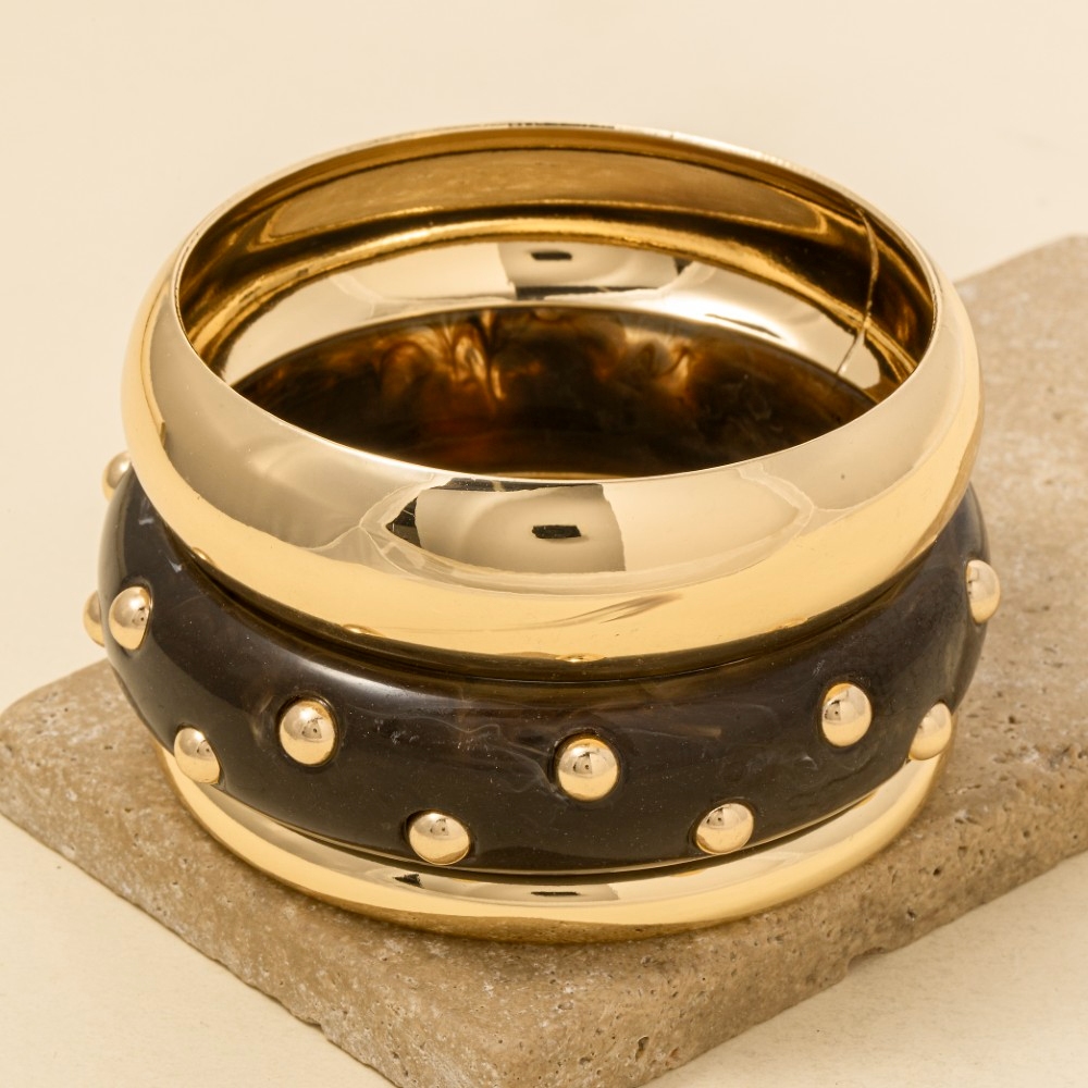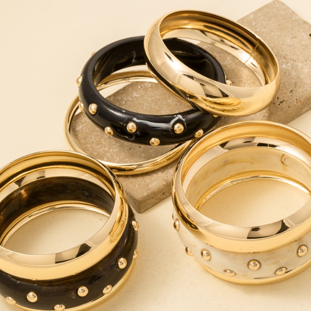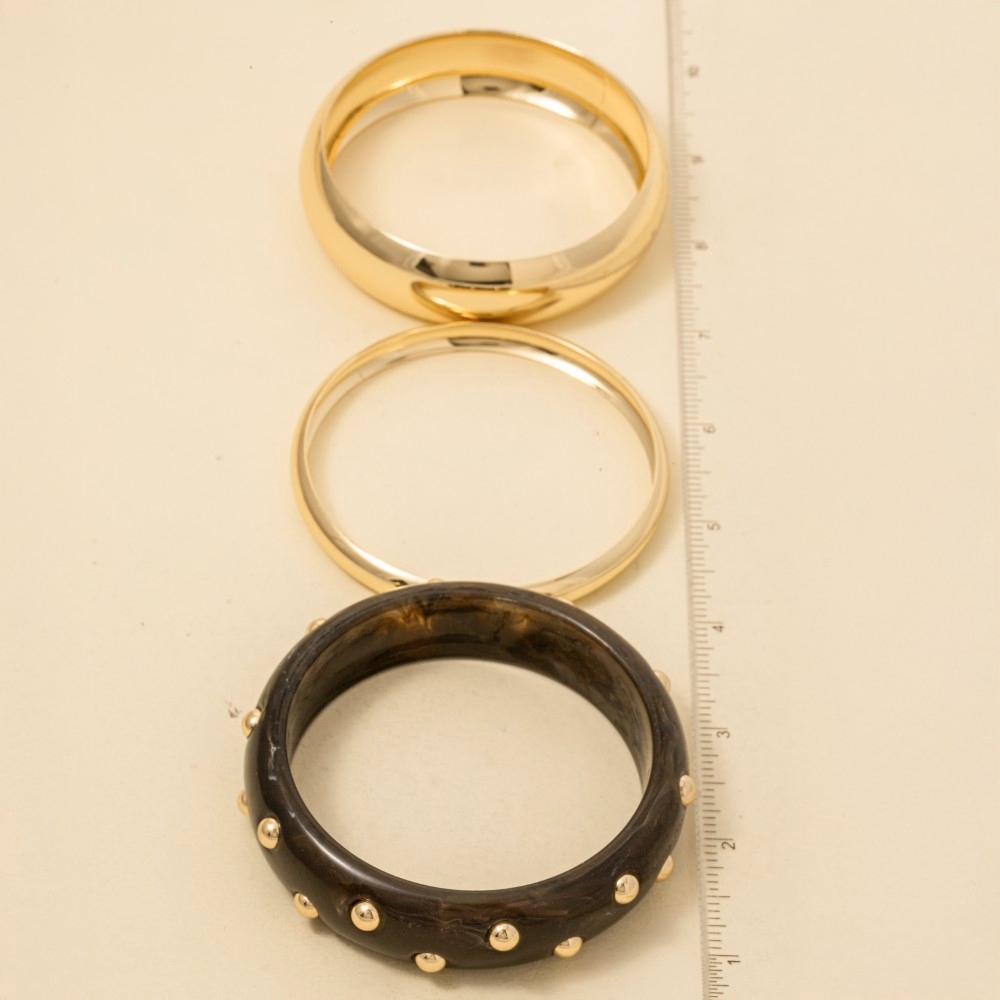 • Perfect for any fashion-forward individual, this bangle bracelet features an exceptional metallic and marble resin set design. Add a dash of sophistication to your look with this versatile bangle bracelet, a must-have for fashion enthusiasts. Available in BK, BR, IV. This item is sold in packs of 1.