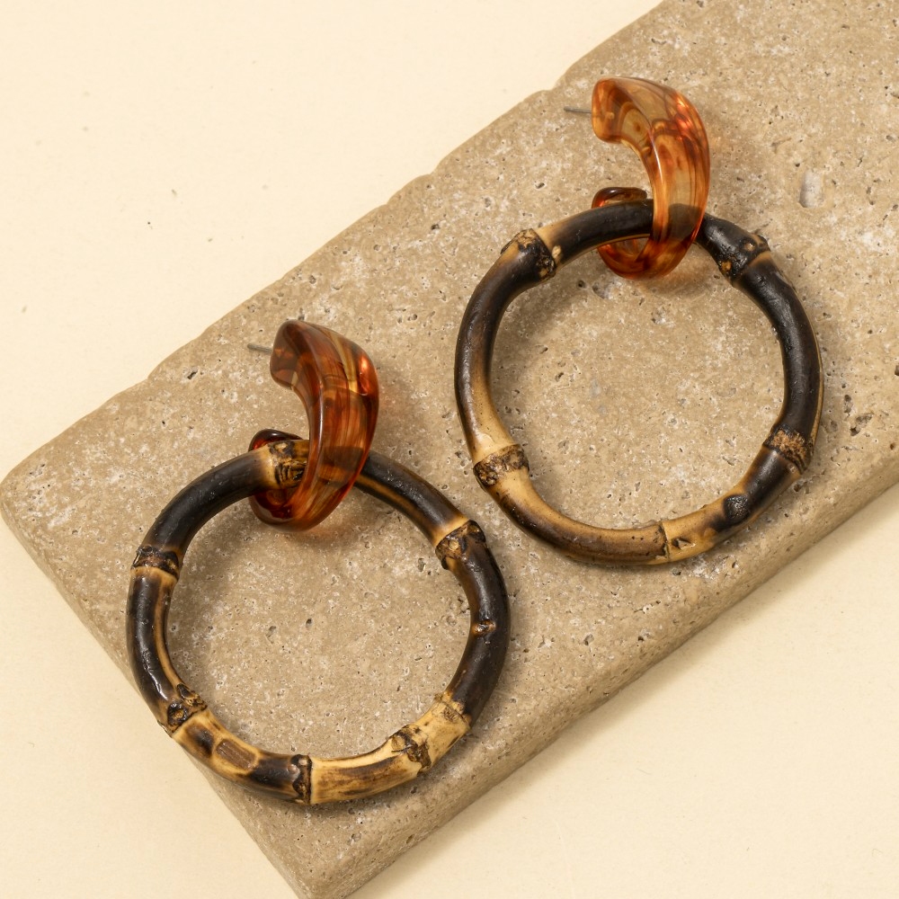 • Make a bold statement, this pair of dangle earrings comes with a special marble resin and bamboo hoop design. Perfect for any occasion, this versatile pair of dangle earrings will enhance any outfit you wear. Available in RN. This item is sold in packs of 1.