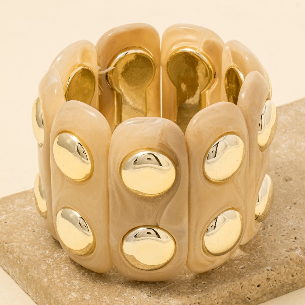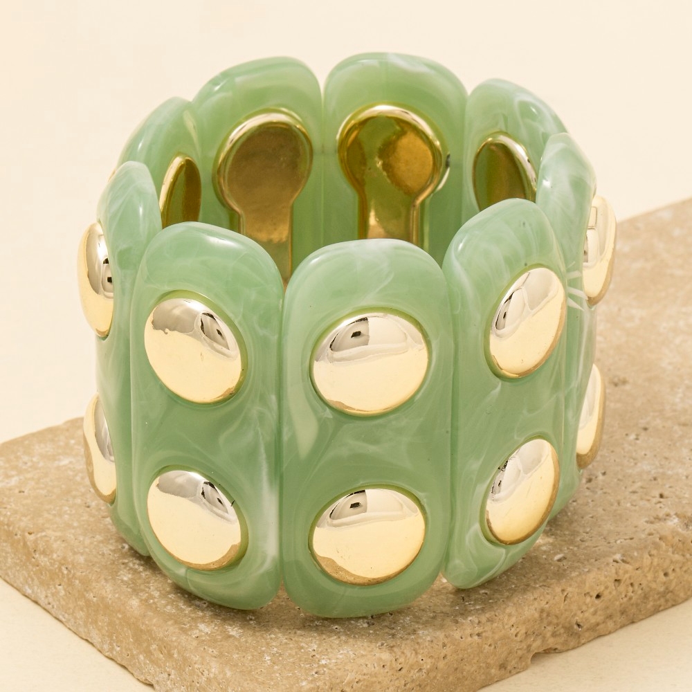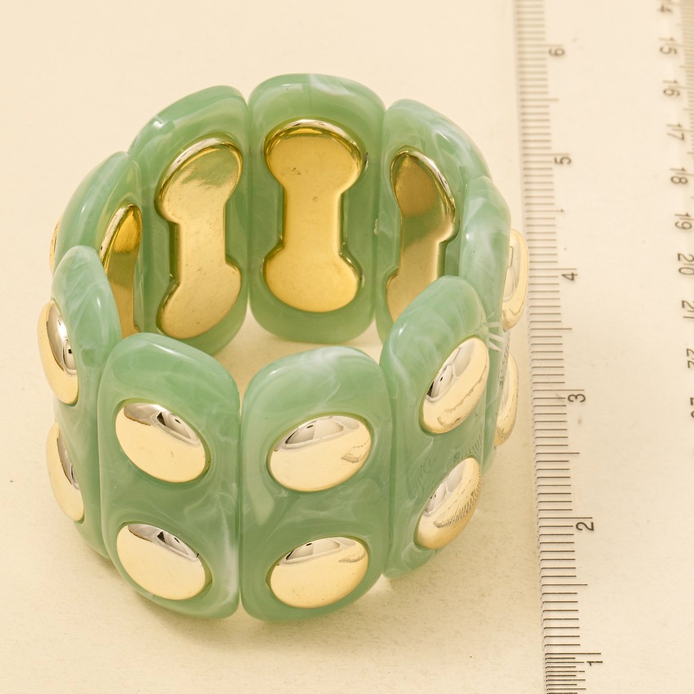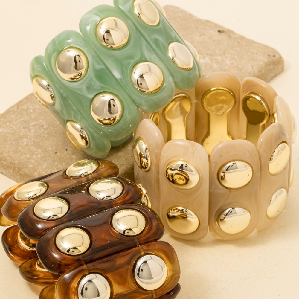• A bold and daring choice, perfect for those who want to stand out from the crowd, this bracelet reveals an intricate metallic studded marble resin bars elastic design. A stylish bracelet that's perfect for complementing any outfit you wear. Available in BR, IV, TQ. This item is sold in packs of 1.