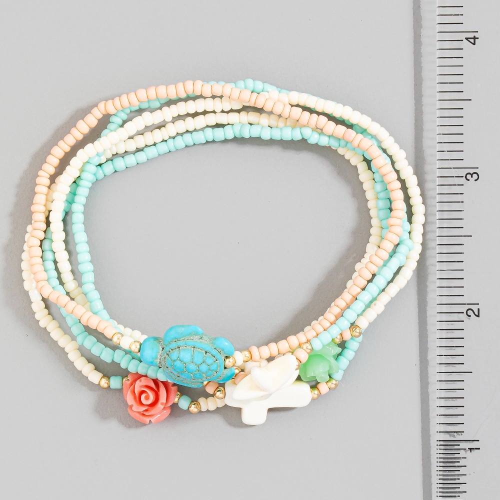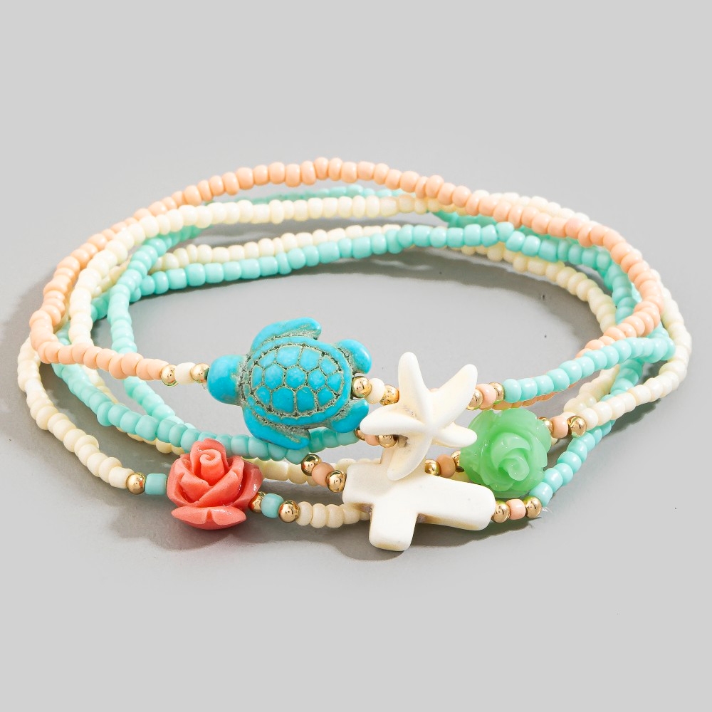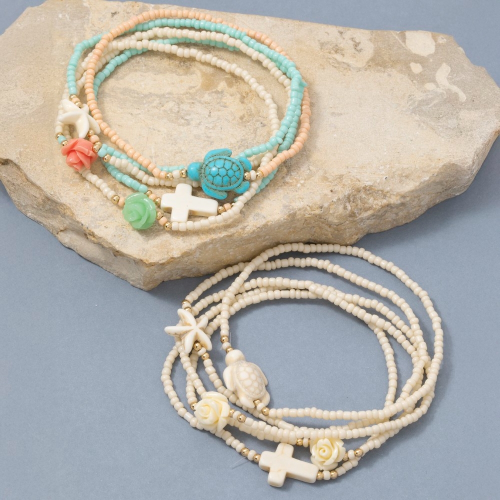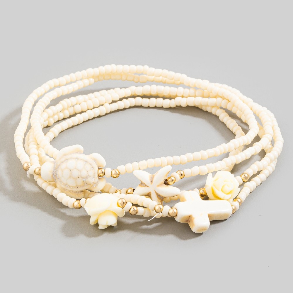 - Stay on-trend and stand out from the crowd, this bracelet features an exceptional cross and sea life charms mixed beaded set design. A must-have bracelet that effortlessly enhances your style, no matter the occasion. Available in LMUL, NAT. This item is sold in packs of 1.