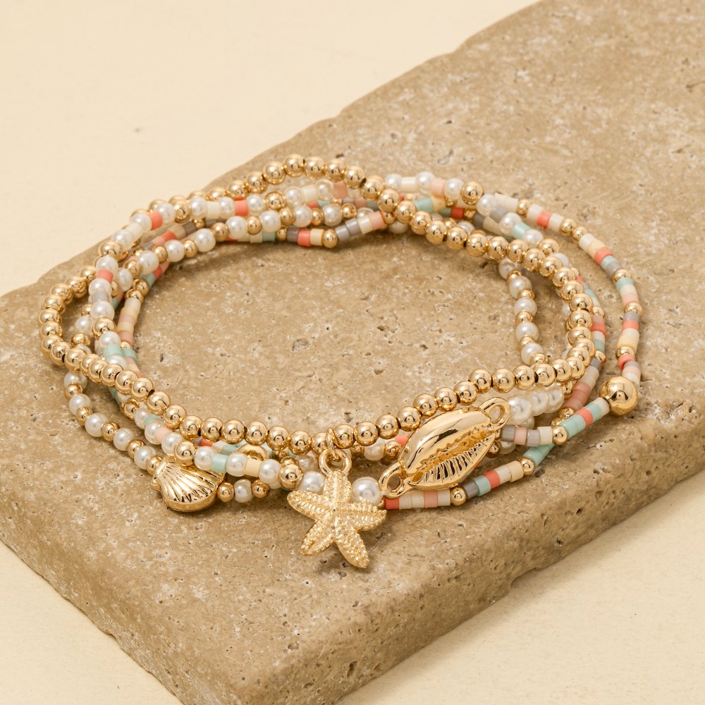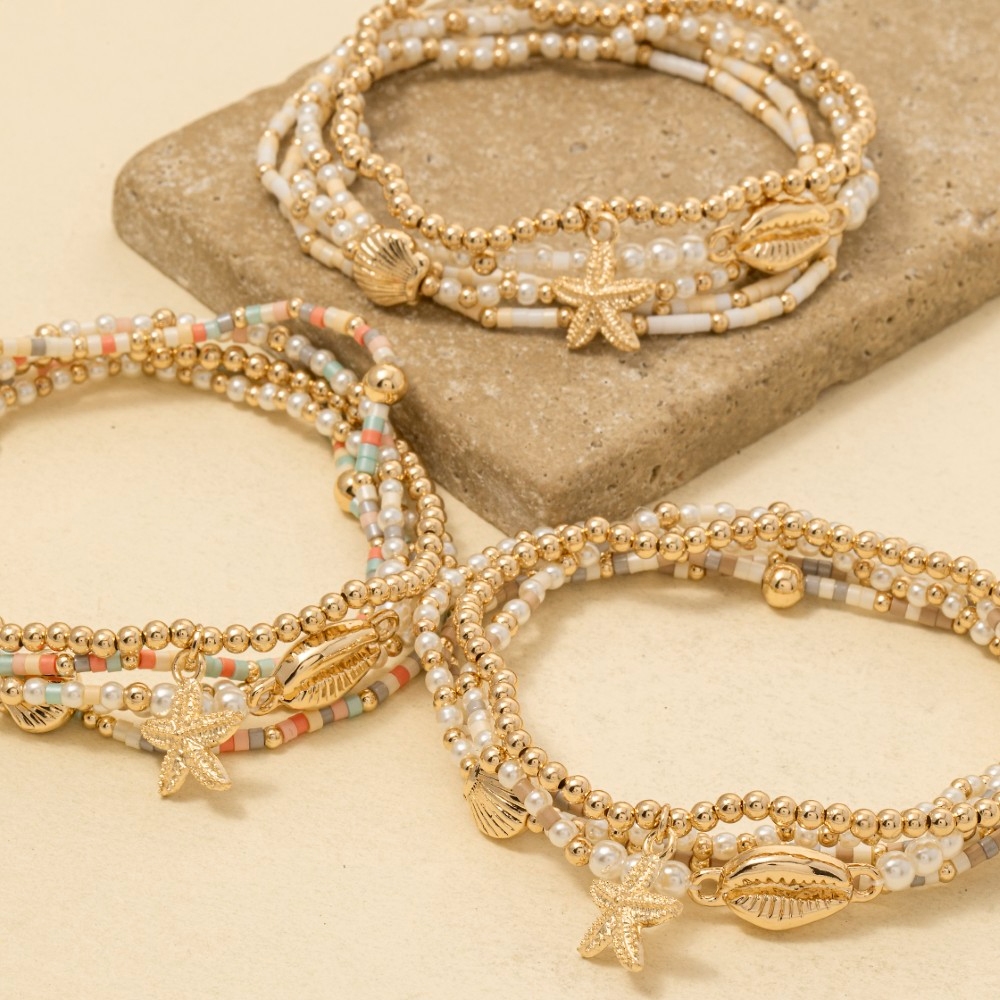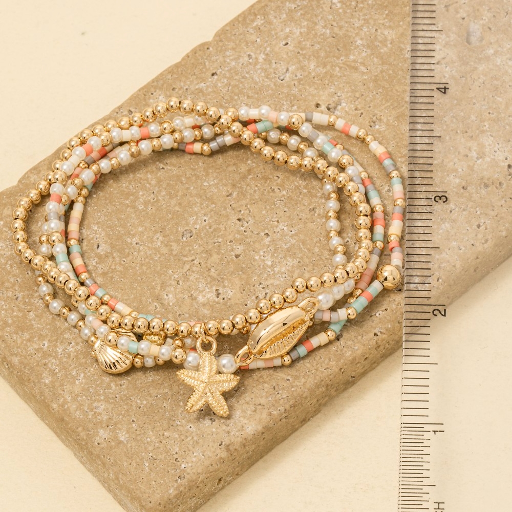 Shell Charms Faceted And Metallic Beaded Bracelet Set
