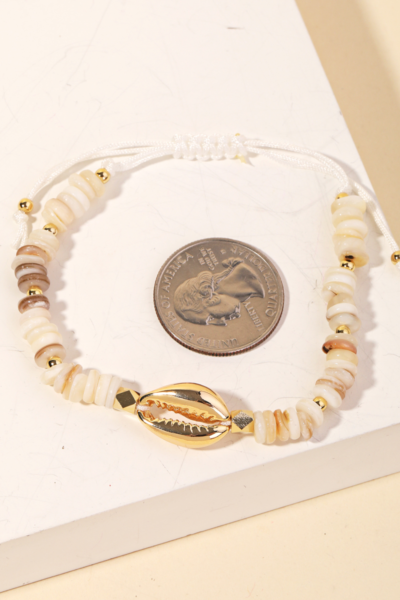 - This piece is perfect for those who want to showcase their unique style, this bracelet adds a distinctive cowrie shell beaded adjustable bracelet design. This versatile accessory adds a touch of elegance to any outfit. Available in WHG1. This item is sold in packs of 1.