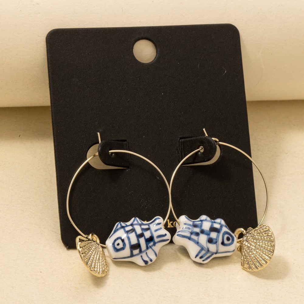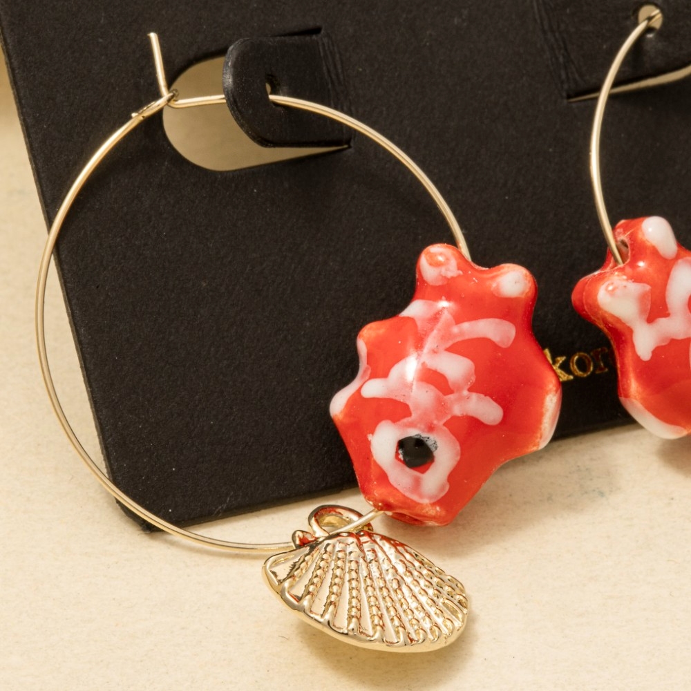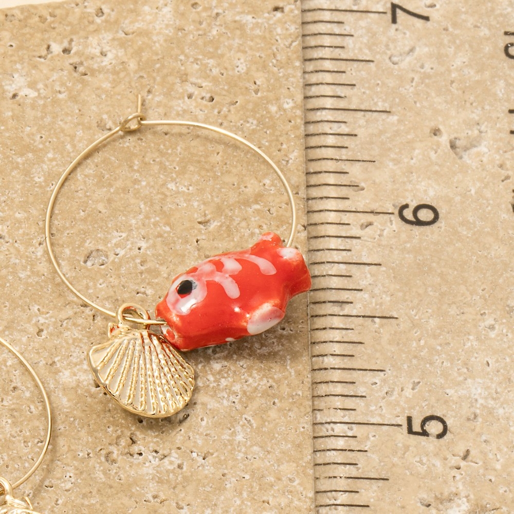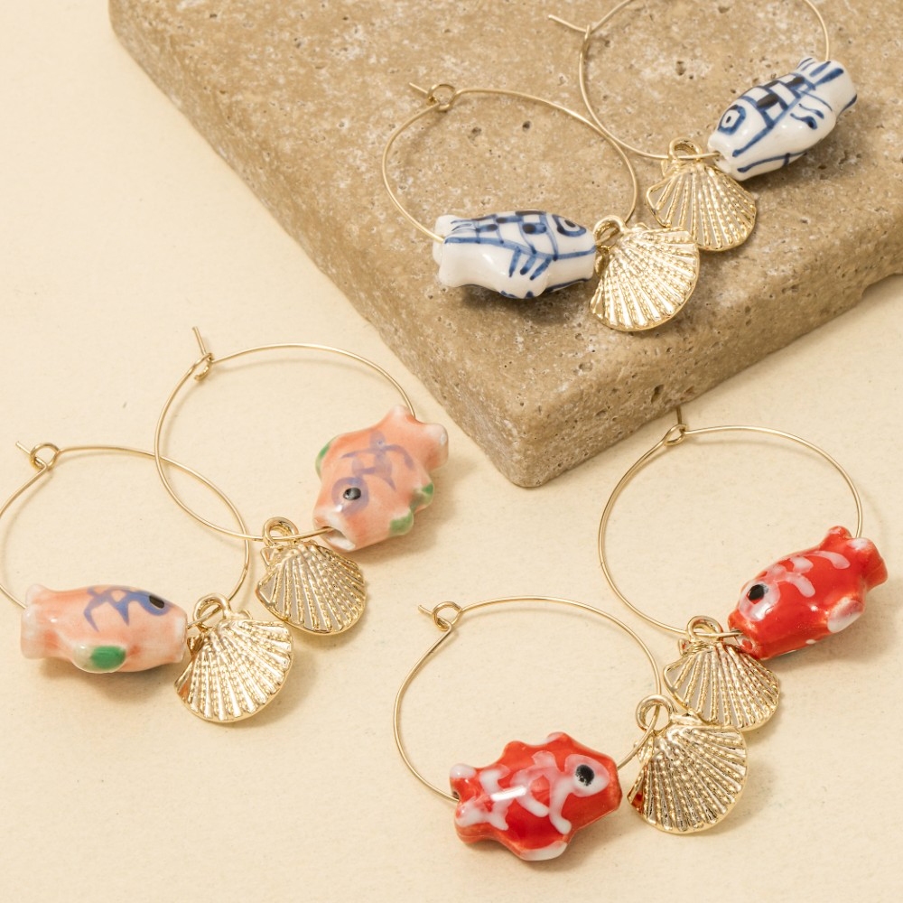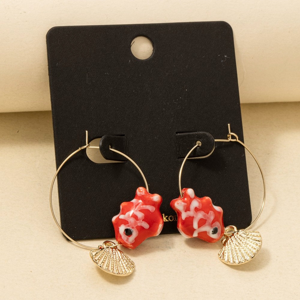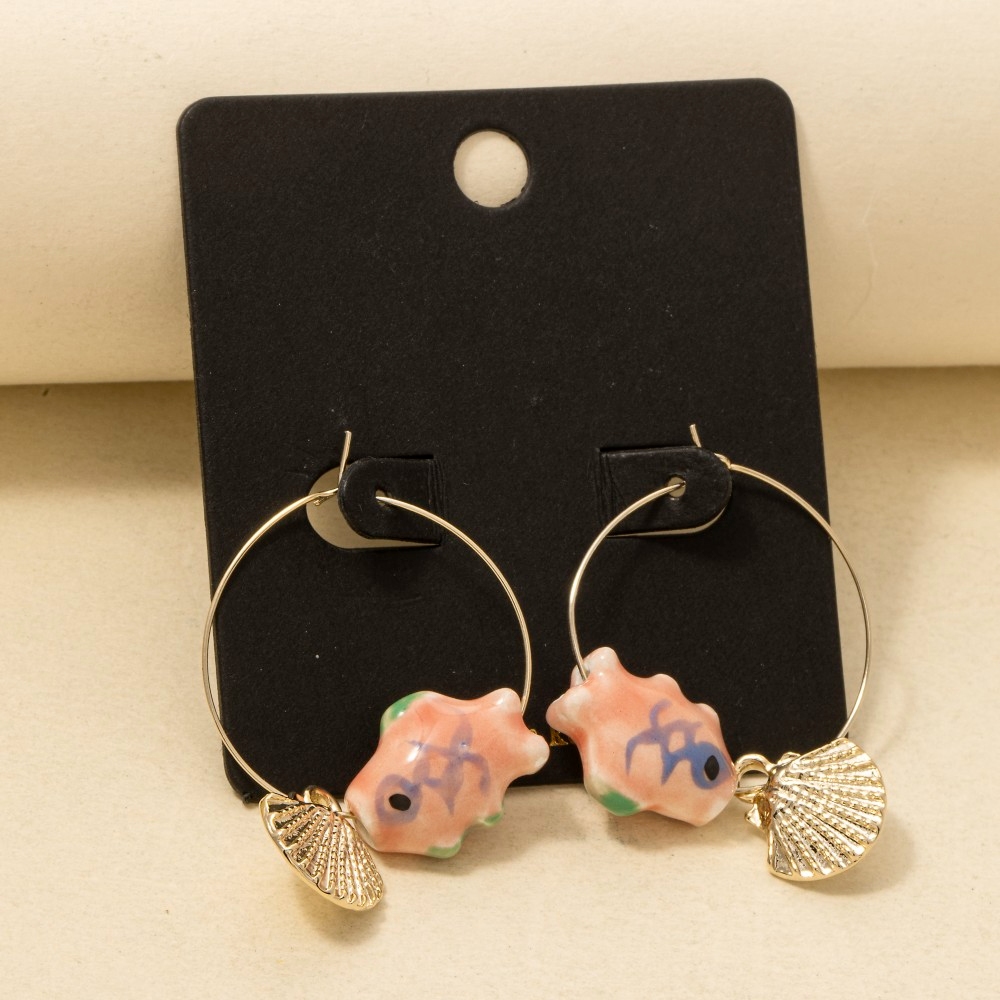 • This piece is designed to make a statement, this pair of hoop earrings highlights a special seashell fish design. A must-have pair of hoop earrings that effortlessly enhances your style, no matter the occasion. Available in PK, RD, WH. This item is sold in packs of 1.