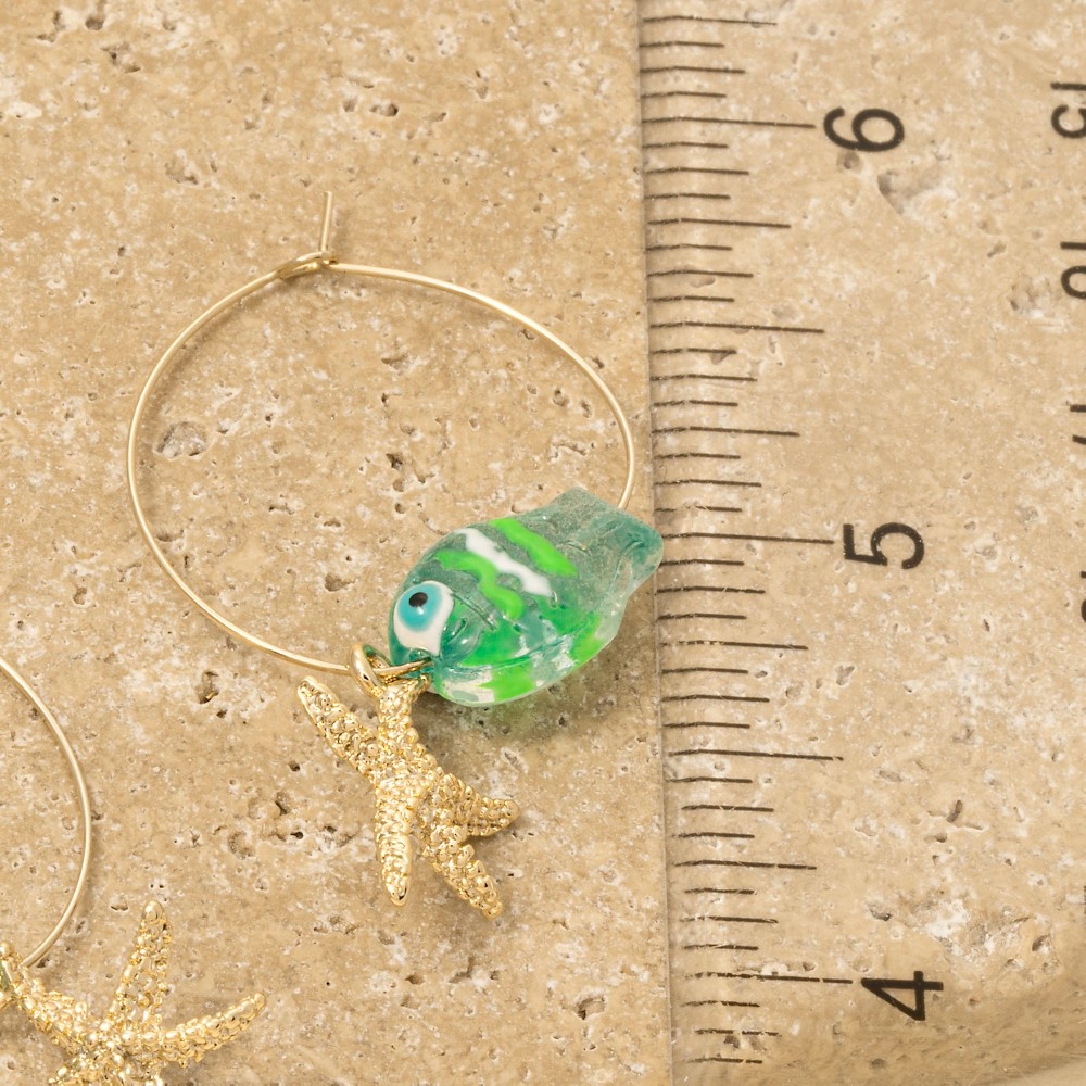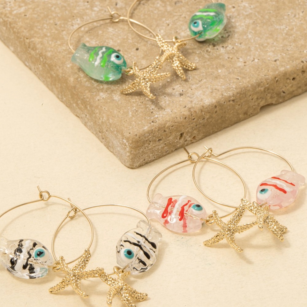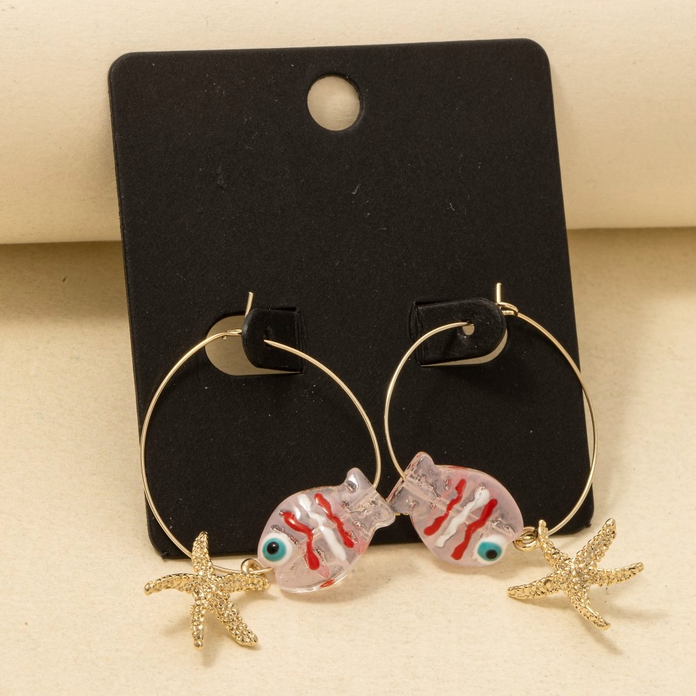 • A versatile and stylish addition to any wardrobe, this pair of hoop earrings features a distinct starfish clear fish design. A stylish pair of hoop earrings that's perfect for complementing any outfit you wear. Available in CL, MI, PK. This item is sold in packs of 1.