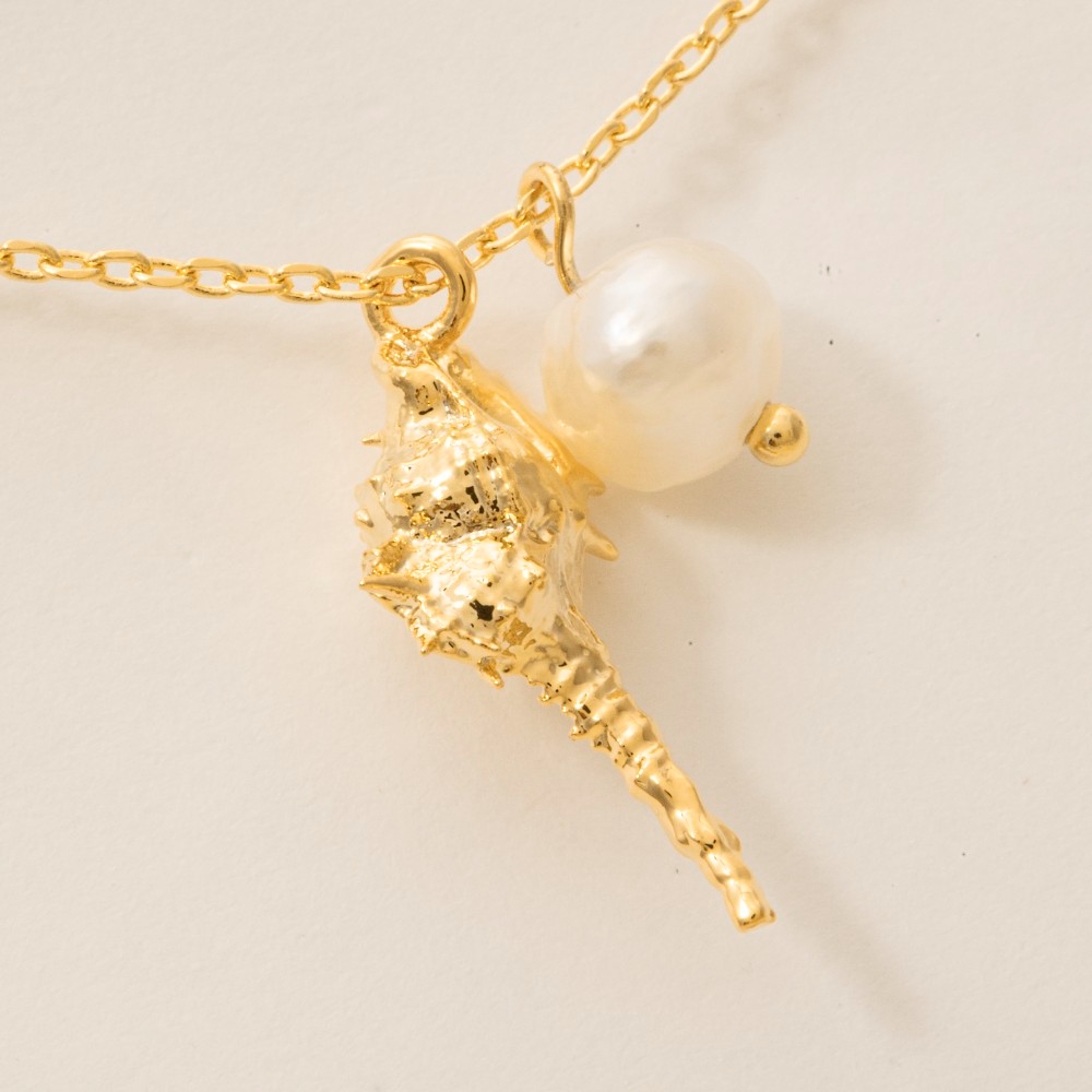Gold Dipped Clam Sea Shell Pendant Pearl Beaded Necklace