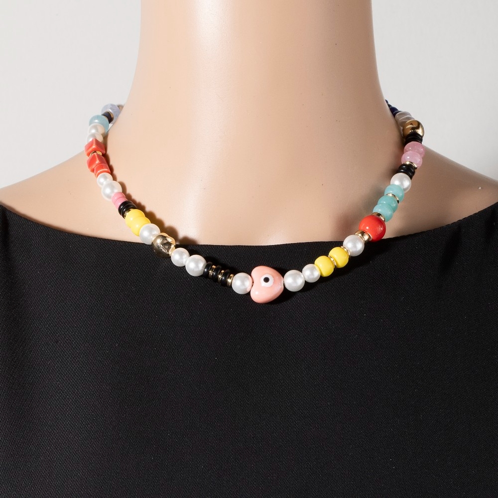 This necklace is made with 40% Acrylic 30% Glass 20% Ceramic 10% Metal.