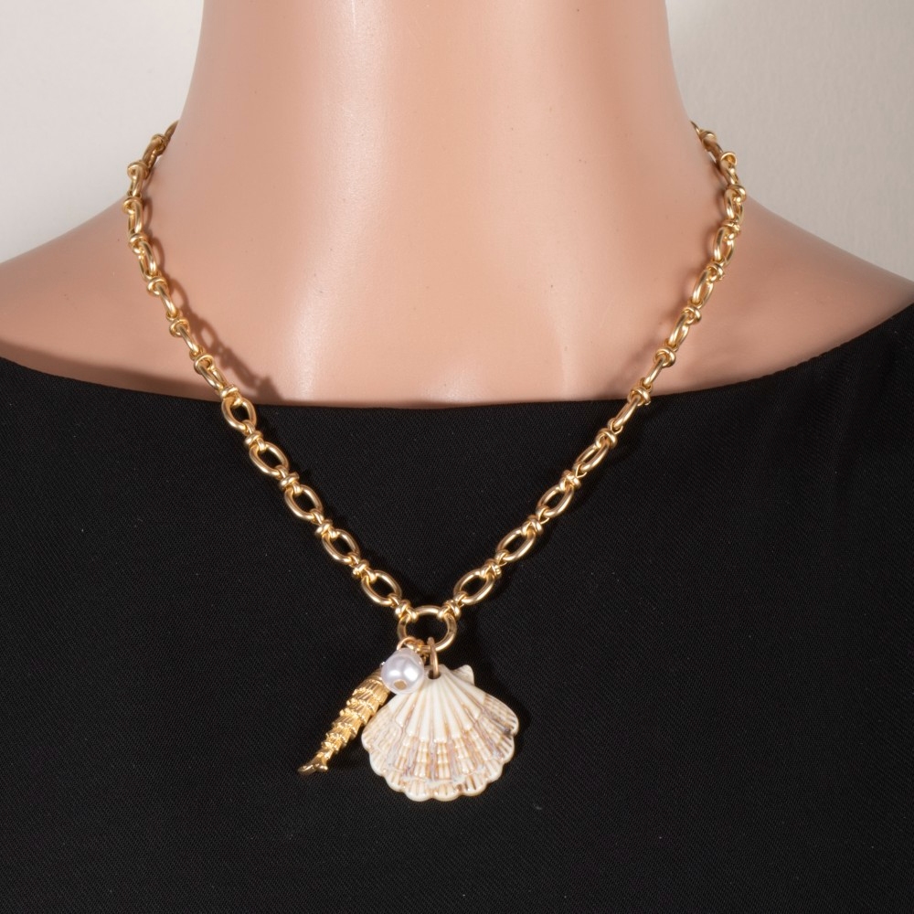 Gold Dipped Clam Sea Shell Pendant Pearl Beaded Necklace