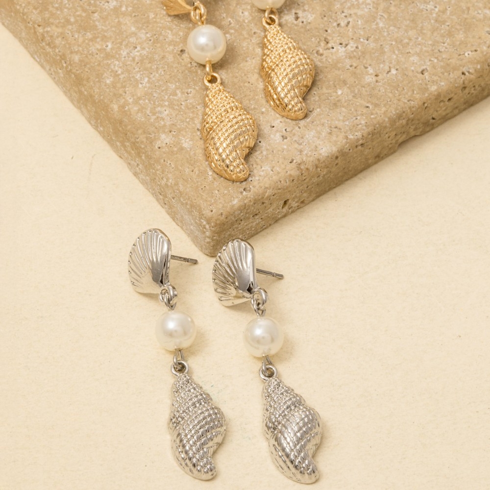 - Make a statement, this pair of dangle earrings shows off a distinctive pearl clam and conch shell design. Perfect for adding some texture and dimension to any outfit, this pair of dangle earrings is a must-have. Available in GD, RD. This item is sold in packs of 1.